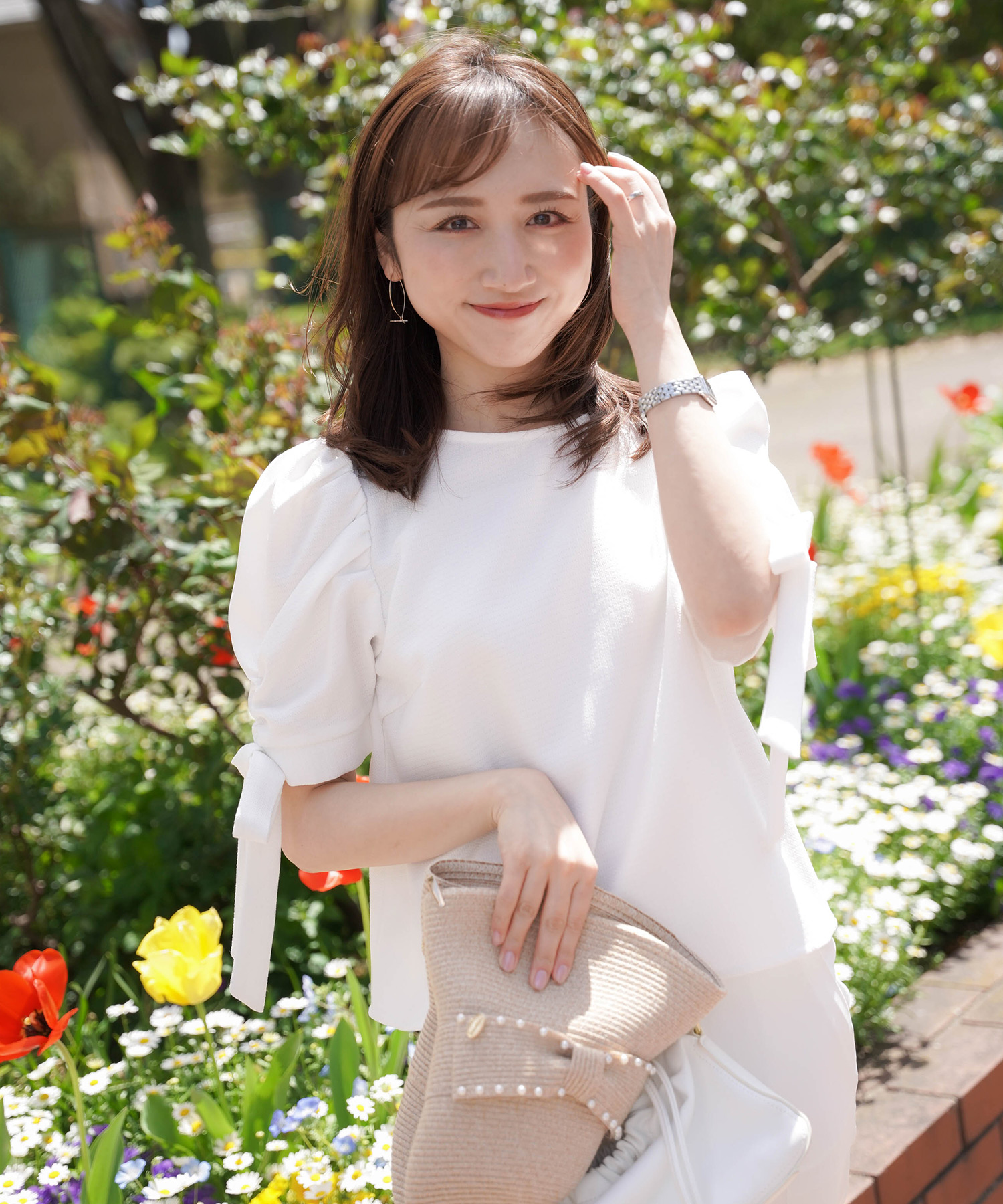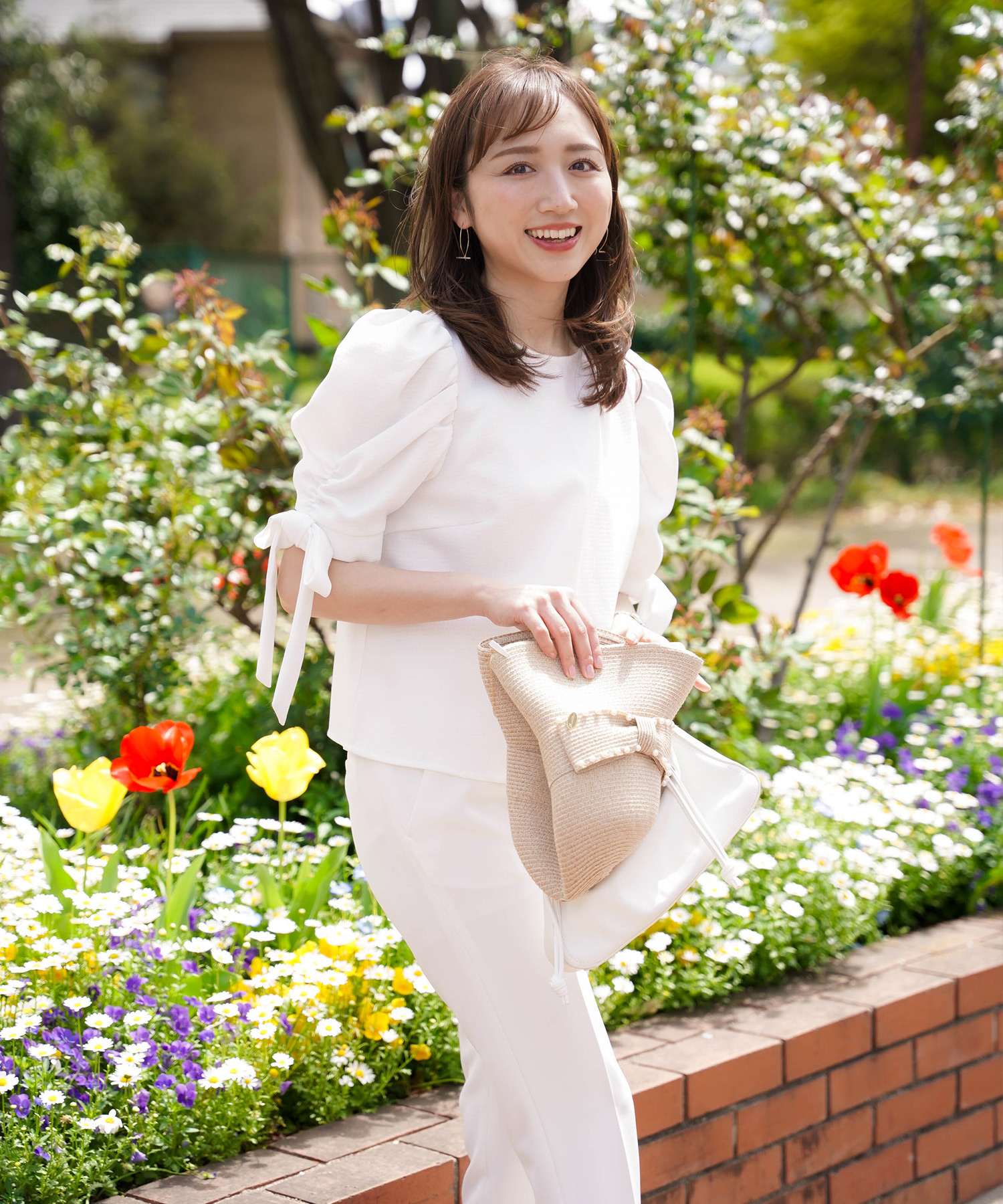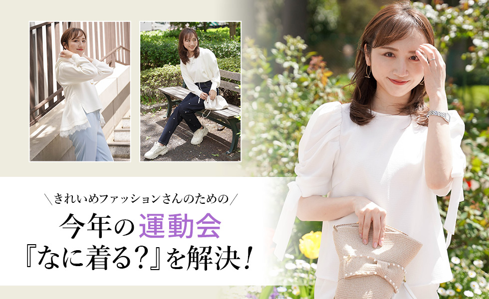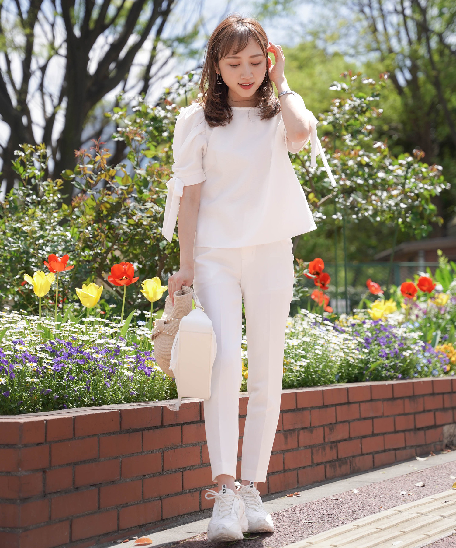 親子競技はパパに任せ、ママは応援席で完全待機の日は、汚れを気にせず涼感たっぷりのオールホワイトの着こなしを楽しんで。 折りたためる日よけのストローハットを片手に、紫外線対策も抜かりなく!