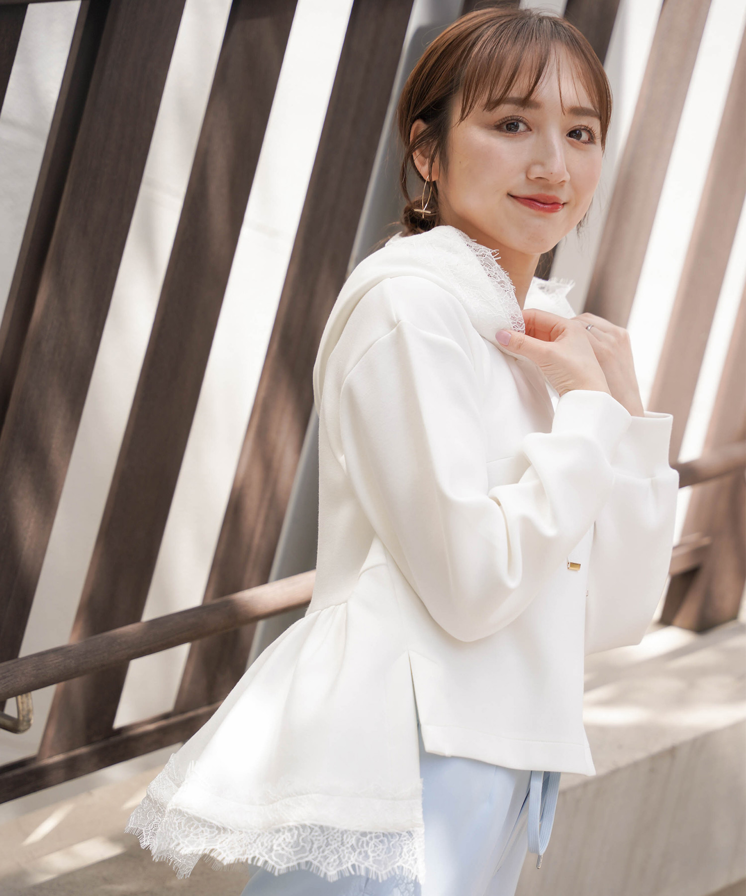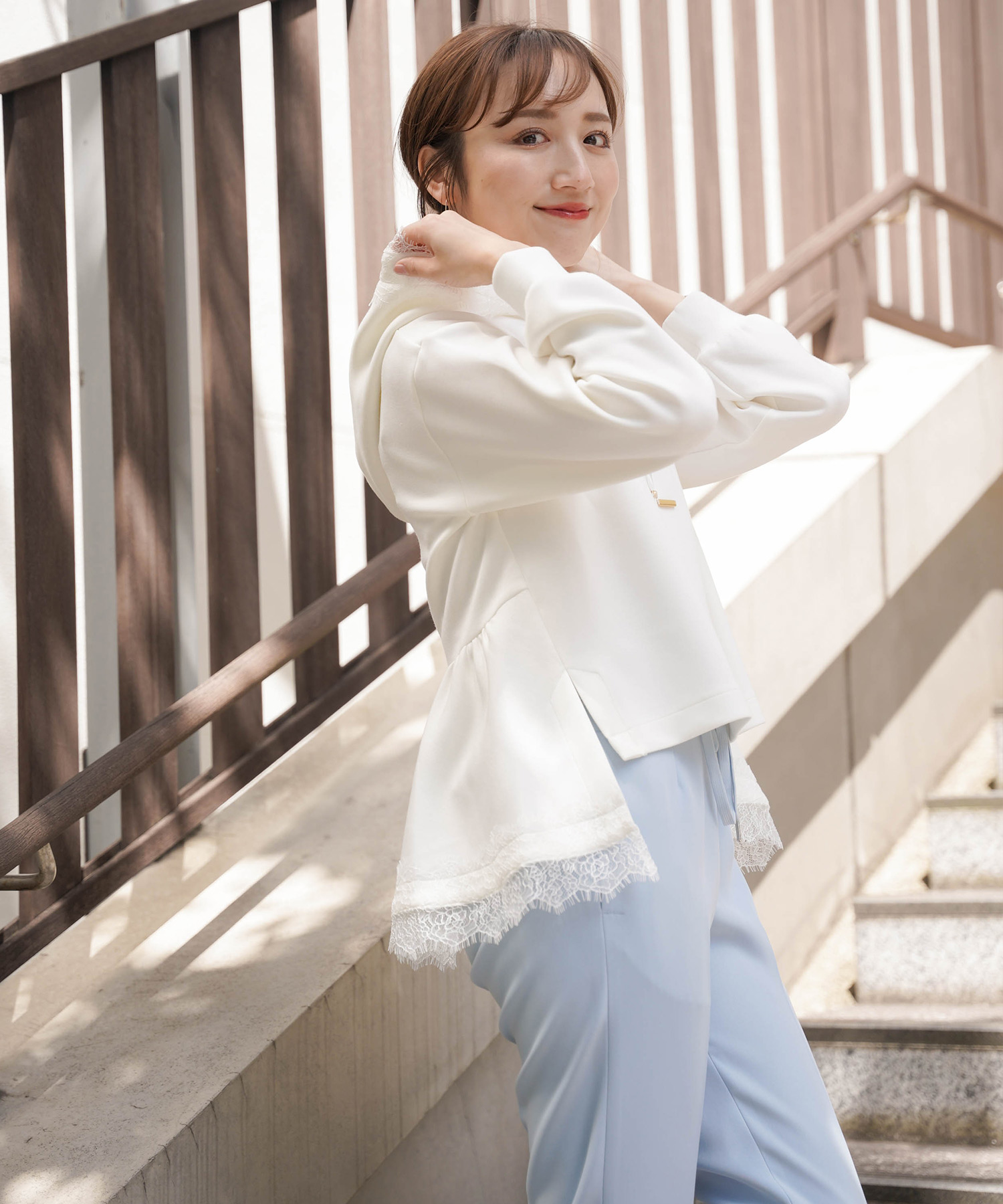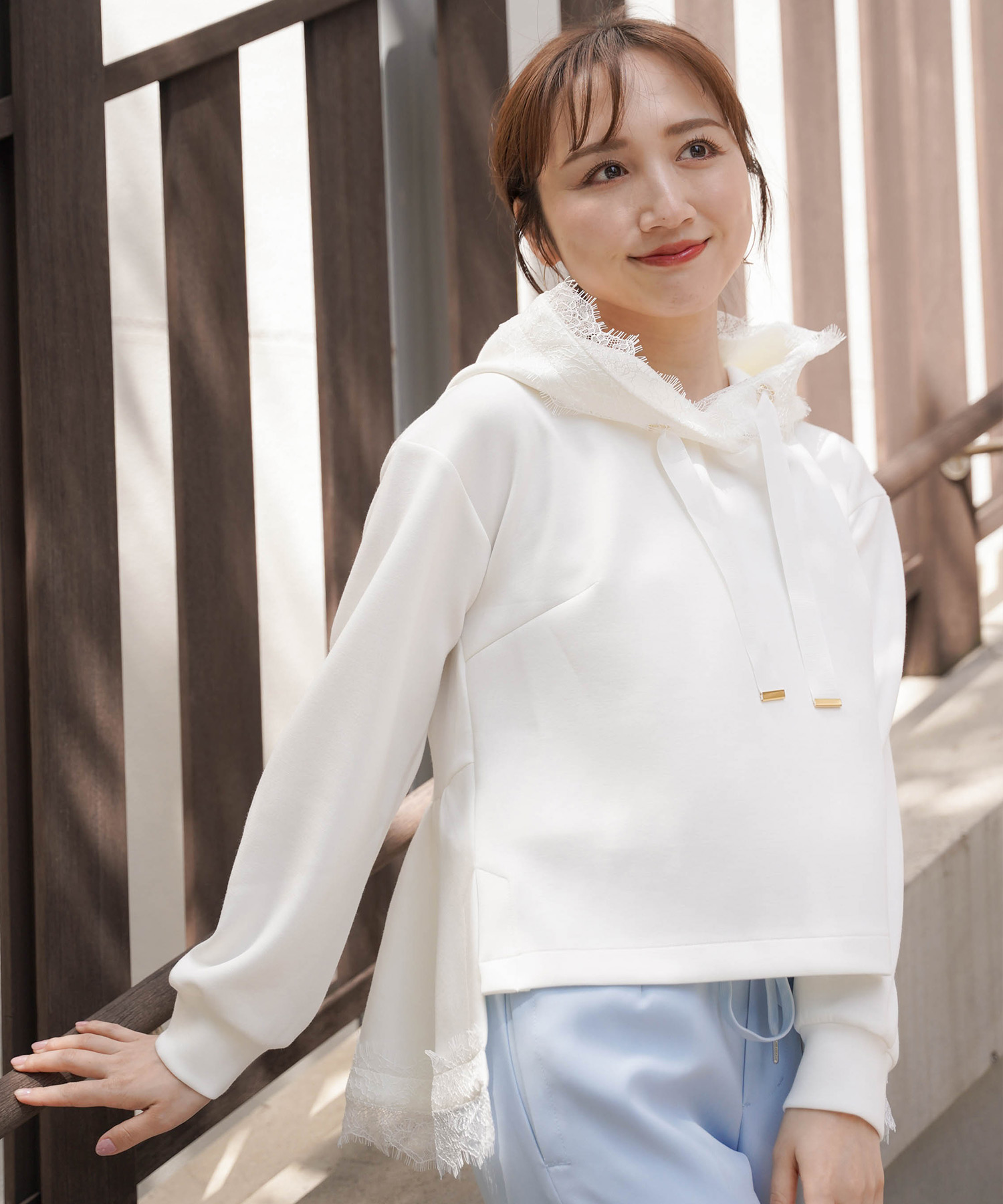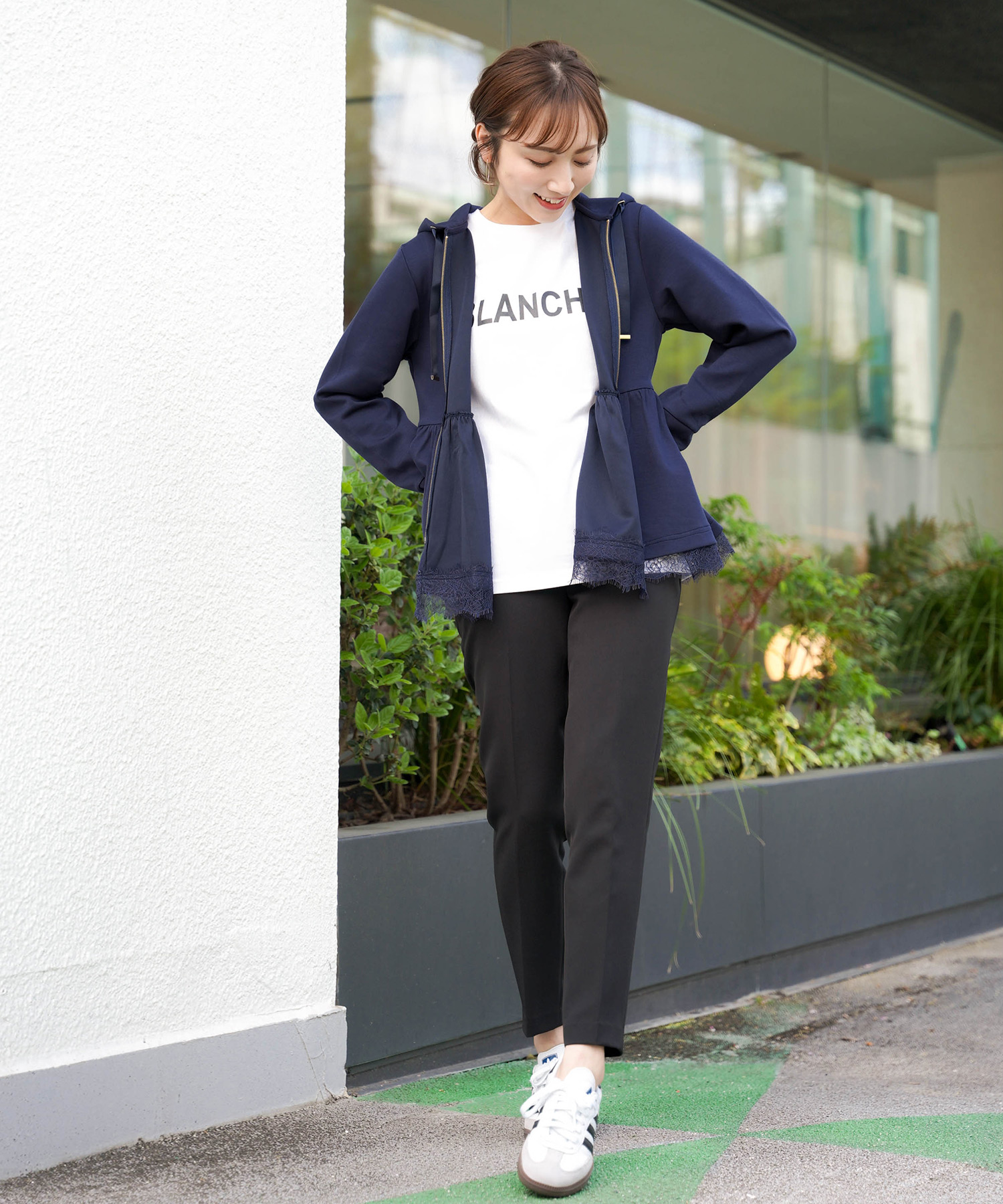 ヒップまわりが気になるパンツスタイル。 着丈に前後差をつけたフーディなら、着るだけでヒップを隠しお悩みをカバー。 ボトムスはパステルカラーを選んで女性らしさを底上げして。