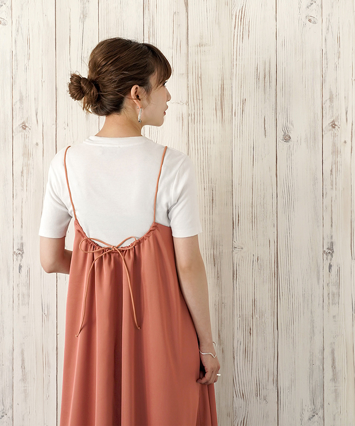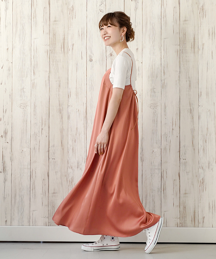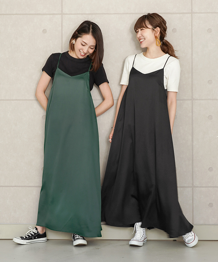 インナー次第でオールシーズン着られるサテン地のキャミワンピース。