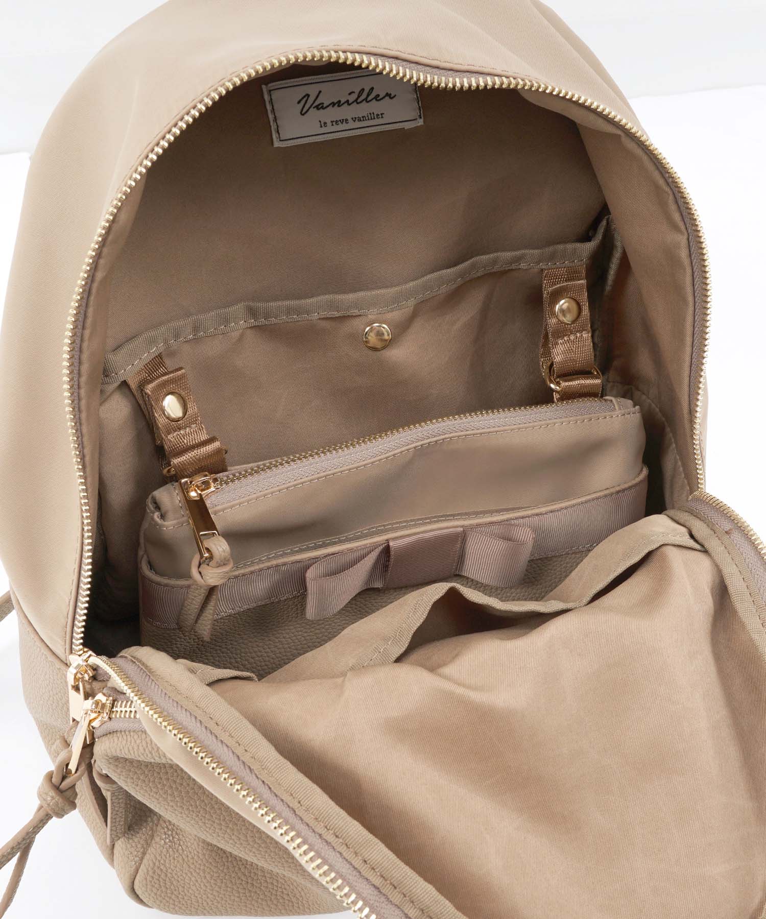 マザーズバッグとしても活躍するポシェット付きのリュック。