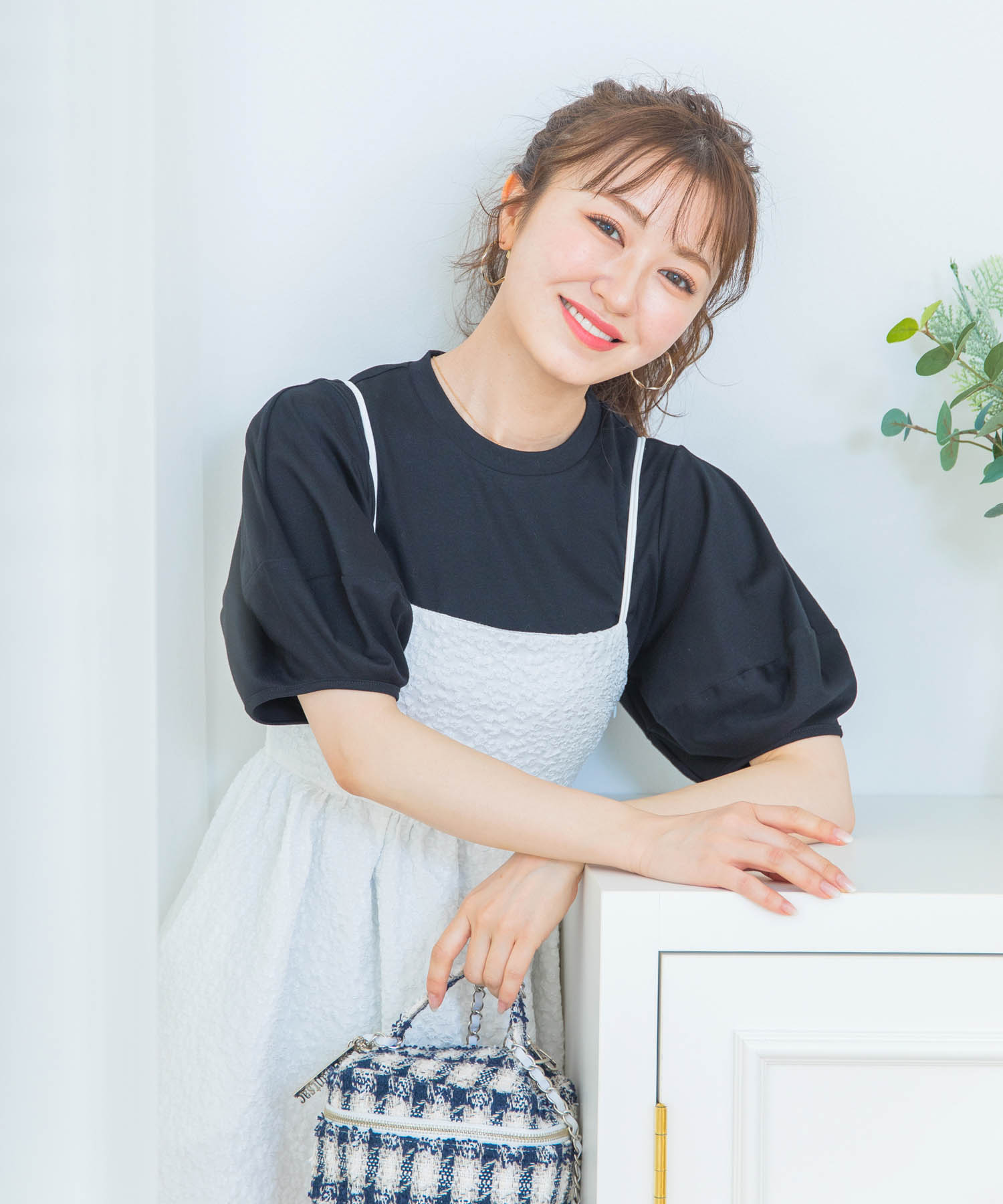 ぽこぽことした凹凸感のある生地とハリ感のある素材を活かしたバルーンスリーブの半袖ミニワンピースドレスはとても華やかな印象に。