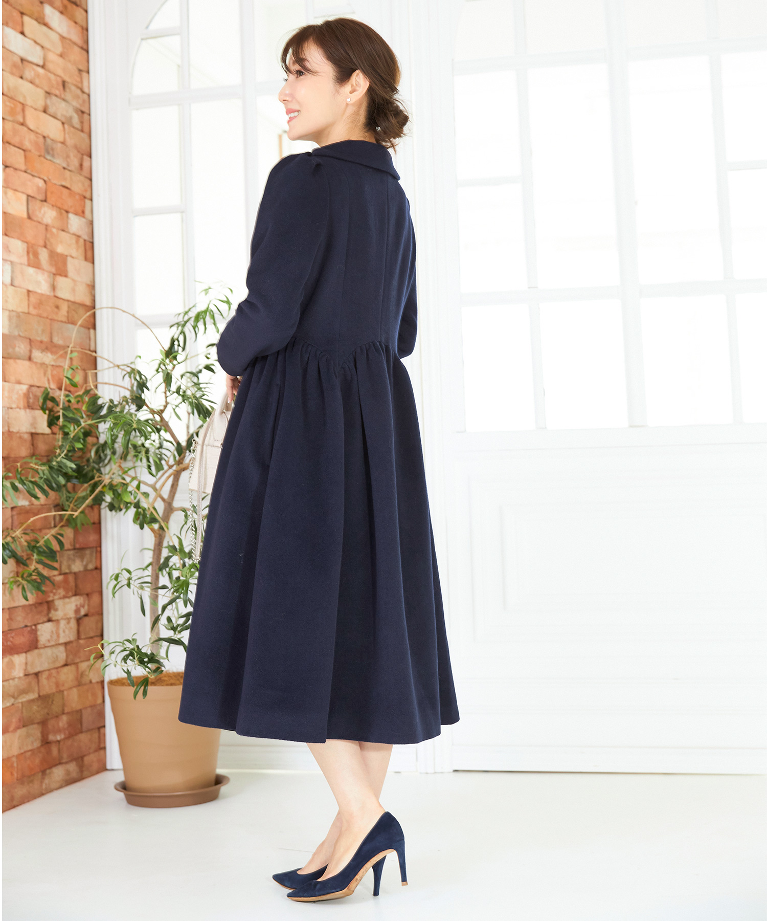 肩先に入ったタックから袖口に向かってシェイプしたほんのりパフスリーブのコート。少し開いた衿ぐりに、第一ボタンのみくるみボタン以外は比翼仕立てでデザイン性が高くてもスッキリとした印象に。ネイビーはお受験、行事などの寒い時期のオケージョンにもおすすめです。