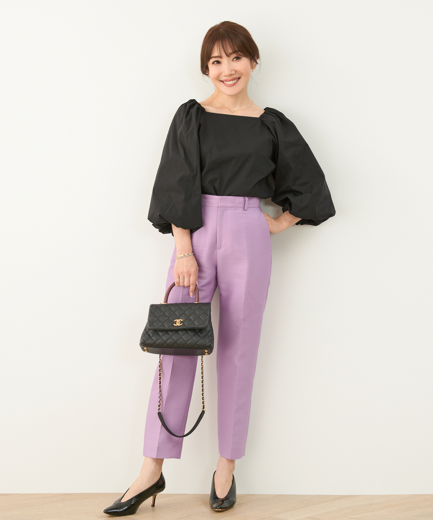 顔周りが詰まりすぎないようにスクエアネックですっきり見せ、細身のパンツに裾をイン。そうすると袖のボリューム以外がコンパクトにまとまってバランスが良くなります◎