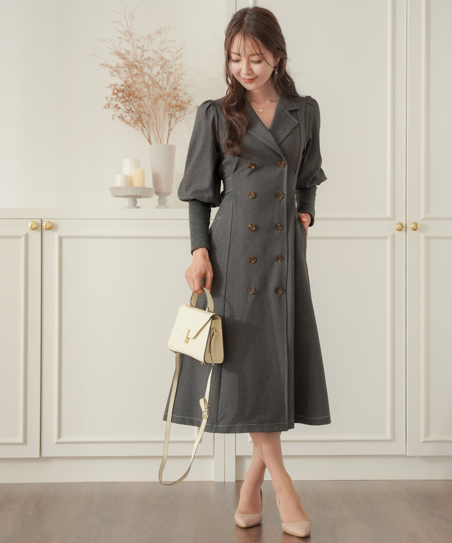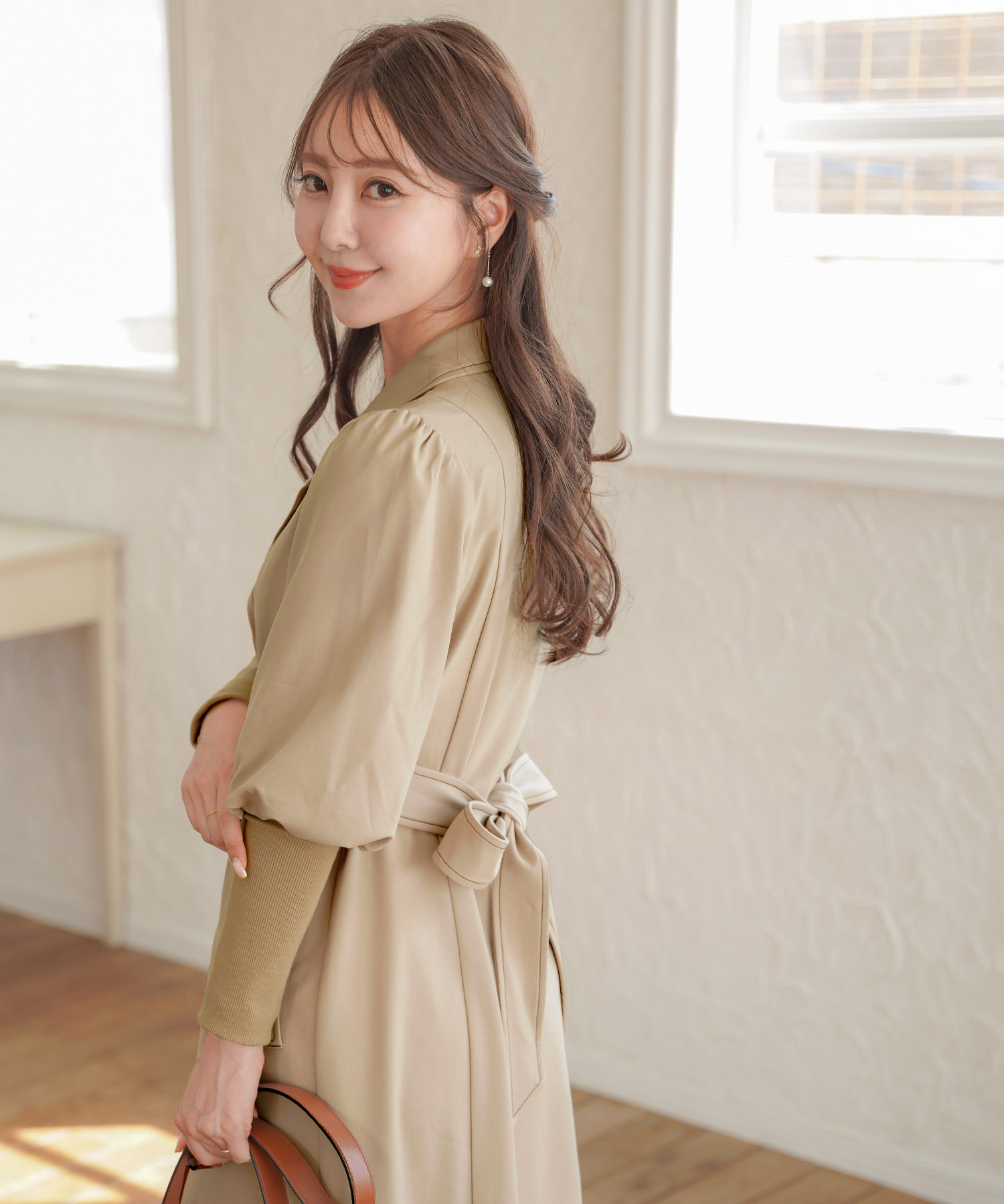 袖口の長いリブが特徴的なワンピース兼トレンチ風コートはウエストシェイプデザインで体にフィットすることでパフの膨らみが際立ちます。薄手のインナーならアウターとしても着用可能◎