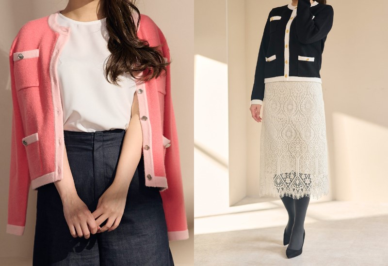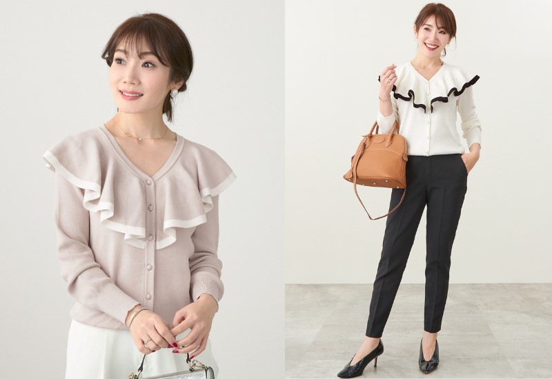 襟やカフスに配色が入ったブラウスや、縁取りのあるカーディガンなどがおすすめです。ベーシックカラーにさりげなく差し色を加えると、失敗なく楽しめます。