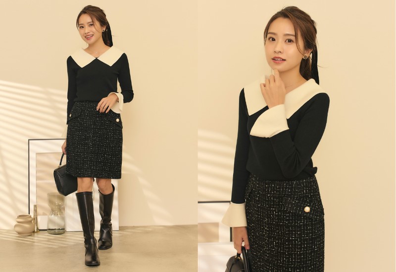 デートの日はバイカラーでちょっとクラシカルに攻めるのもあり♡ Vネックで首元を適度に開けることで顔の輪郭もすっきりと。レフ板効果で顔色を明るく見せてくれるビッグ襟にも注目です♪