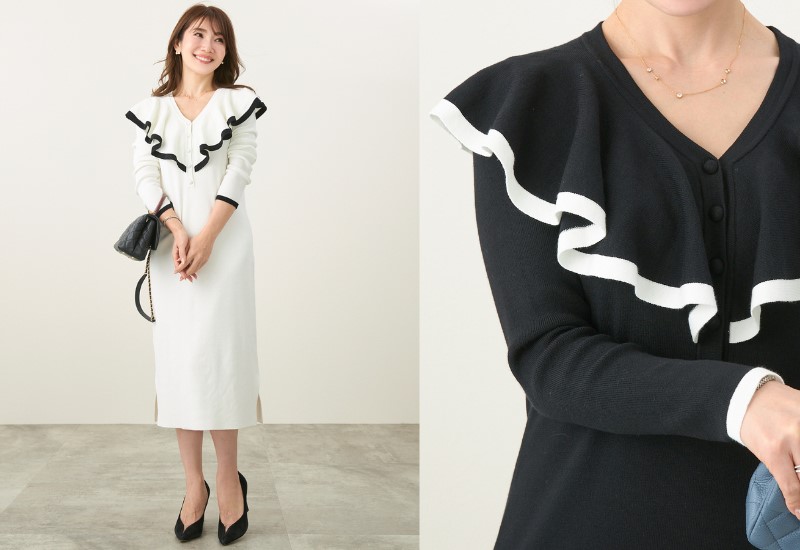 人気のラッフル襟にバイカラーをあしらったお目立ち度120%の映えワンピース。Iラインの縦長シルエットでかわいらしすぎず、大人っぽく着こなすことができます。さらに首元はVネック仕様になっているので鎖骨を見せて女っぽさを後押し!