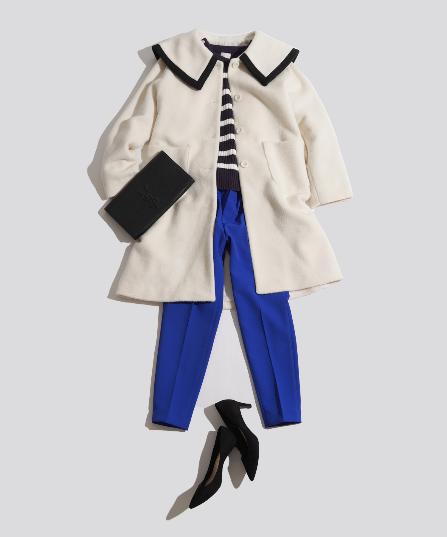 インナーだけでなくアウターもバイカラーデザインに注目。カジュアルなボーダーニットと組み合わせても品よく決まり、休日コーデを洗練させます。さらに、差し色にキレのあるブルーパンツを投入すればこなれ感もアップ! 大人のカジュアルコーデに1枚あると便利なアイテムです。
