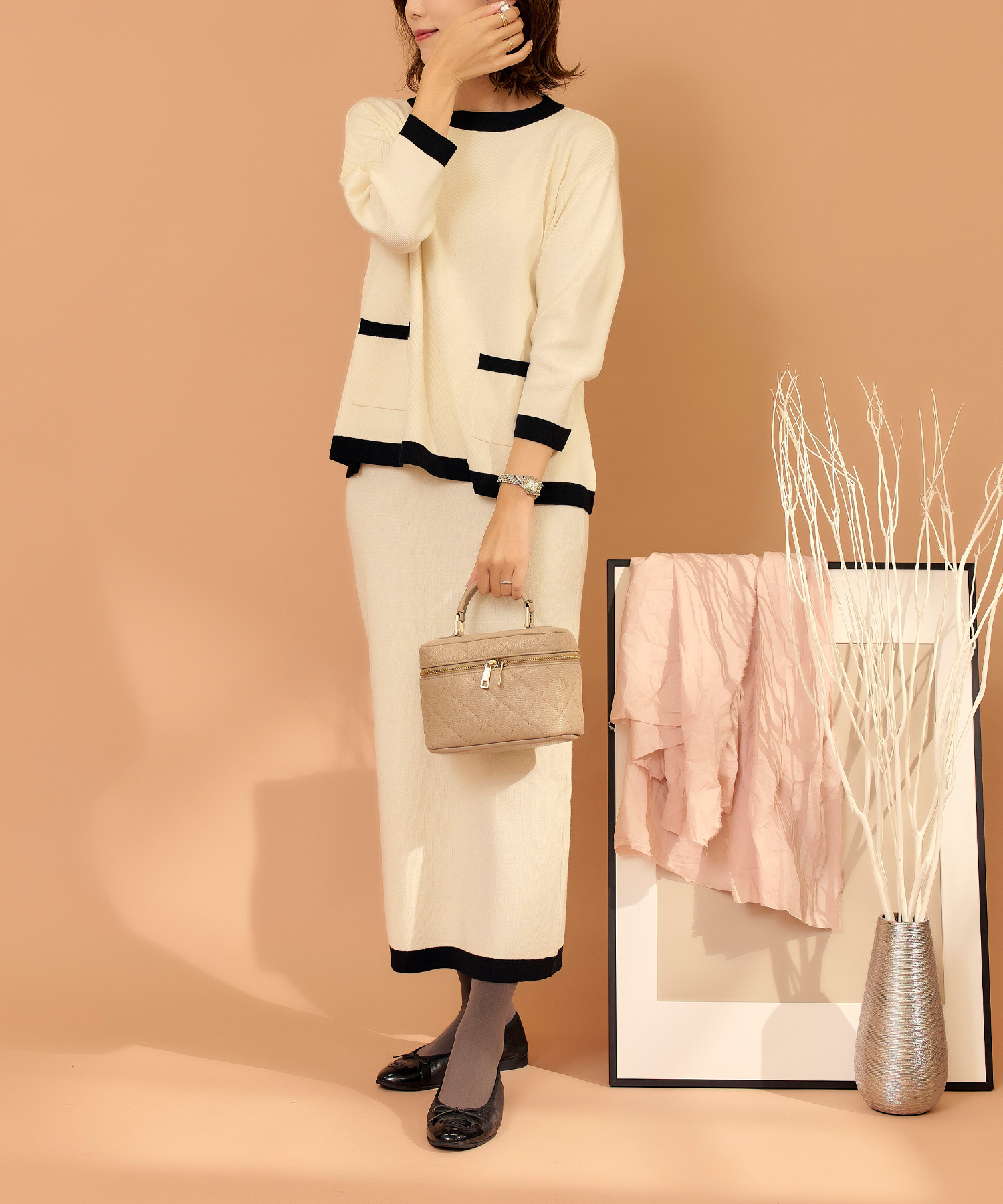 トップスでよく見かけるバイカラーですが、もちろんボトムスでも展開されています。タイトスカートの裾に配色されたデザインは安定感があり、さり気ないアクセントに。セットアップで合わせたスタイリングの他にも単品使いでコーディネートの幅が広がる1枚です。