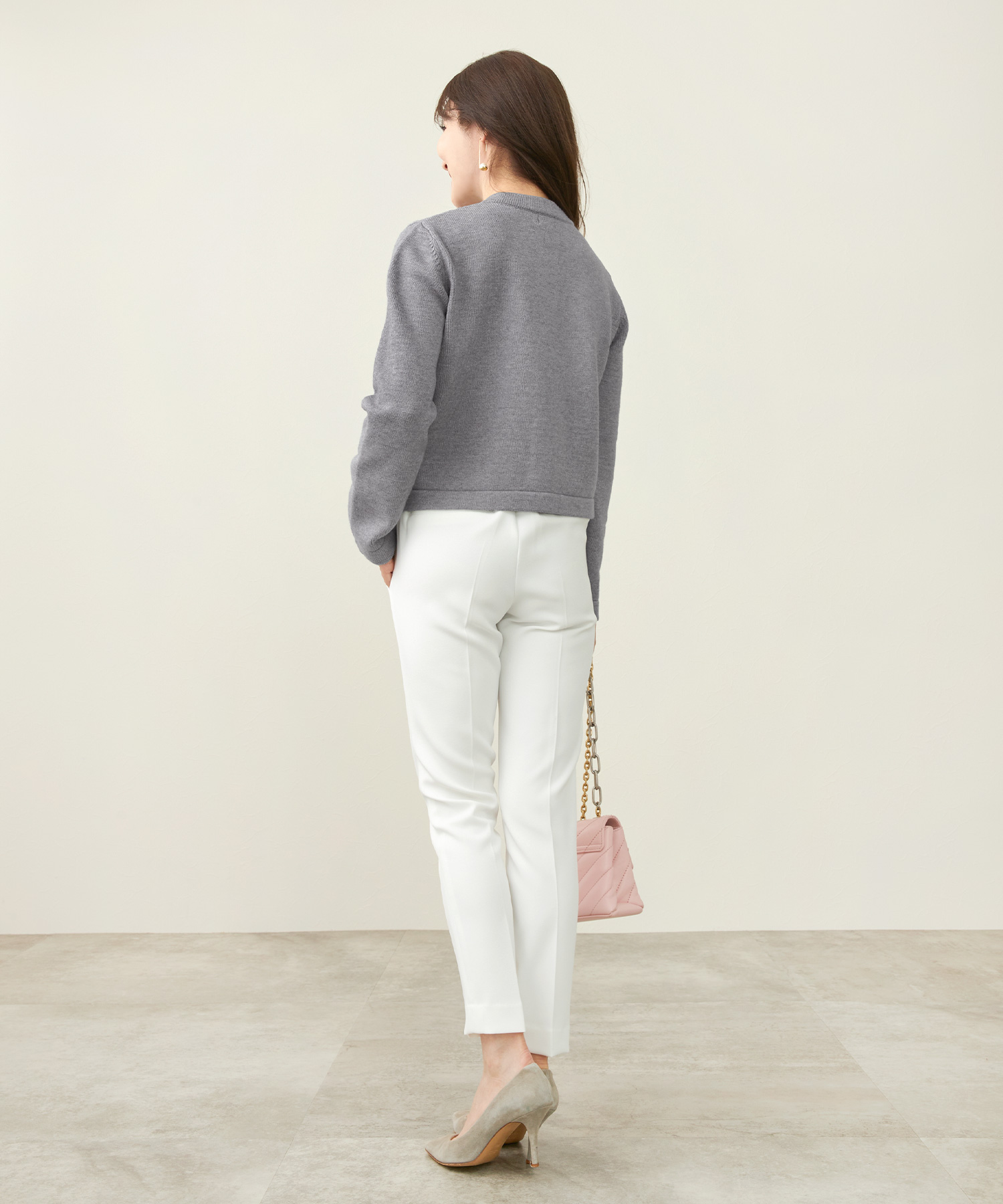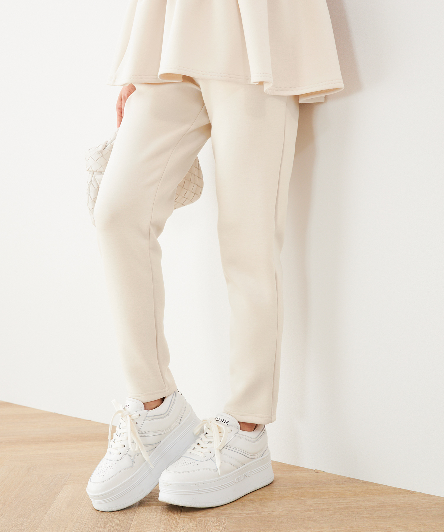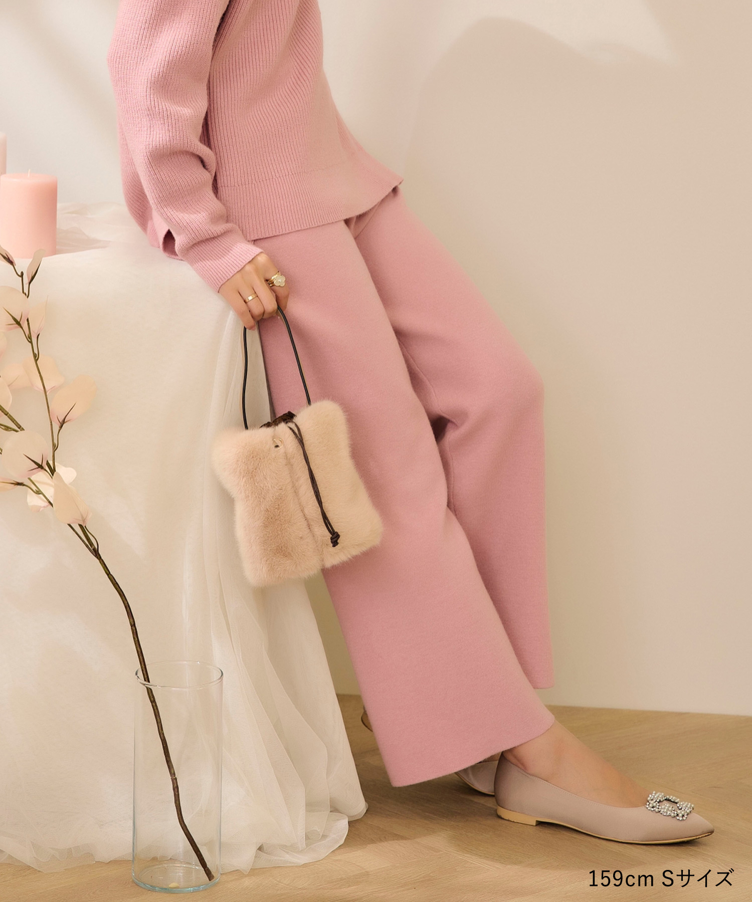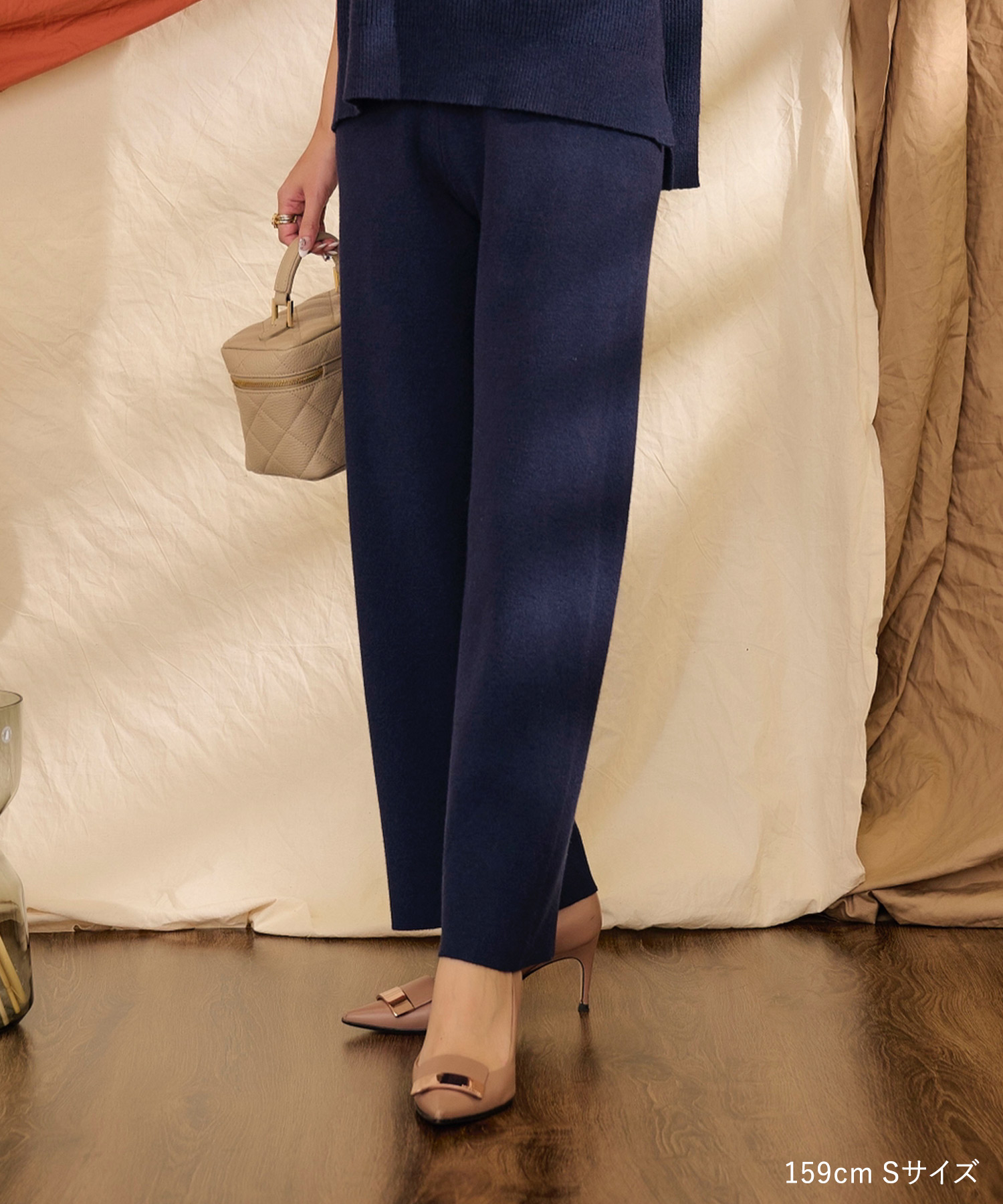 シワになりにくいニットパンツなら長時間の移動も安心。全体的にゆとりのあるシルエットで快適ながら、きれいめに着られる優秀アイテムです。セットアップでも着用できるので、1日目はセットアップで、2日目は別々のアイテムと合わせて…と、着回すことも可能♡