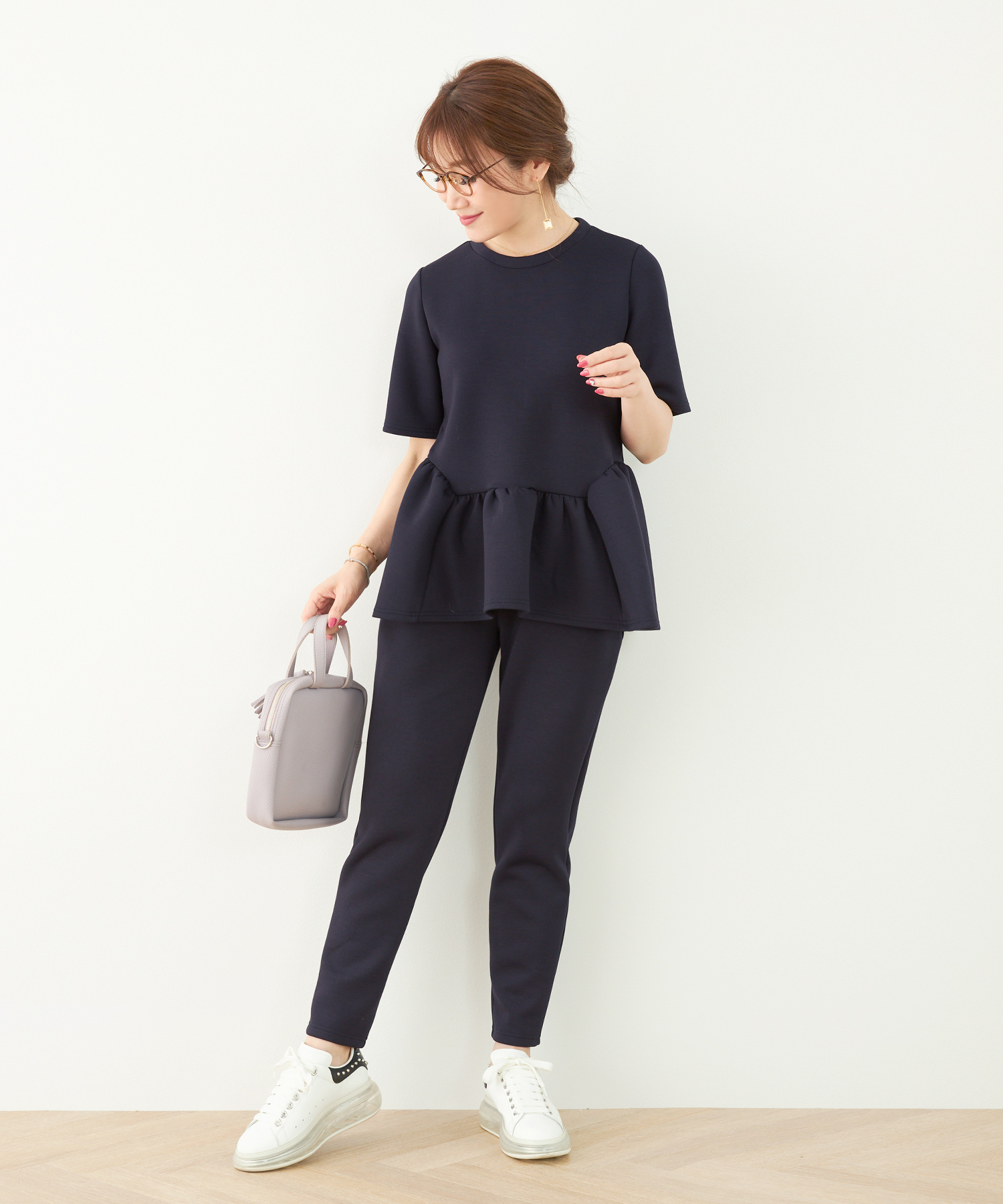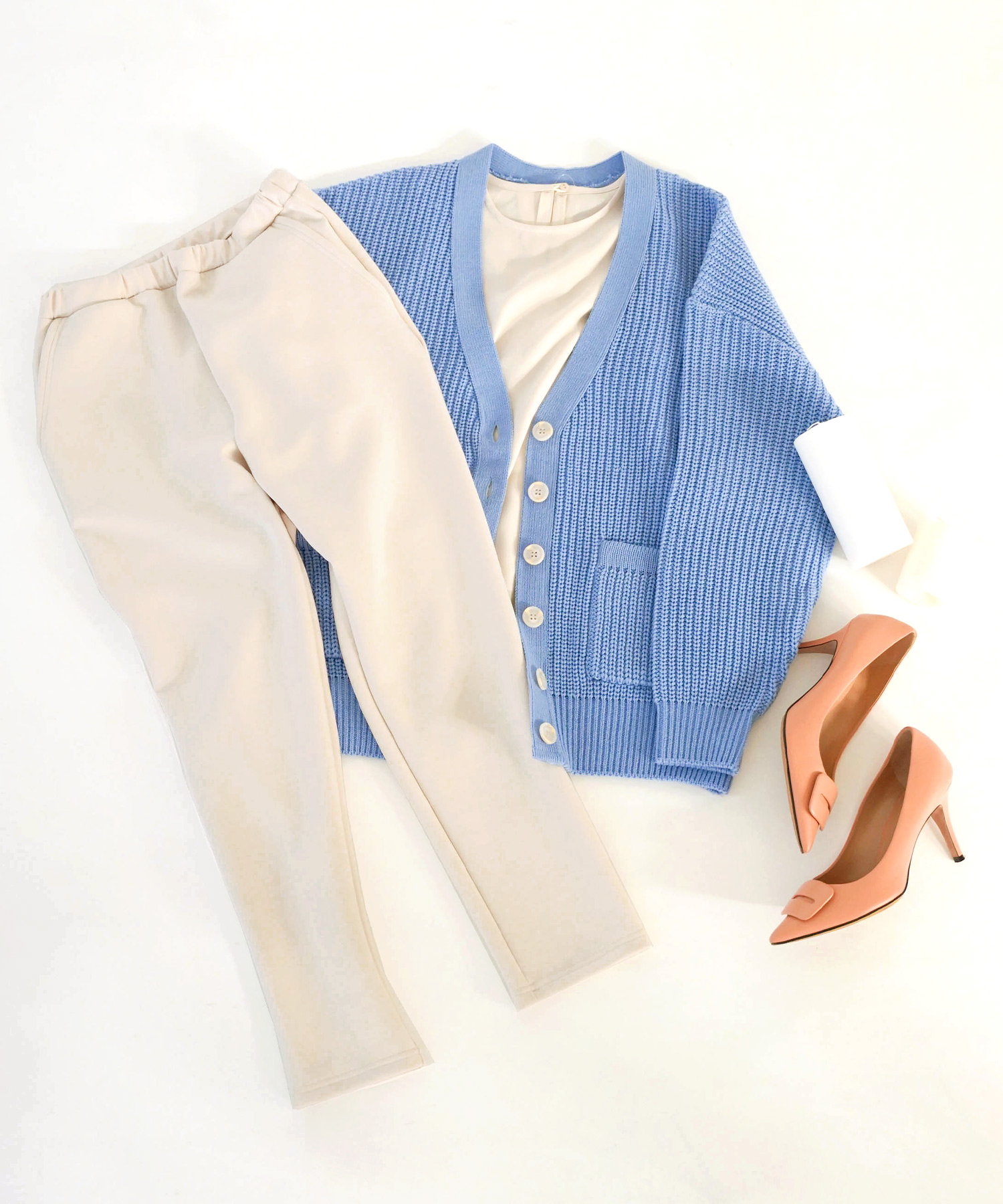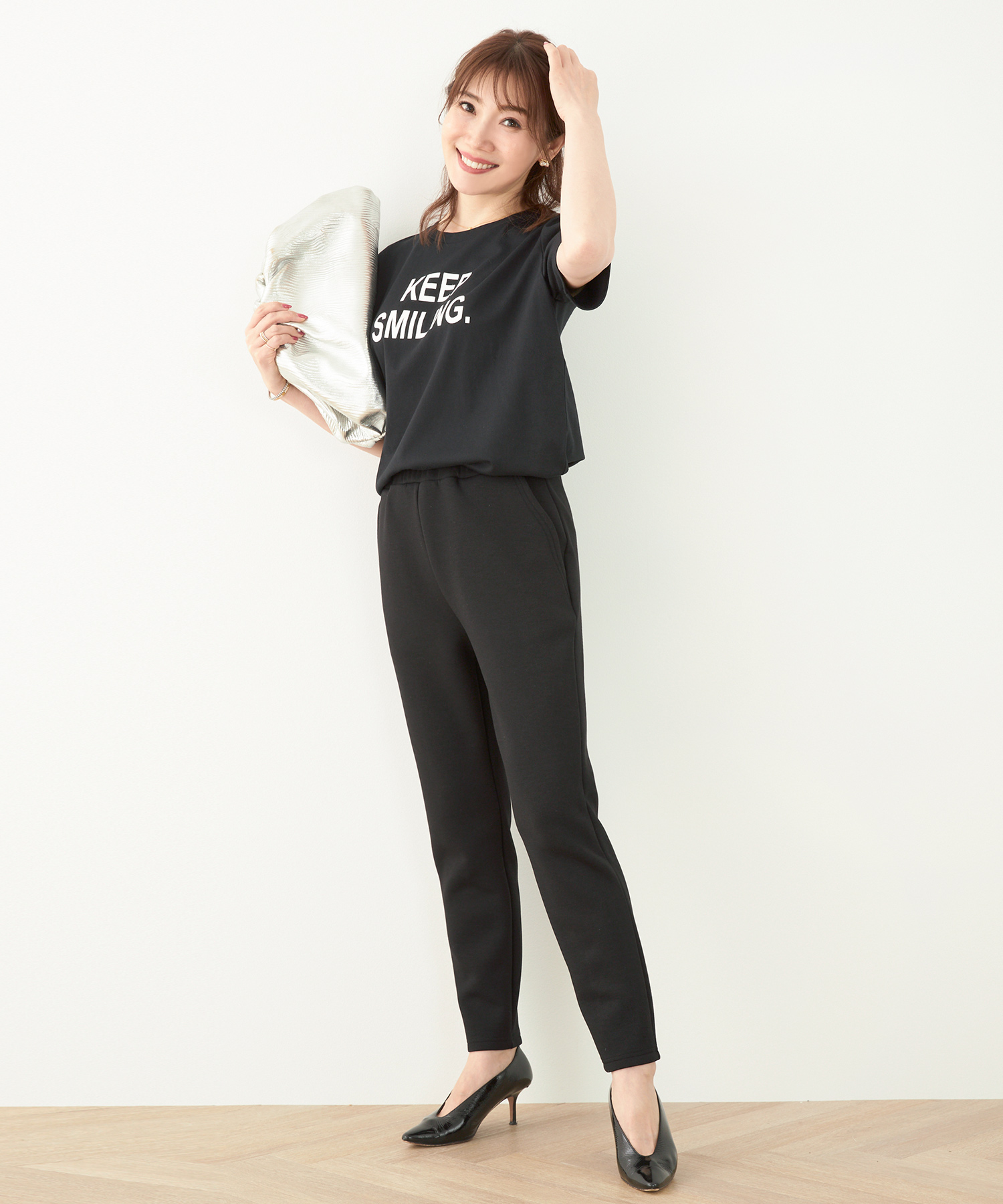 シワになりにくいニットパンツなら長時間の移動も安心。全体的にゆとりのあるシルエットで快適ながら、きれいめに着られる優秀アイテムです。セットアップでも着用できるので、1日目はセットアップで、2日目は別々のアイテムと合わせて…と、着回すことも可能♡