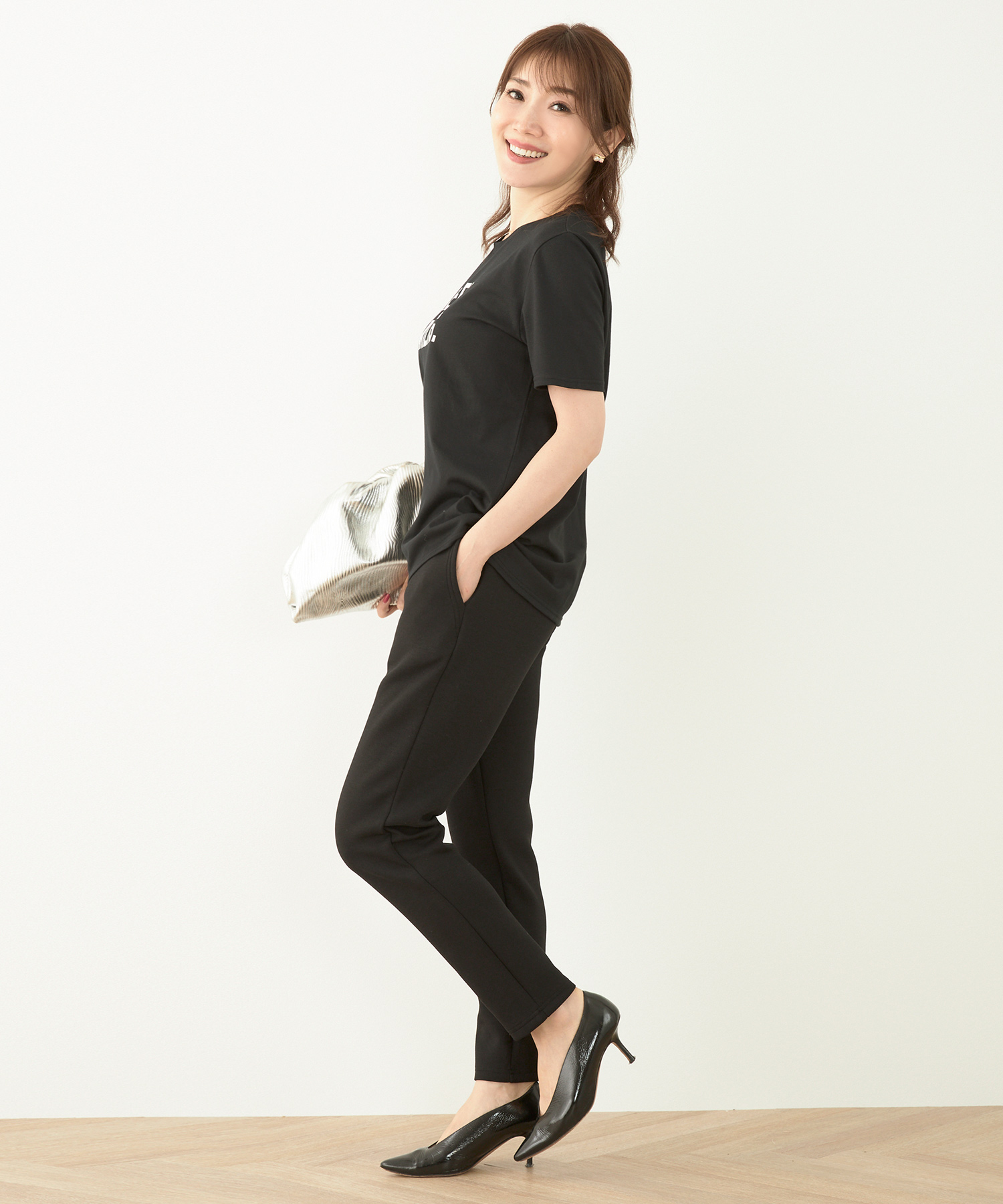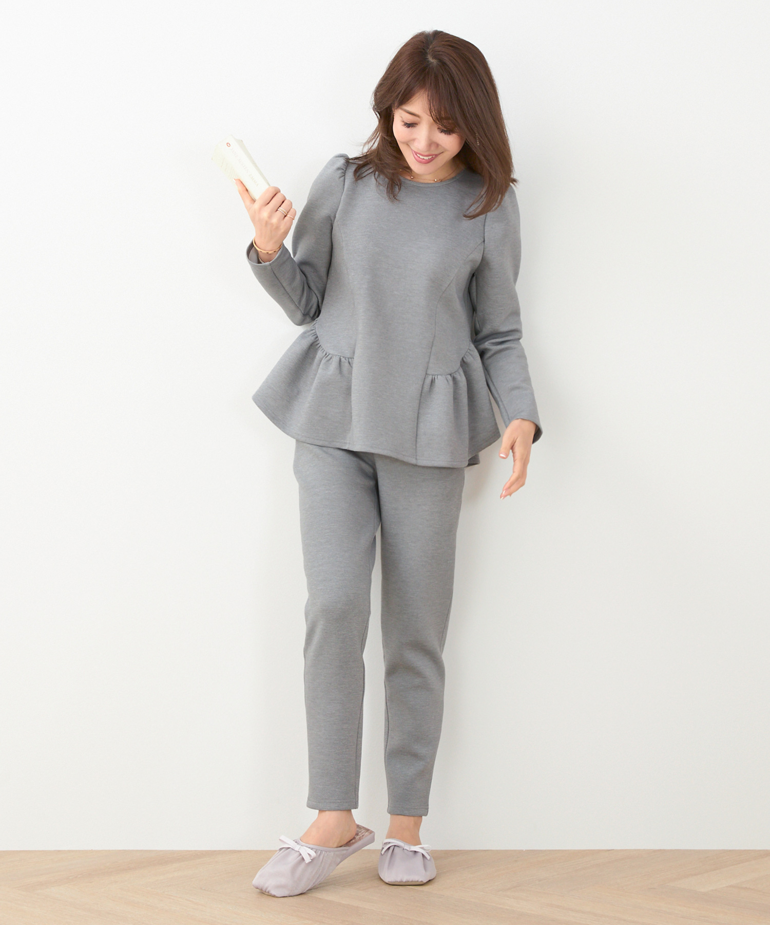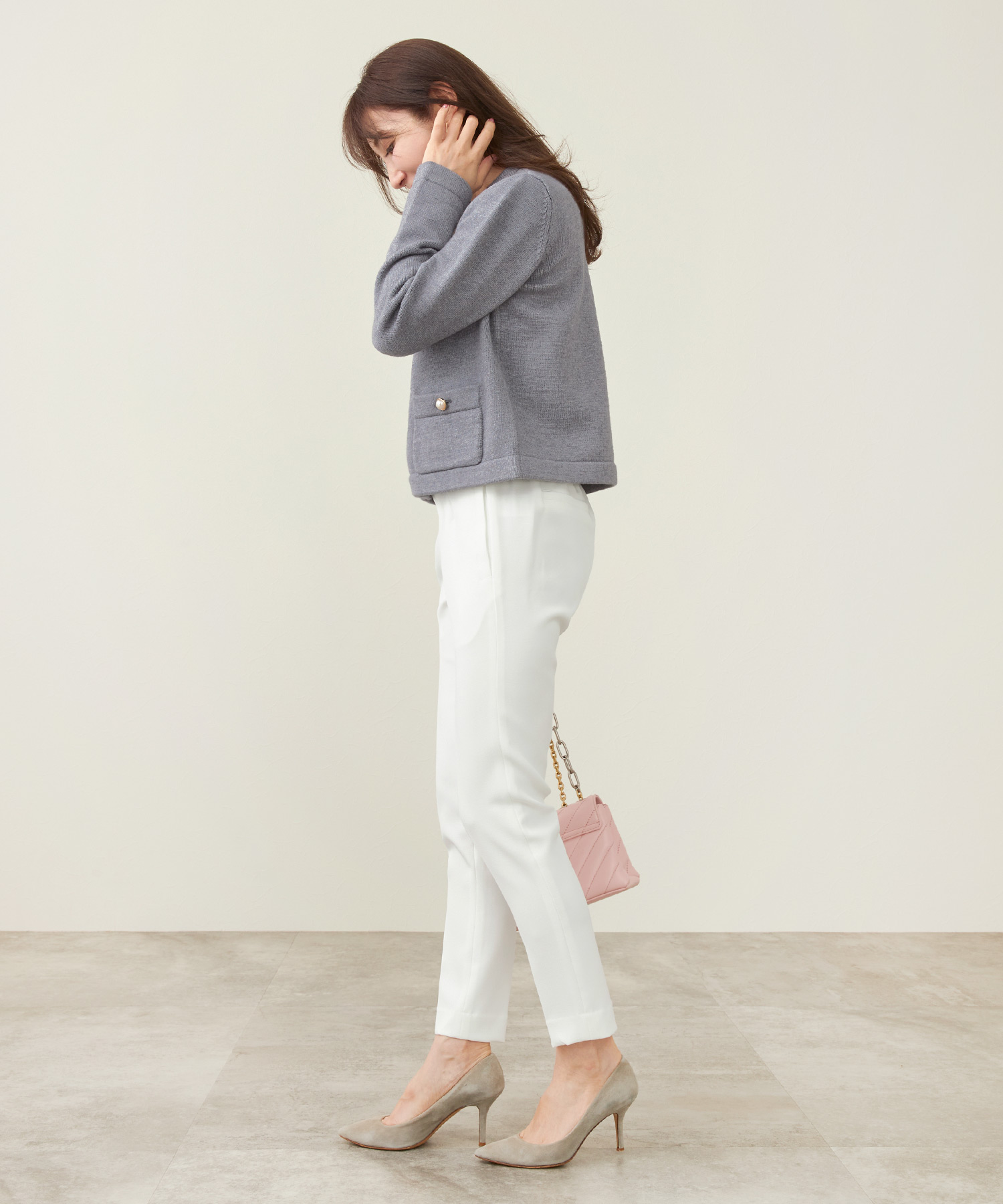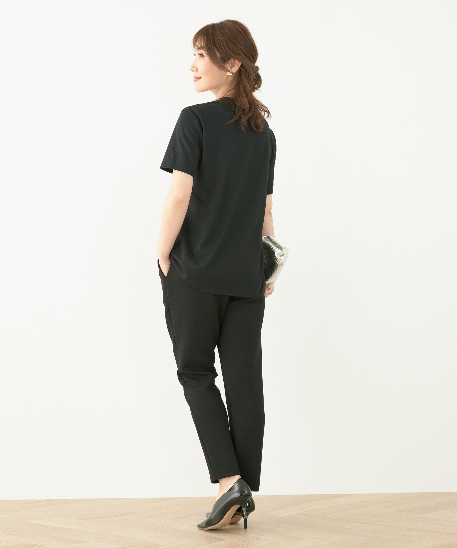 シワになりにくいニットパンツなら長時間の移動も安心。全体的にゆとりのあるシルエットで快適ながら、きれいめに着られる優秀アイテムです。セットアップでも着用できるので、1日目はセットアップで、2日目は別々のアイテムと合わせて…と、着回すことも可能♡