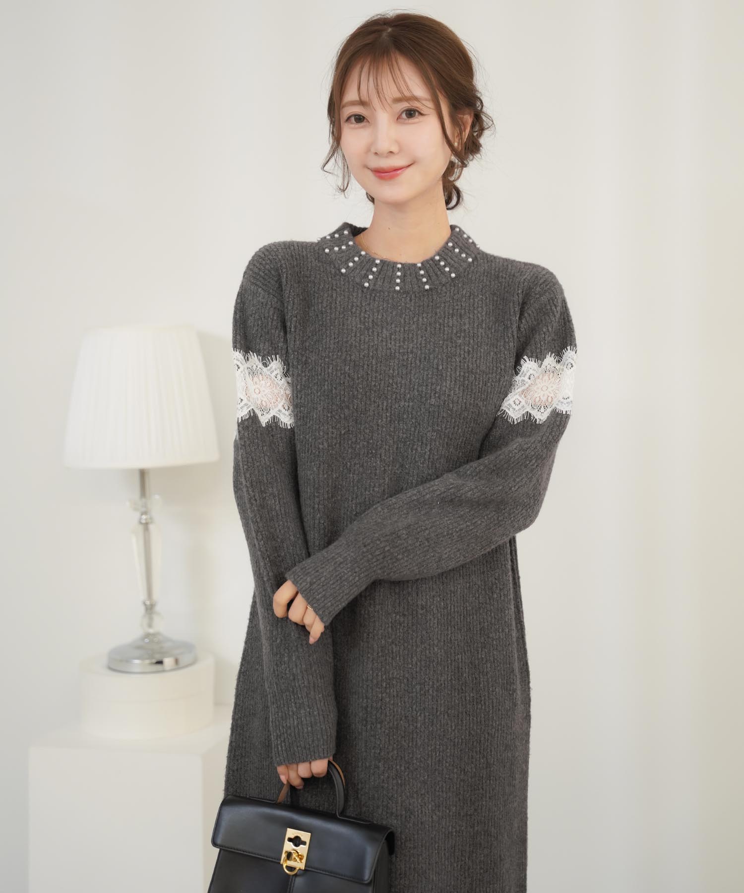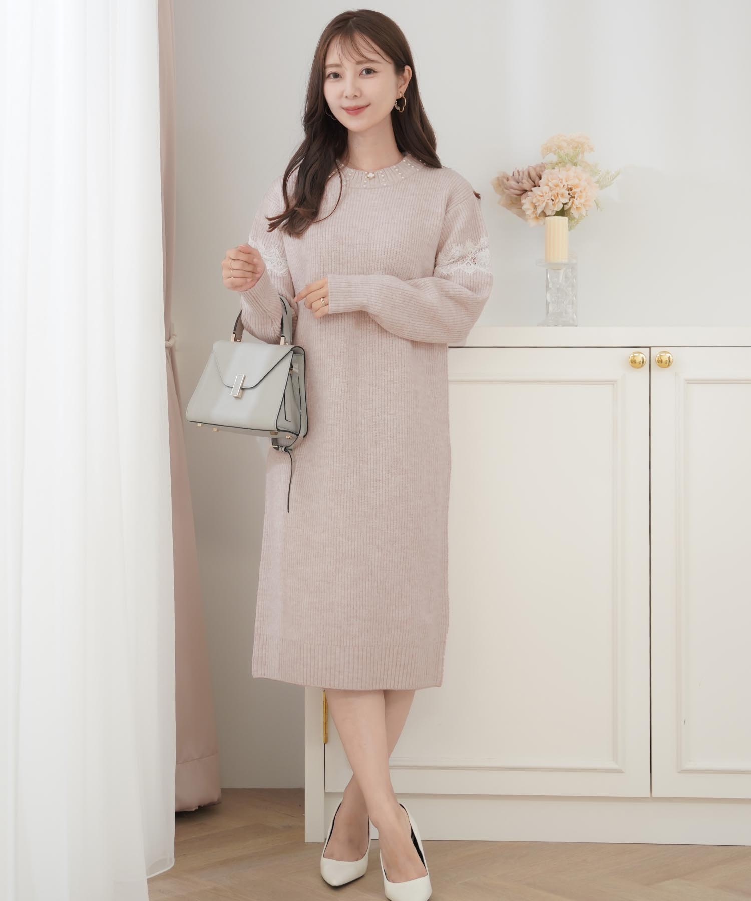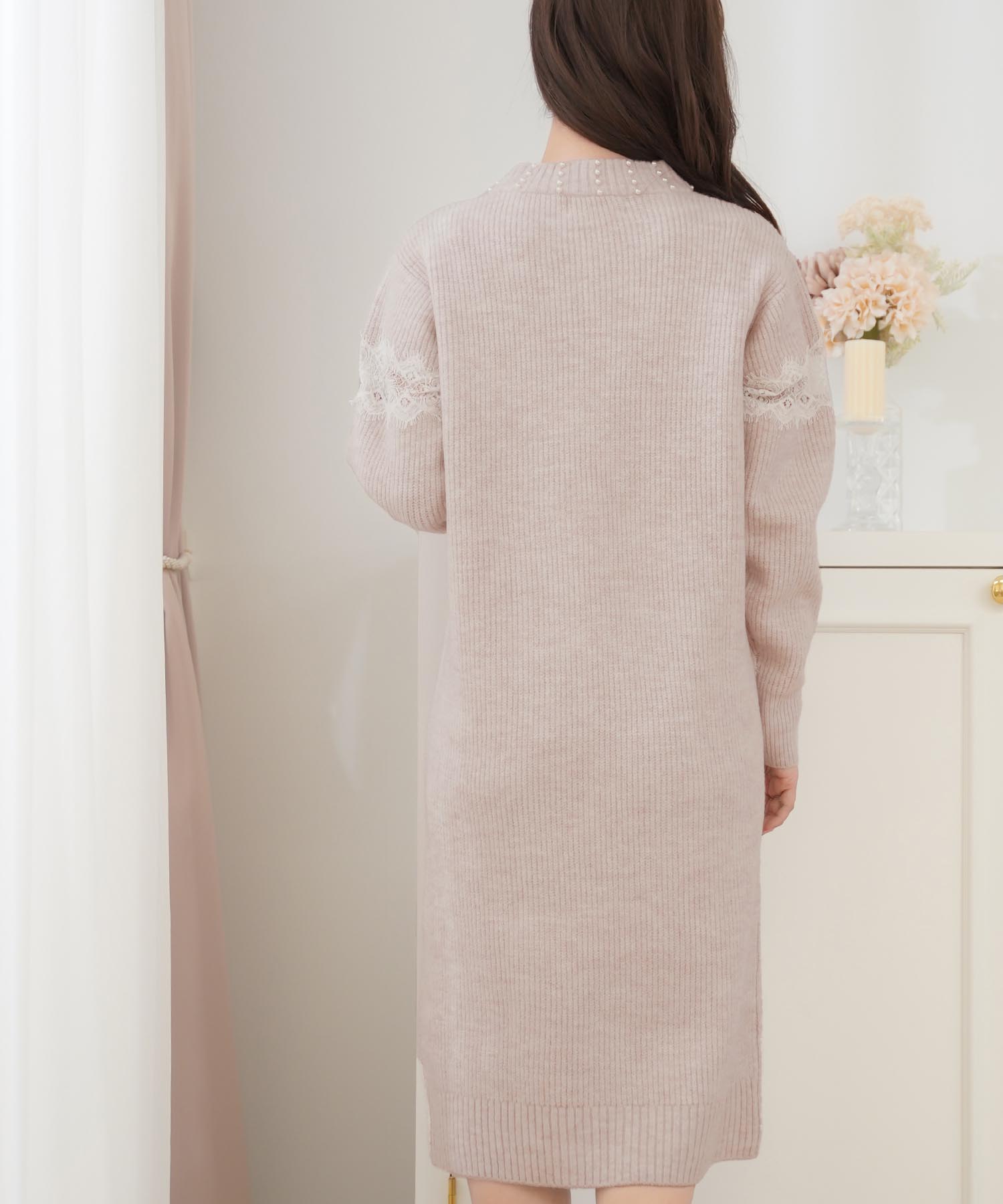 ニットワンピースの中でもフェミニンなデザインを選ぶならこちら。首元のパールとレース使いが大人可愛い雰囲気に仕上げてくれます。柔らかくもちっとした素材を使用しているので着心地がよく暖かい一枚。