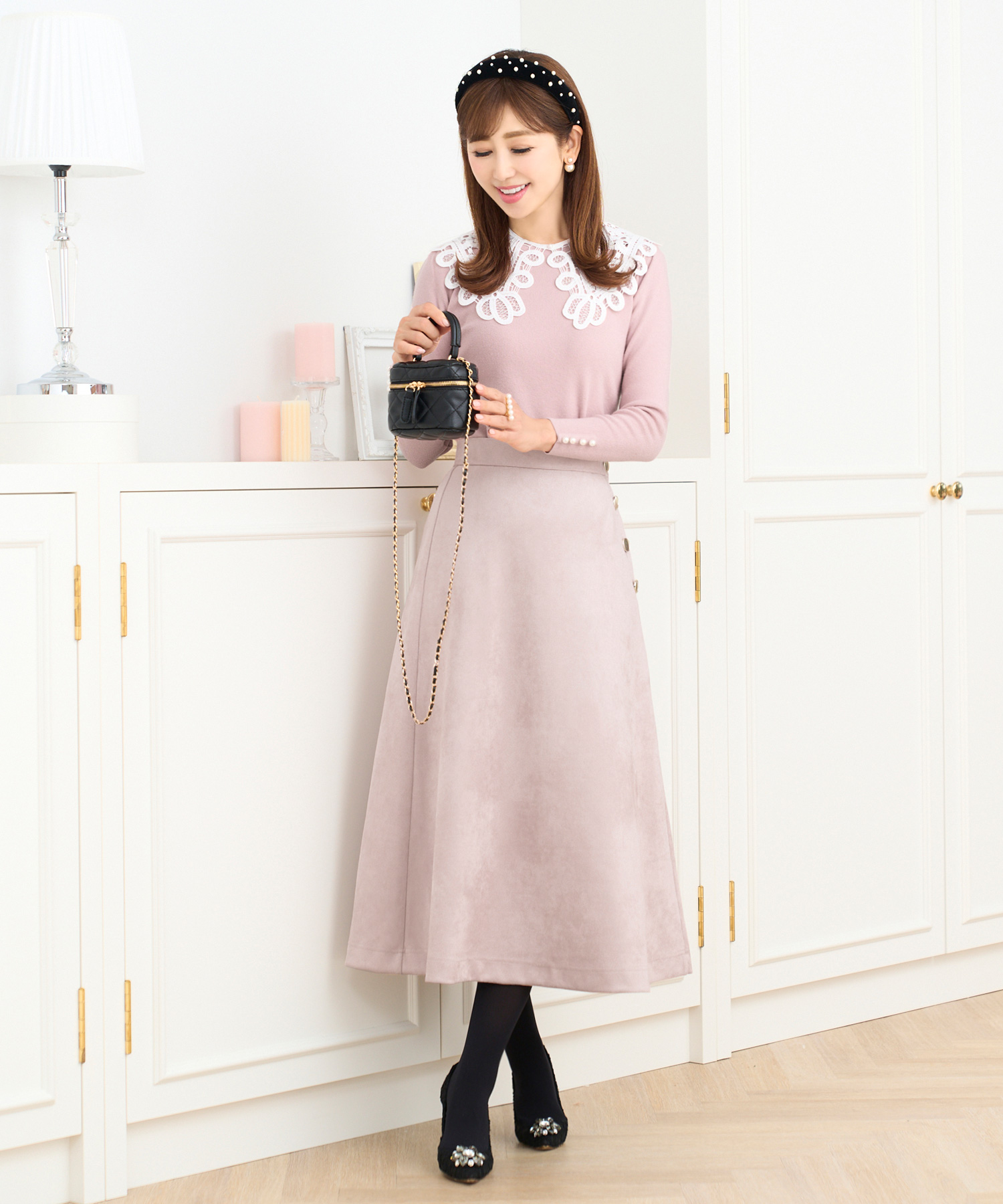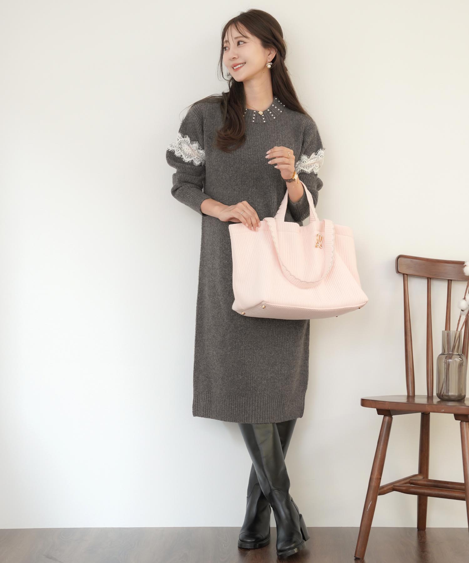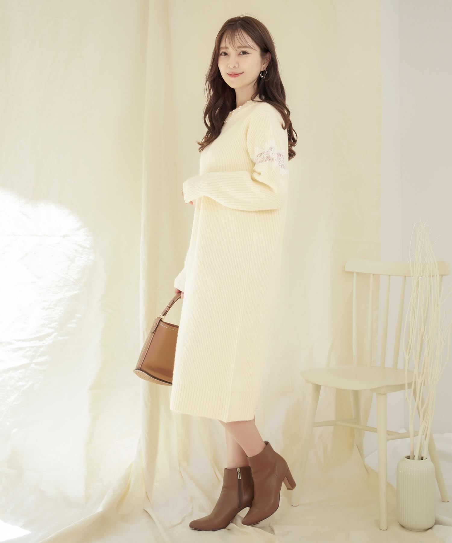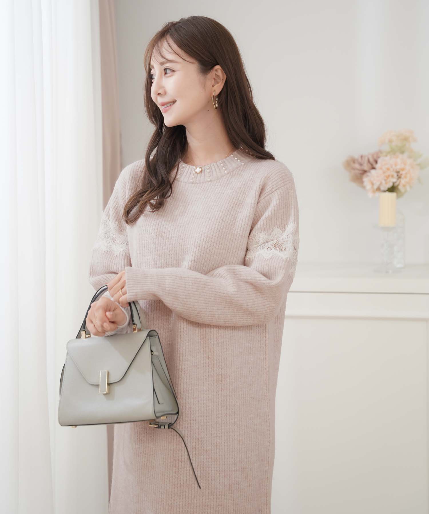 ニットワンピースの中でもフェミニンなデザインを選ぶならこちら。首元のパールとレース使いが大人可愛い雰囲気に仕上げてくれます。柔らかくもちっとした素材を使用しているので着心地がよく暖かい一枚。