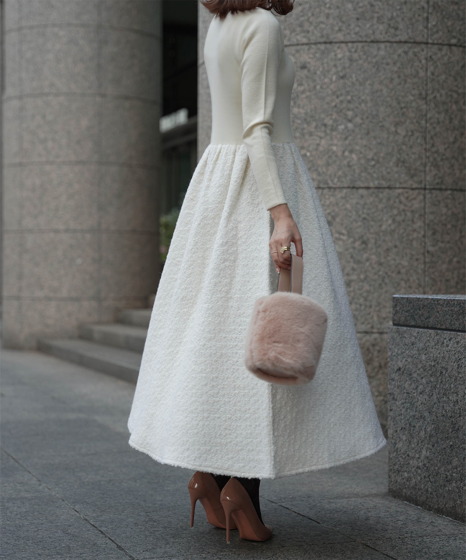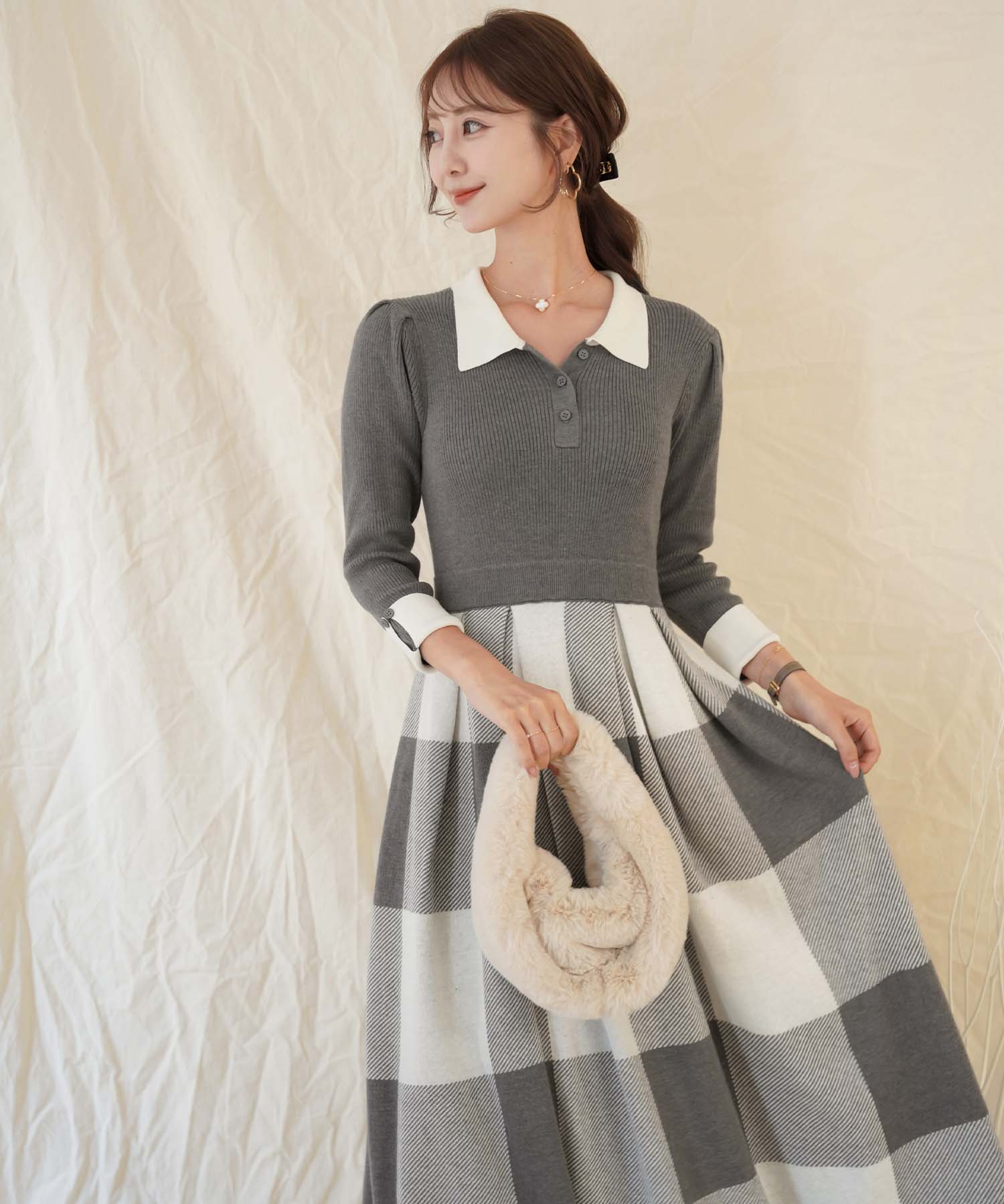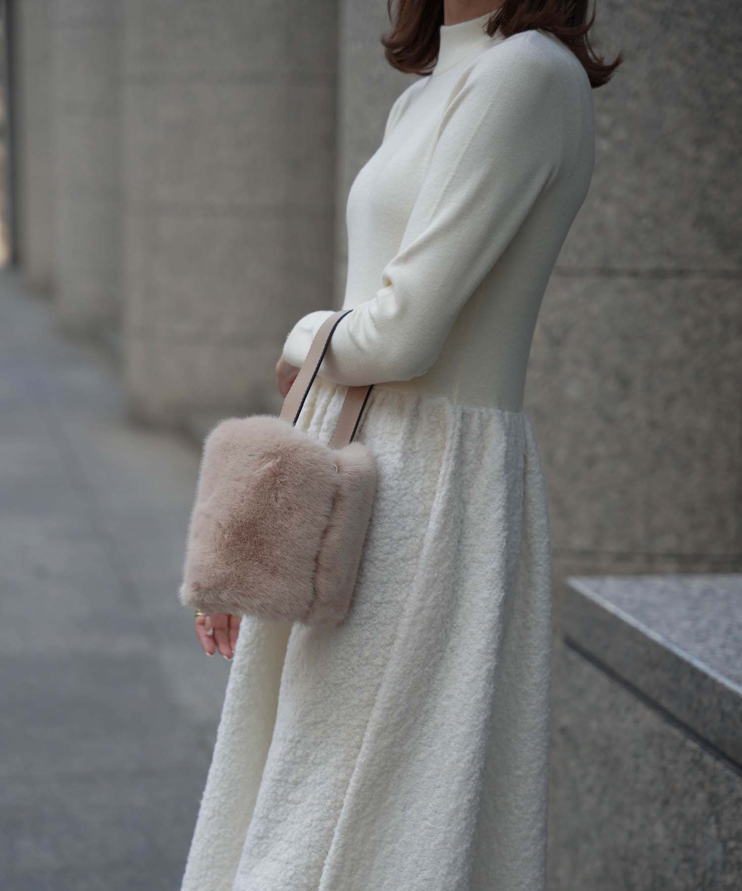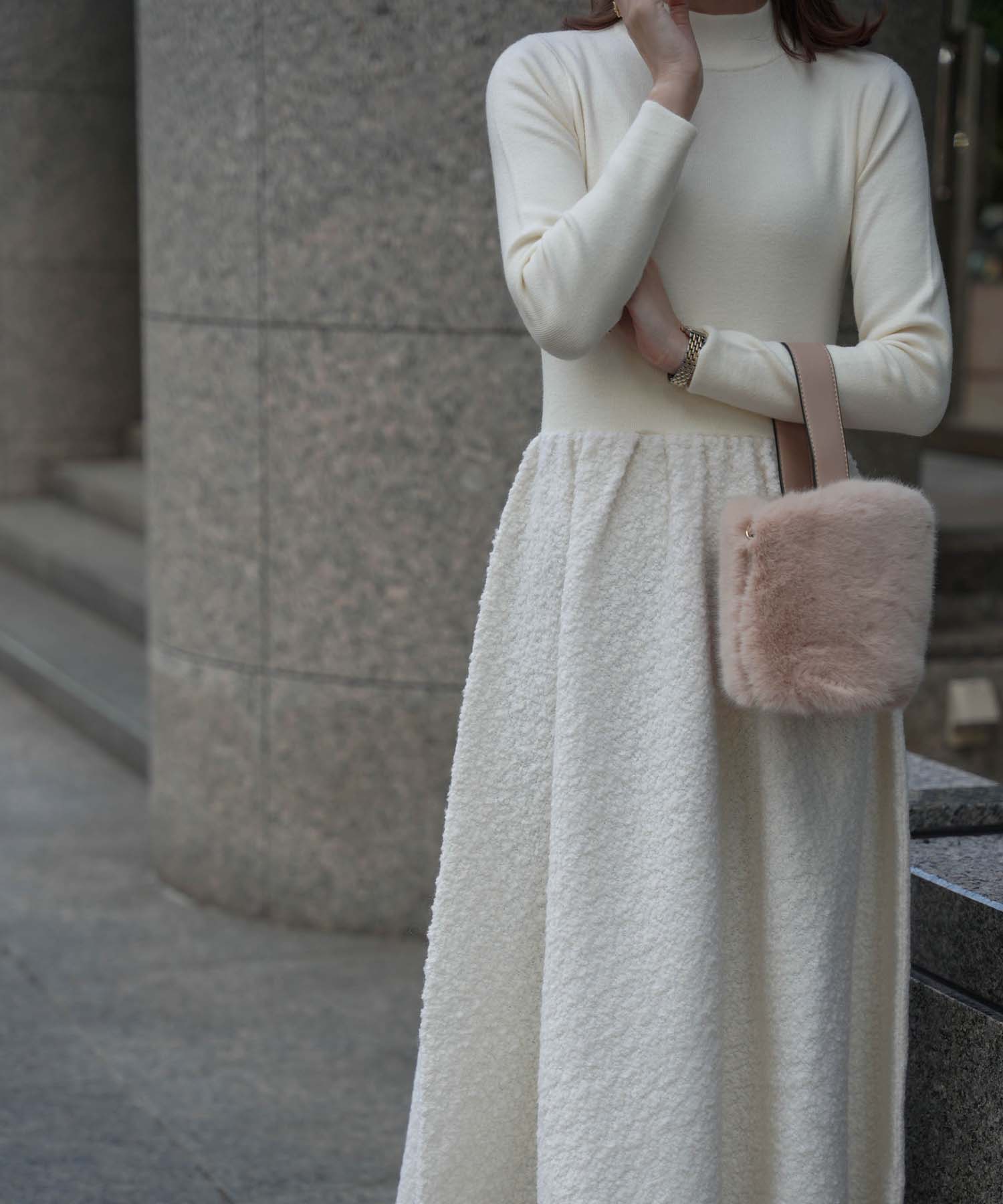 ■ニット×ブークレのドッキングワンピース