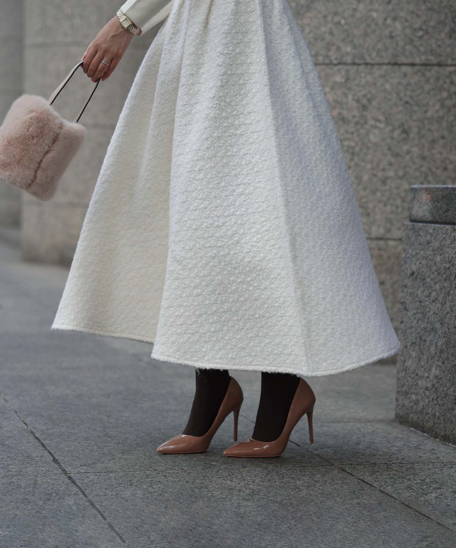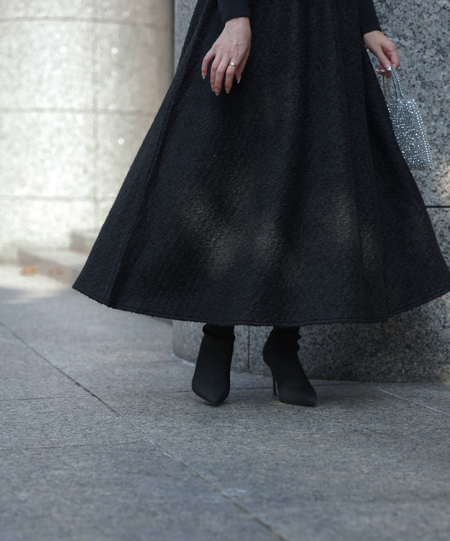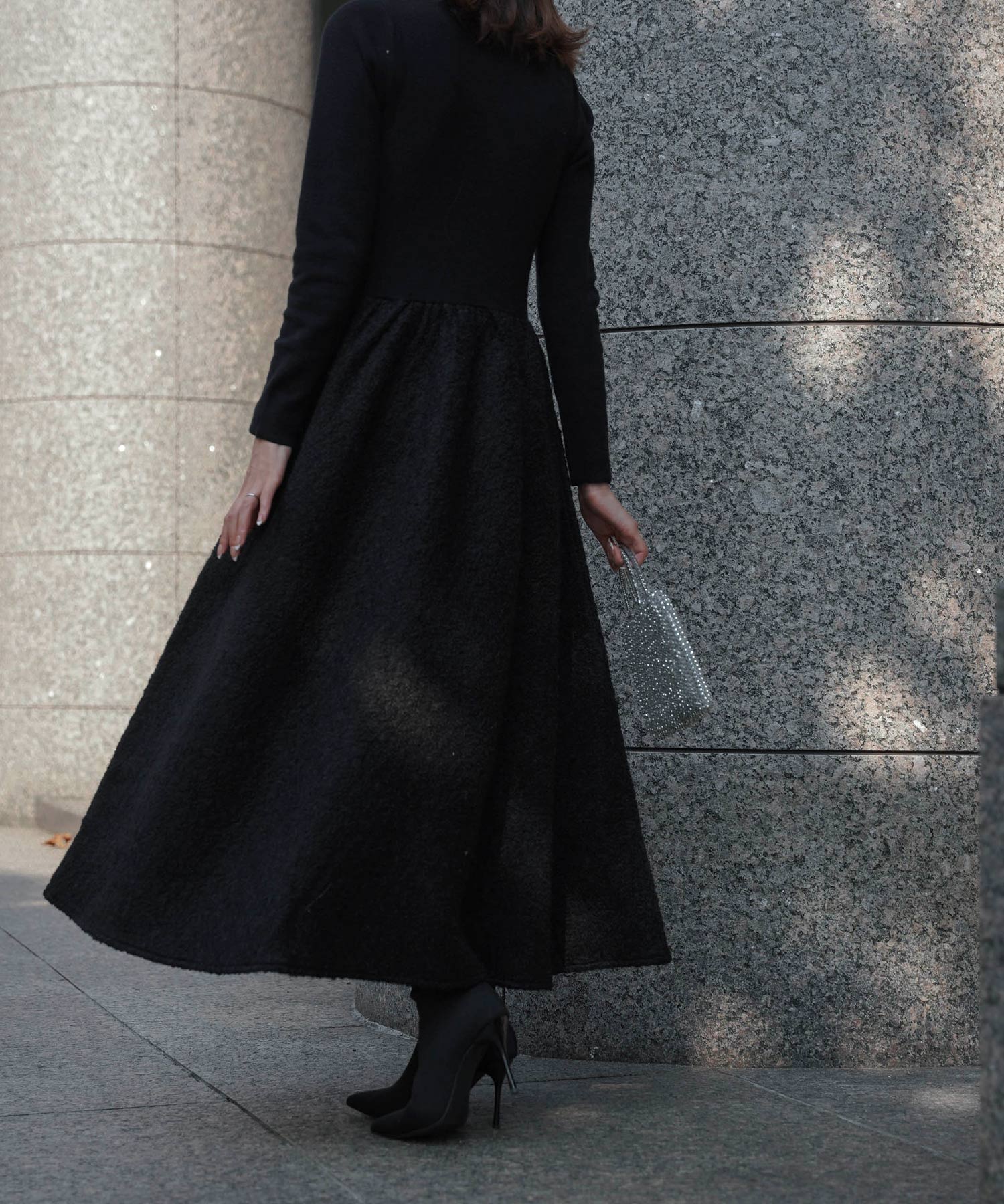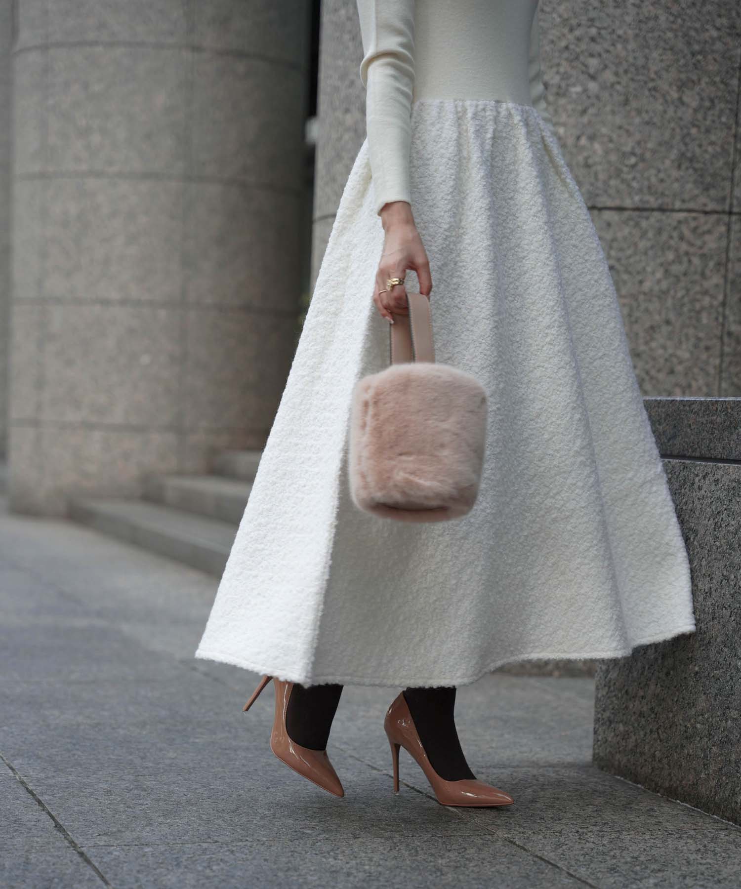 ニットにブークレ生地をドッキングしたワンピース。スカート部分は防寒にもぴったりのブークレ生地を採用しているのであたたかさをキープできます。またシワになりにくくウエストをゴム仕様にしているので長時間の移動にも便利です。