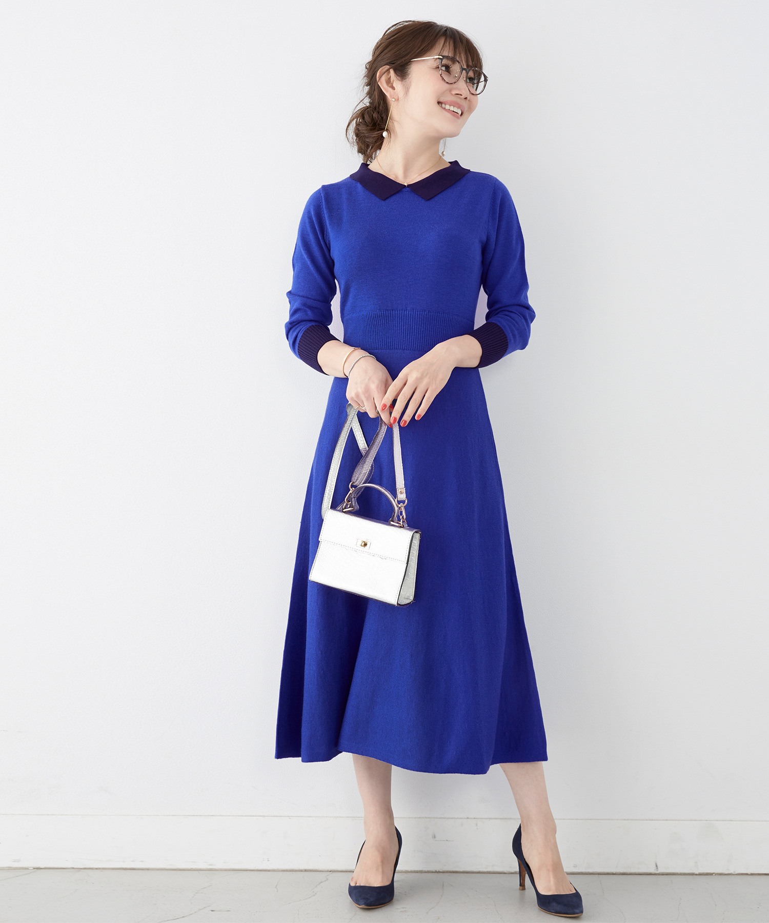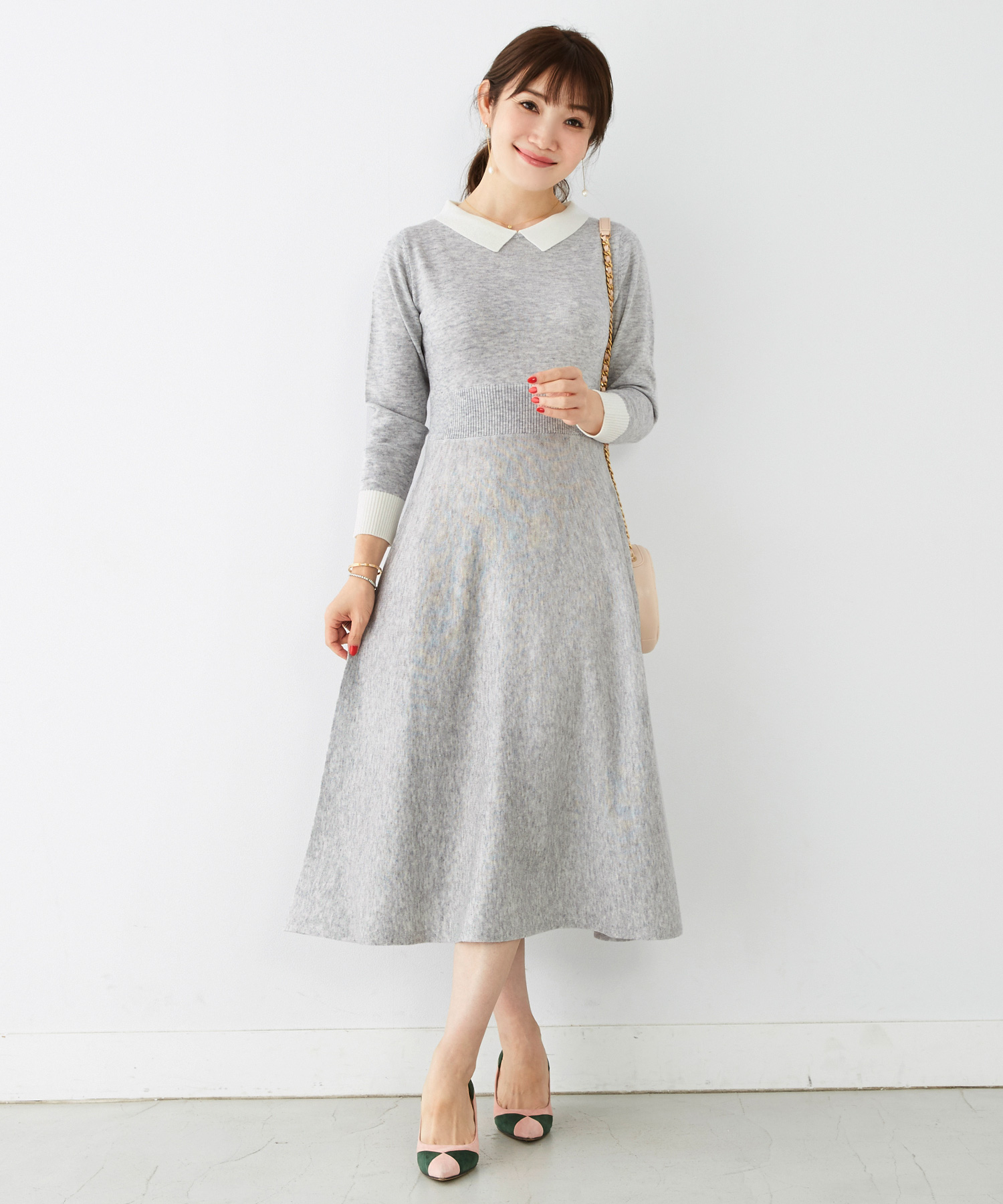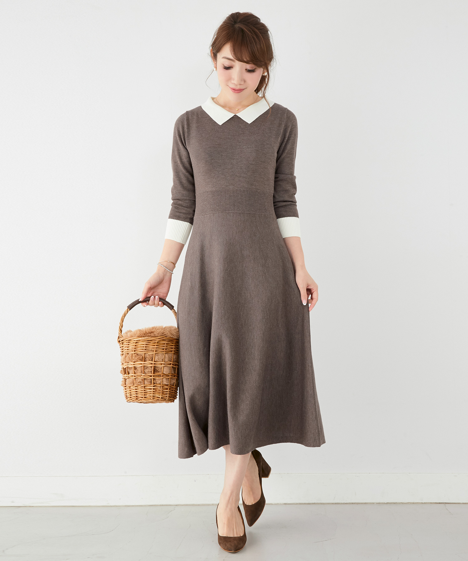 ラクチンなニットワンピースに配色の襟をプラスしたクラシカルで女性らしいデザイン。ホワイトの襟は顔周りを明るく見せてくれるのでレフ板効果も期待できます。素材もさらりとした上品な印象のハイゲージニットで薄手ながらも暖かみのある、チクチク感を感じさせないワンピースです。