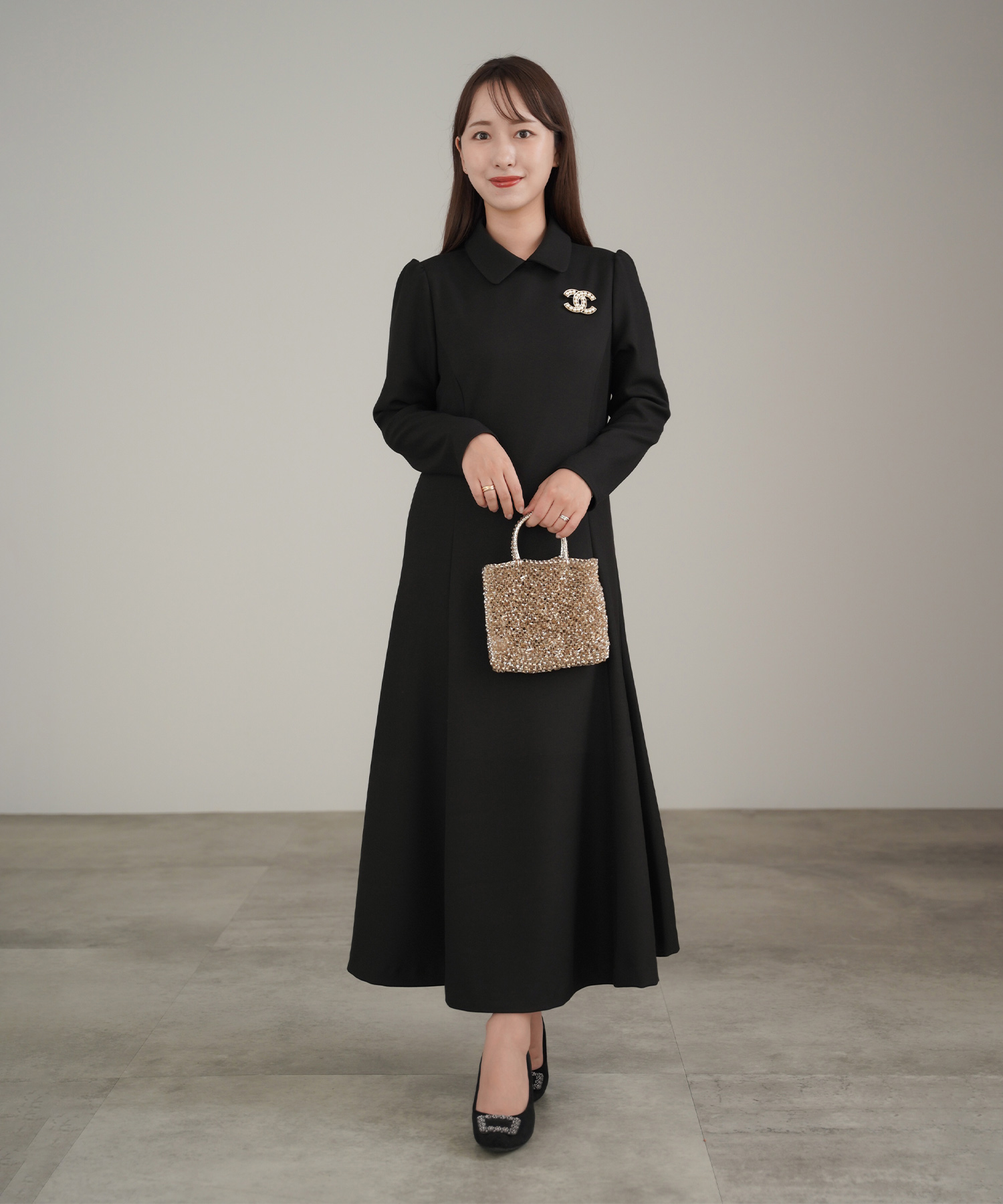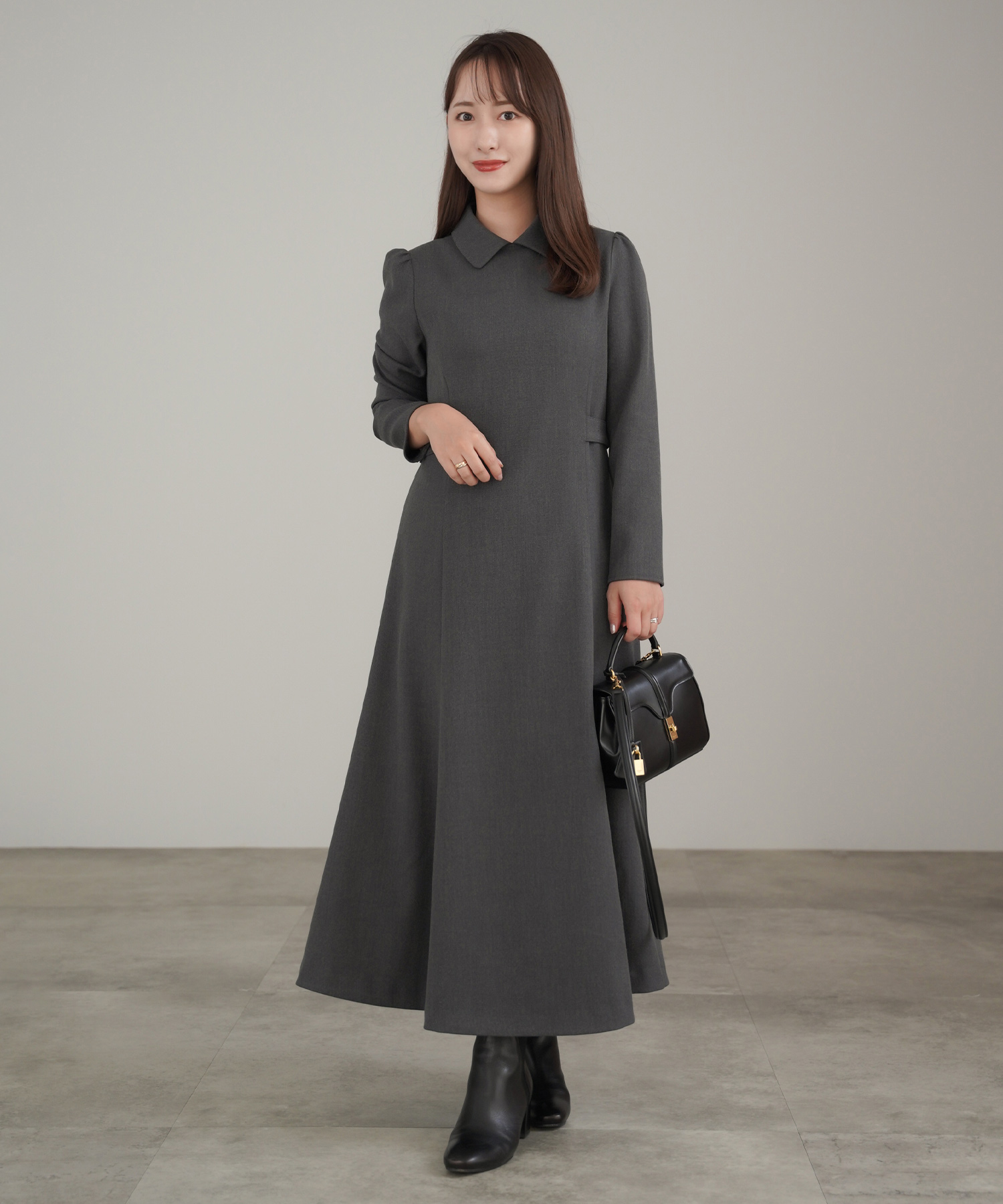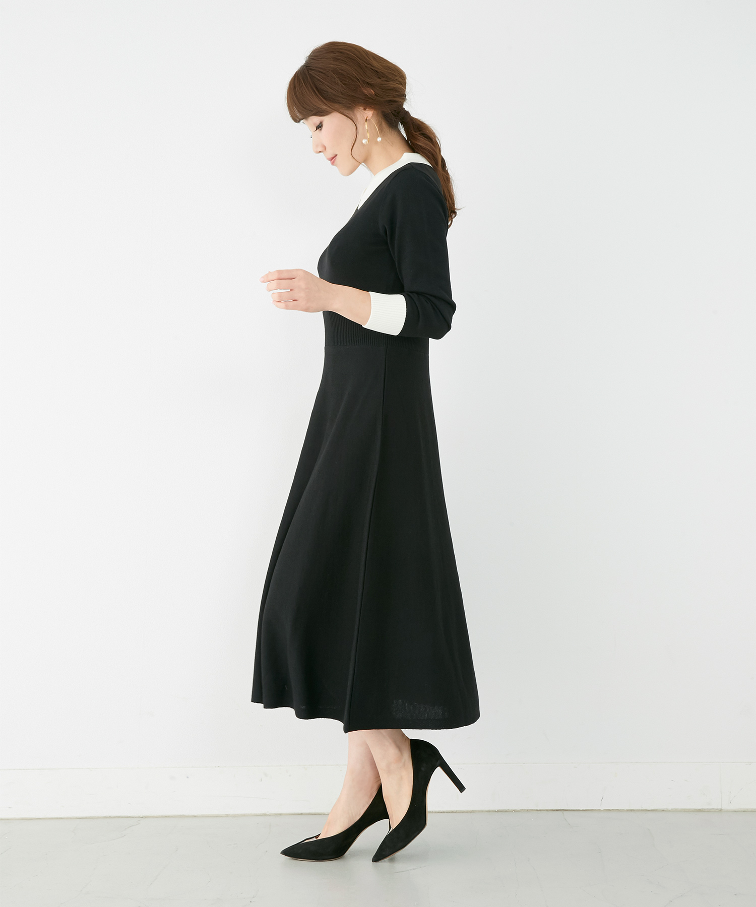 白い襟付きニットワンピースで良家のお嬢さん風の着こなし♡ ロング丈のブラックデザインなら着た時に落ち着いた雰囲気に仕上がります。首元の華奢なリボンでさり気なく顔まわりを盛って、派手ではないけれど程よくおしゃれもキープした義理のママにも一目置かれるスタイルに。