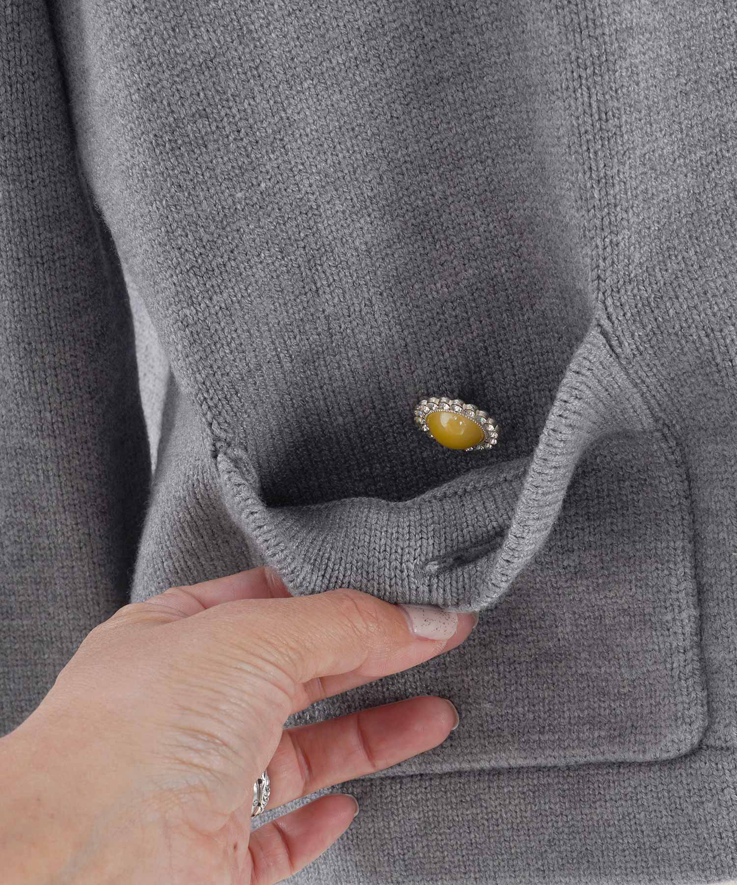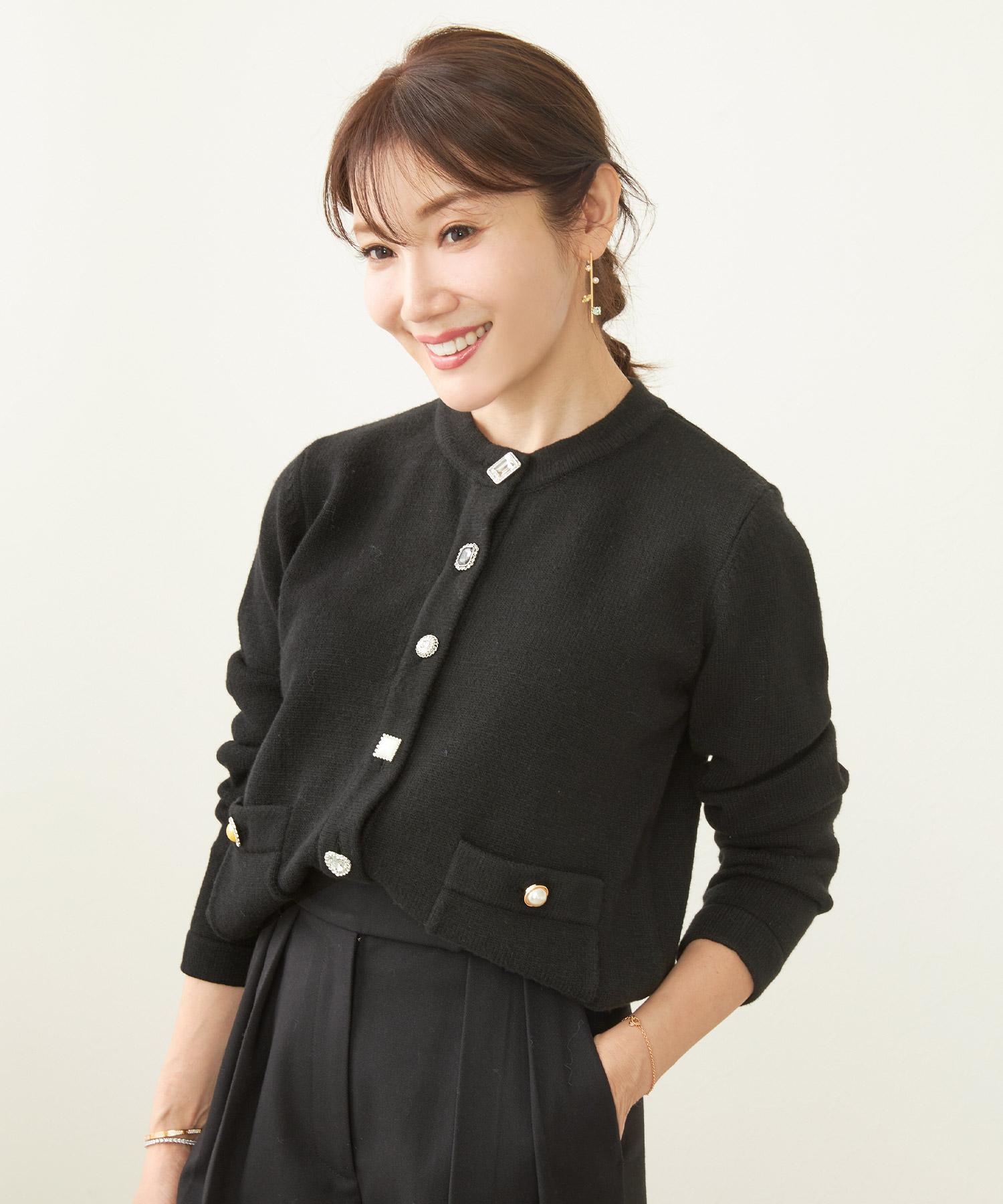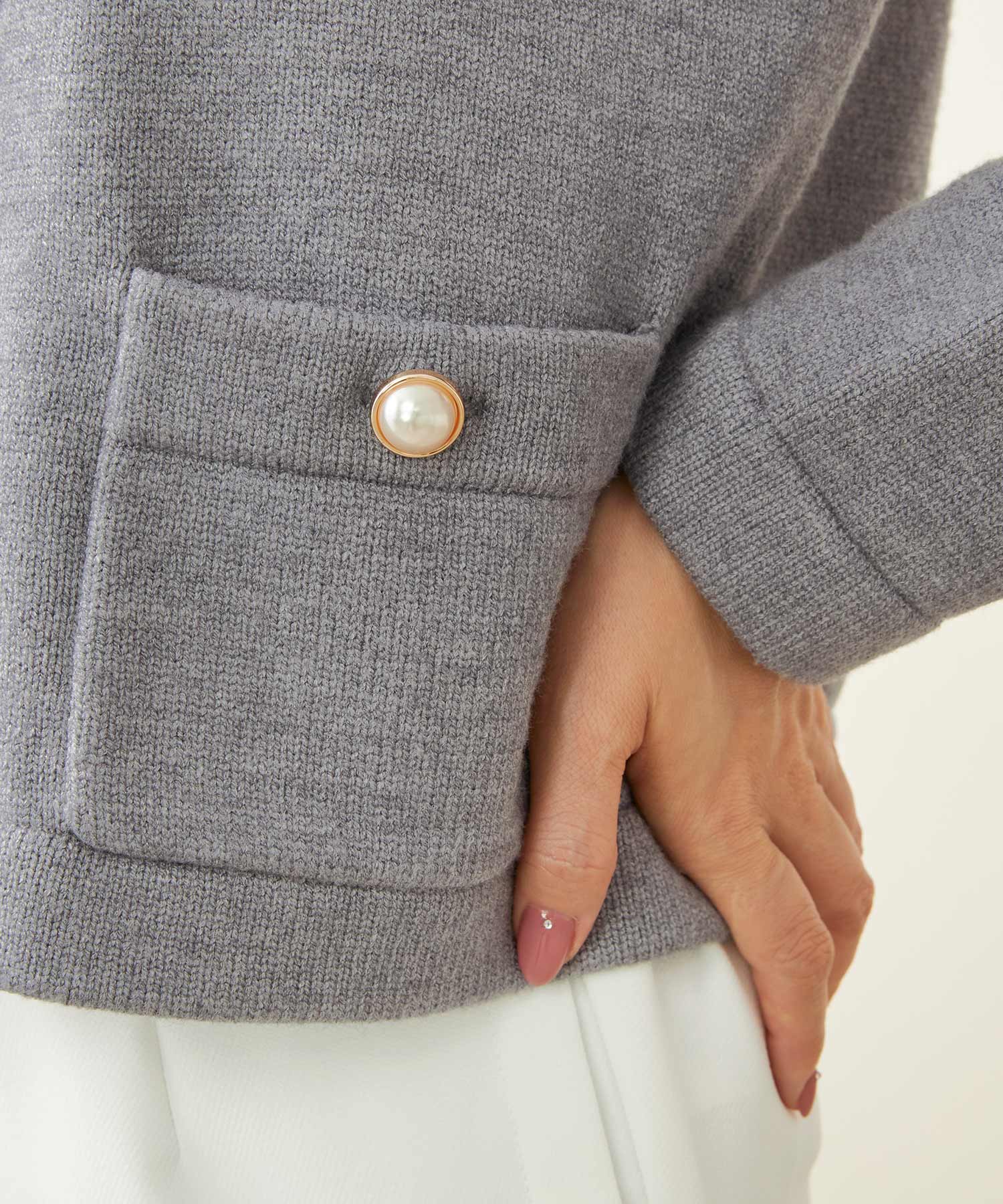 異なるパールやビジュー釦がアクセントになったカーディガンがコーディネートのアクセントに。柔らかくふっくらした肉厚の素材なので年末年始の寒い季節にぴったりです。