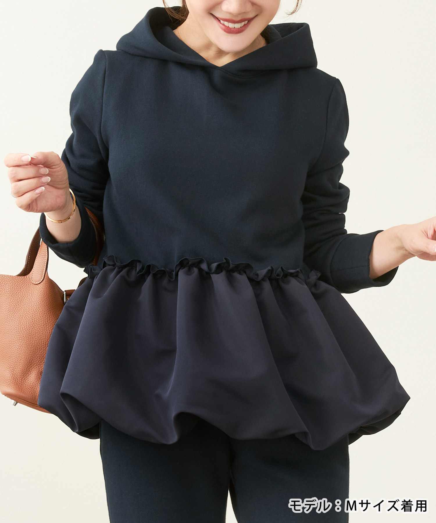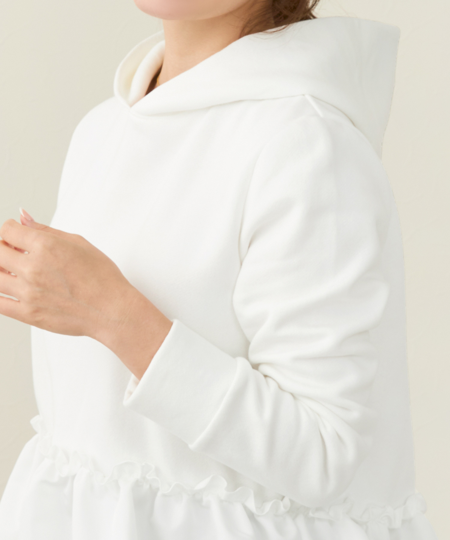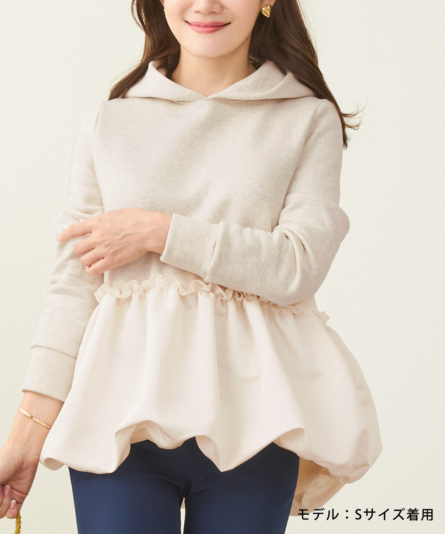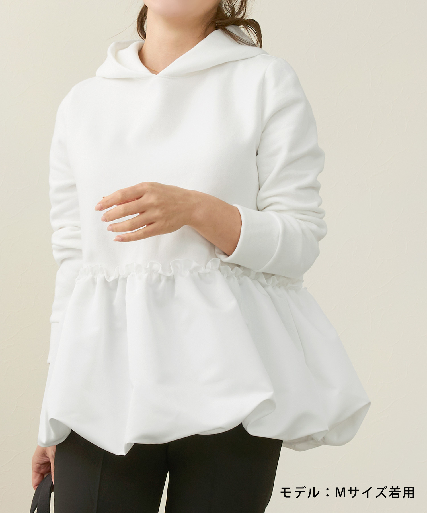 この時期にぴったりの裏起毛素材を使用した暖かいフーディ―プルオーバー。バルーンヘムとフリルデザインがカジュアル過ぎず、おしゃれで女性らしい印象をあたえてくれます。手洗いが可能なので気軽に着用できワンマイルウェアにちょうどいいアイテム。