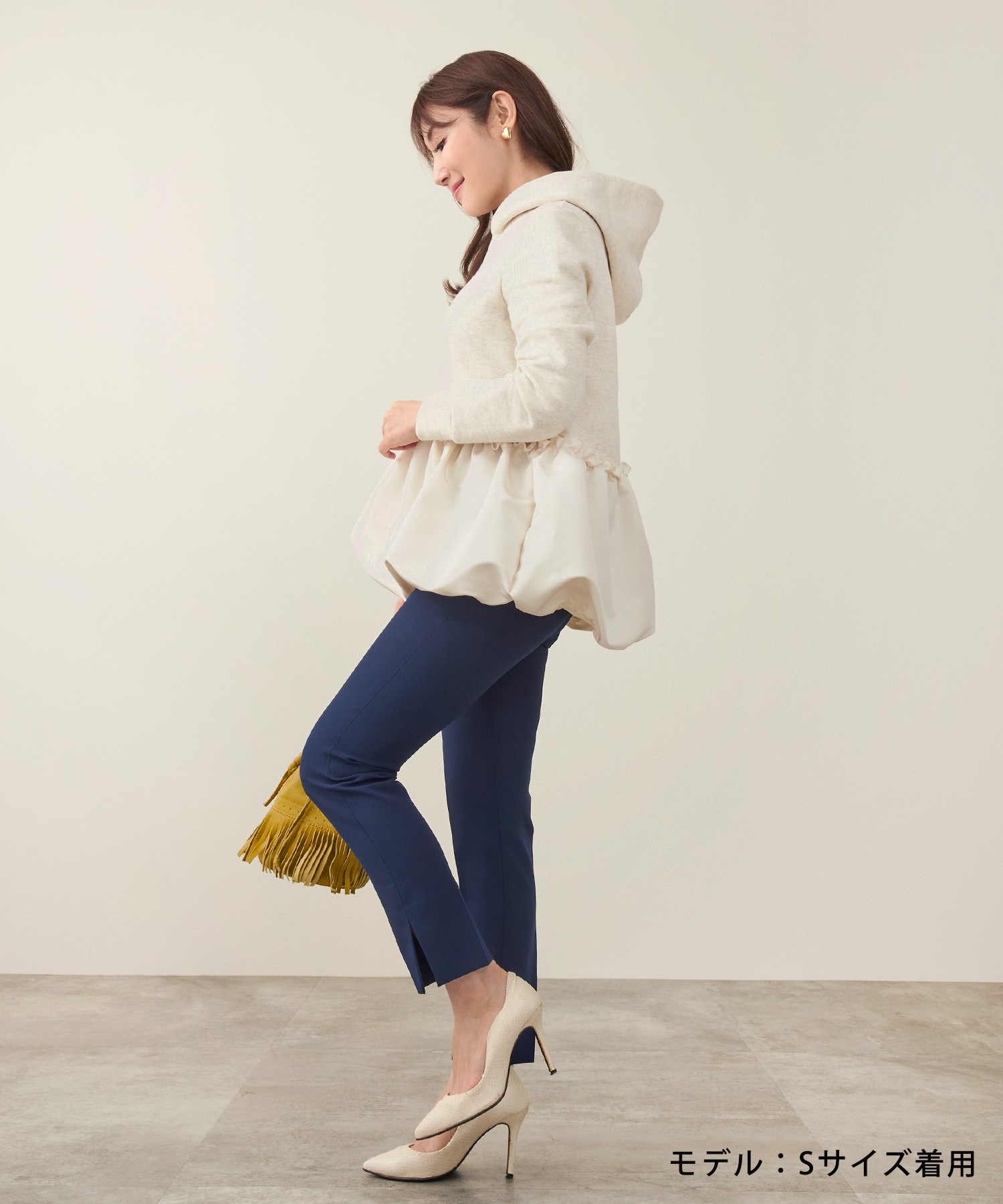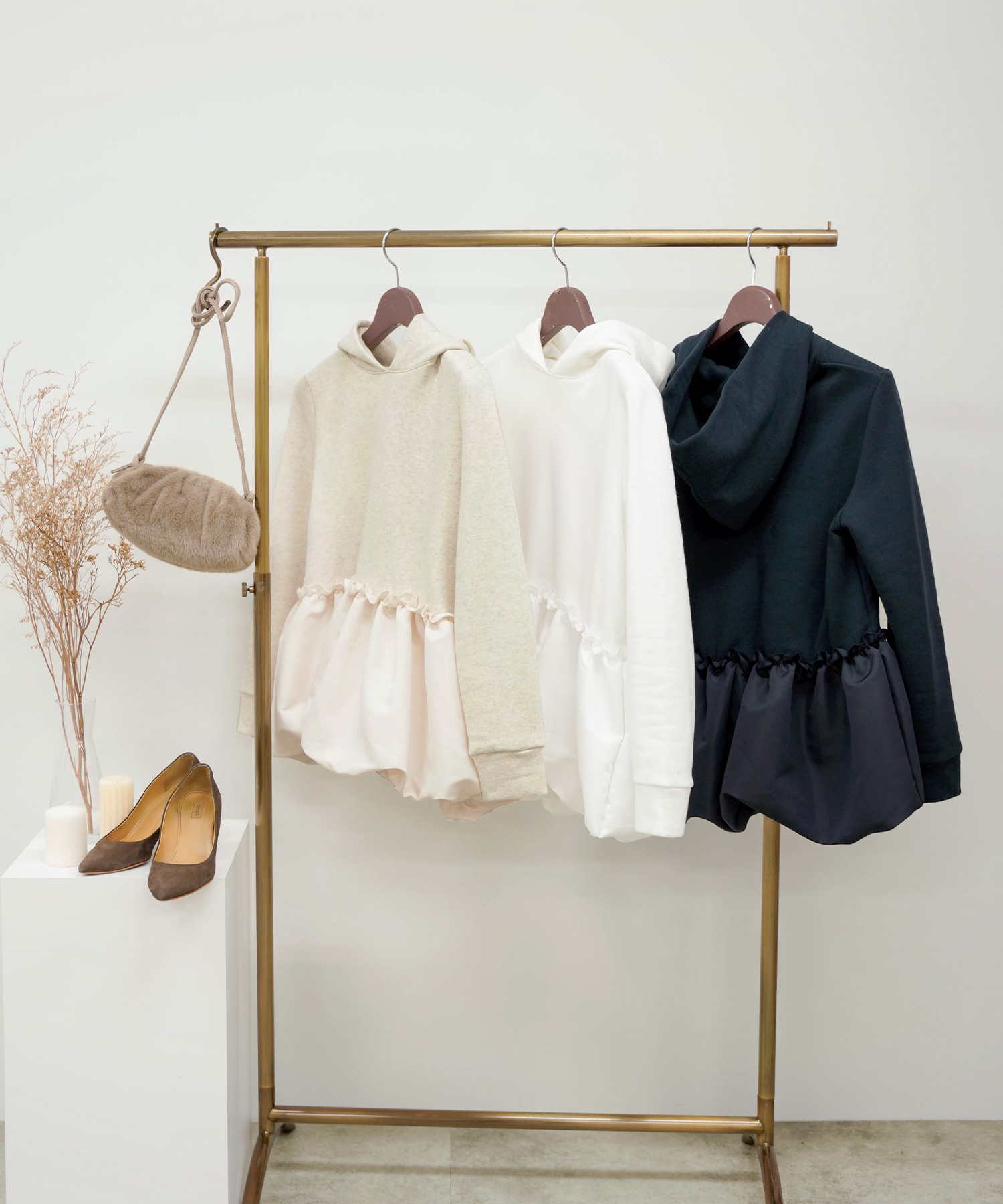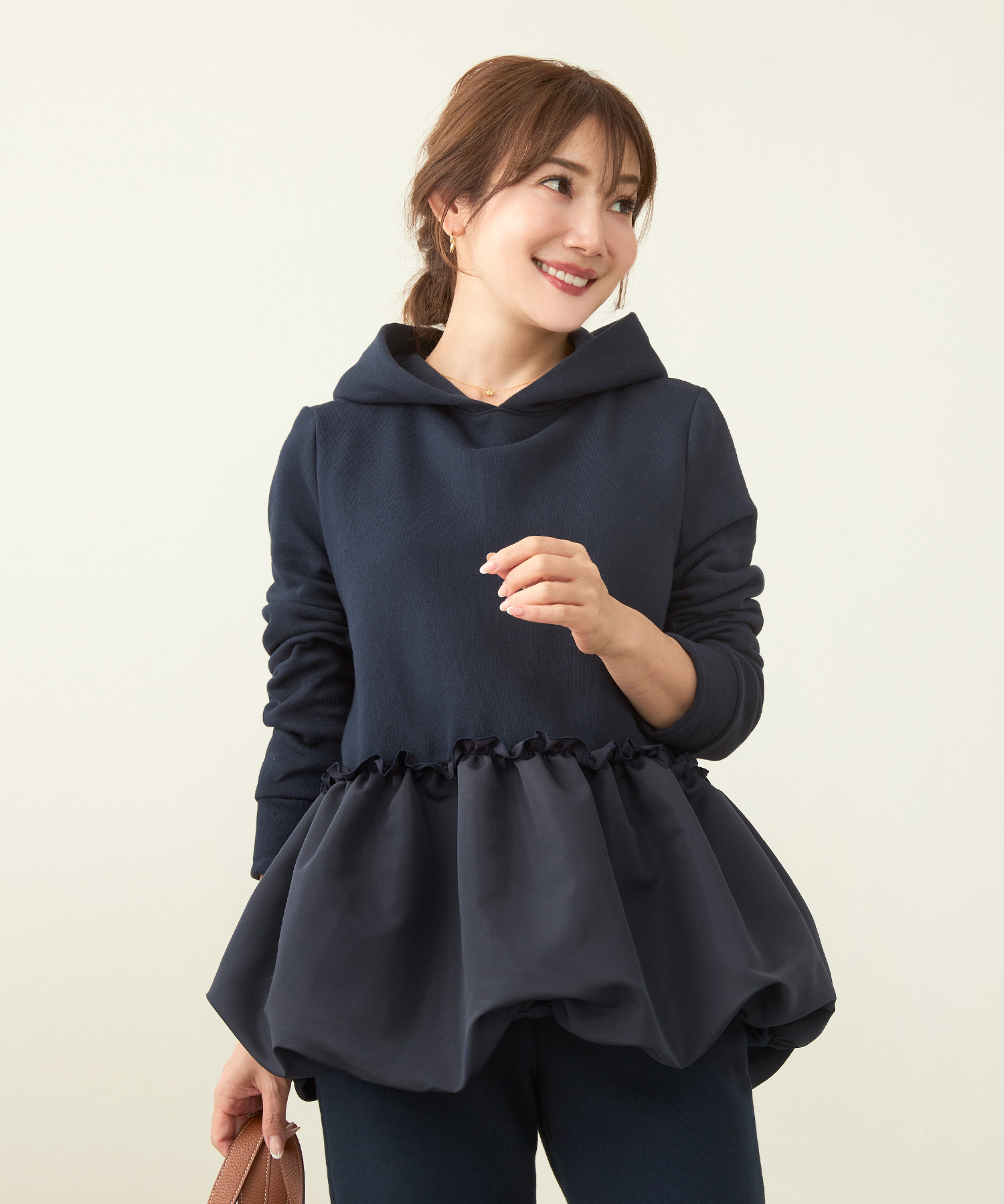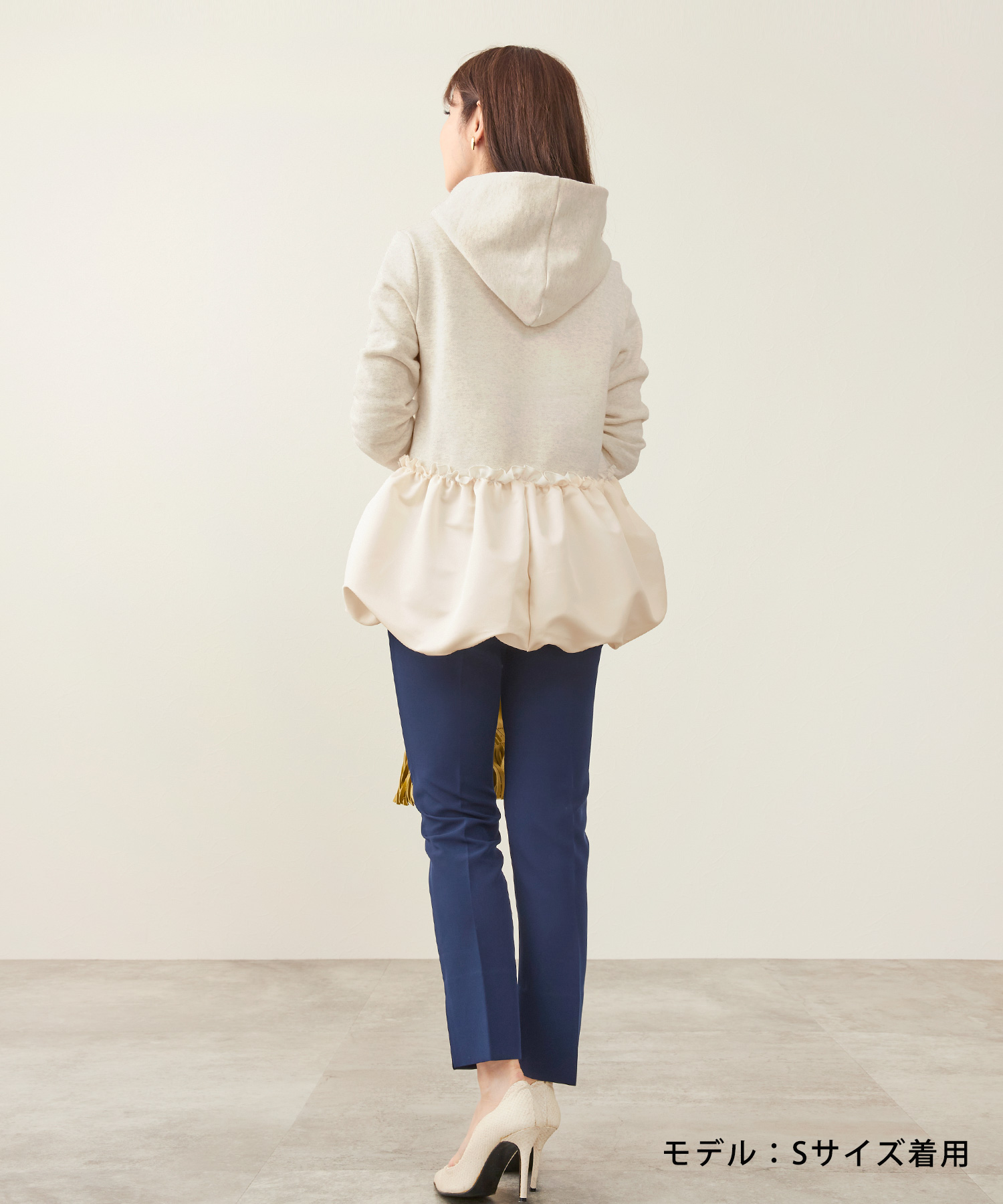この時期にぴったりの裏起毛素材を使用した暖かいフーディ―プルオーバー。バルーンヘムとフリルデザインがカジュアル過ぎず、おしゃれで女性らしい印象をあたえてくれます。手洗いが可能なので気軽に着用できワンマイルウェアにちょうどいいアイテム。