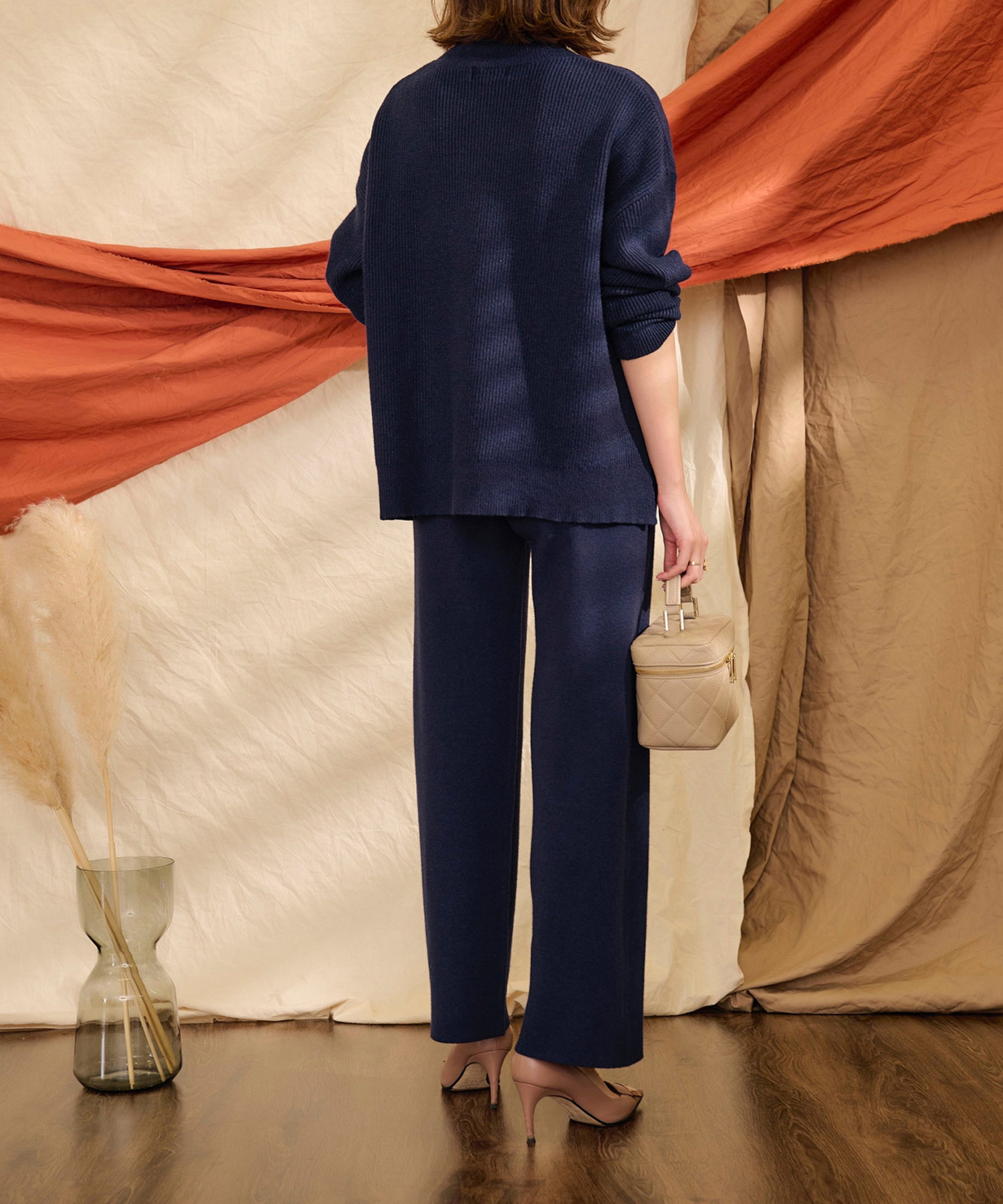リラックス感がありながら部屋着感がなく、そのまま着て外出できるダンボールニットのセットアップ。ハリ感のある素材がきちんと感を演出してくれるので、帰省だけでなく出張や旅行にもおすすめ。セットで持っていると何かと重宝します。