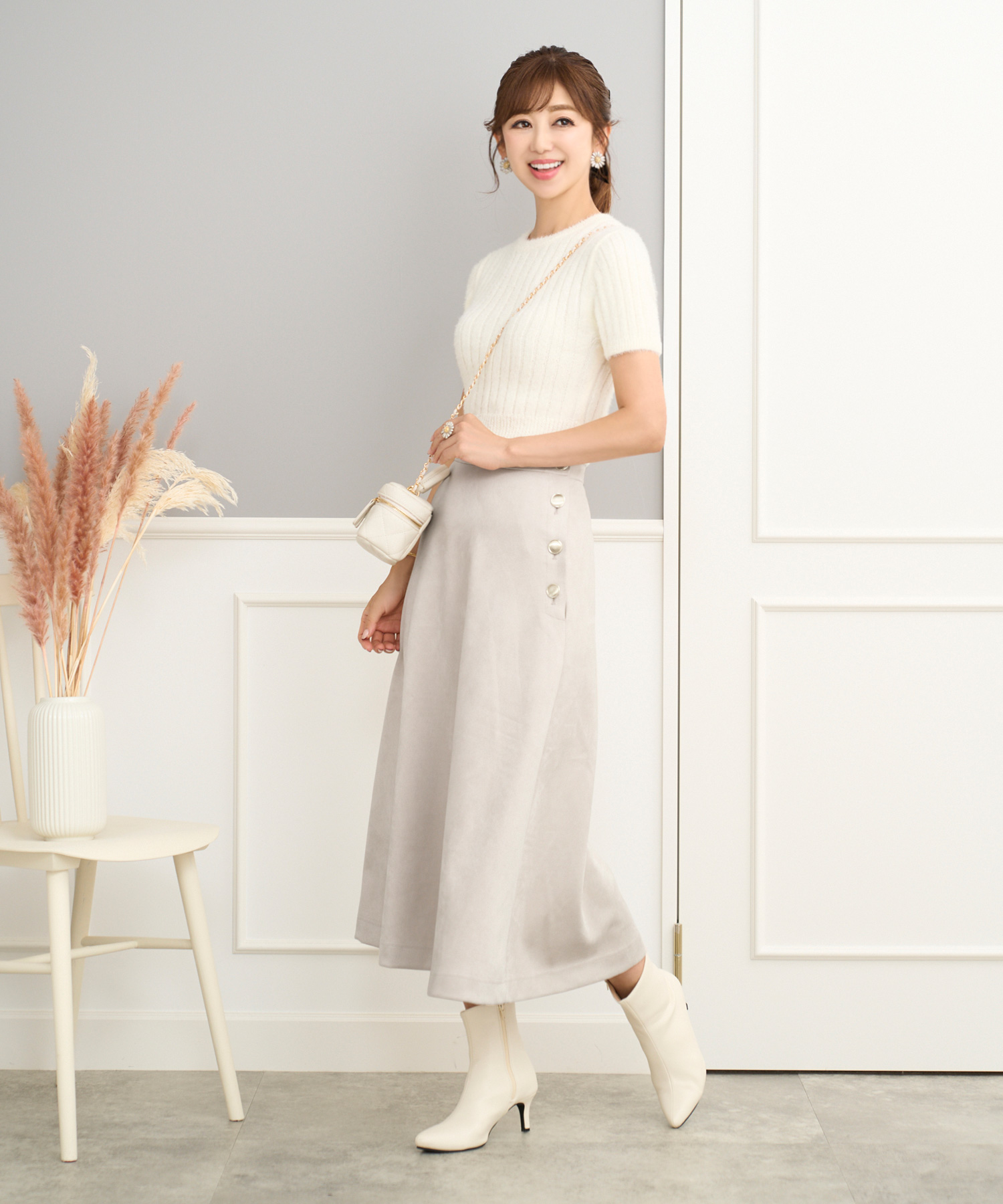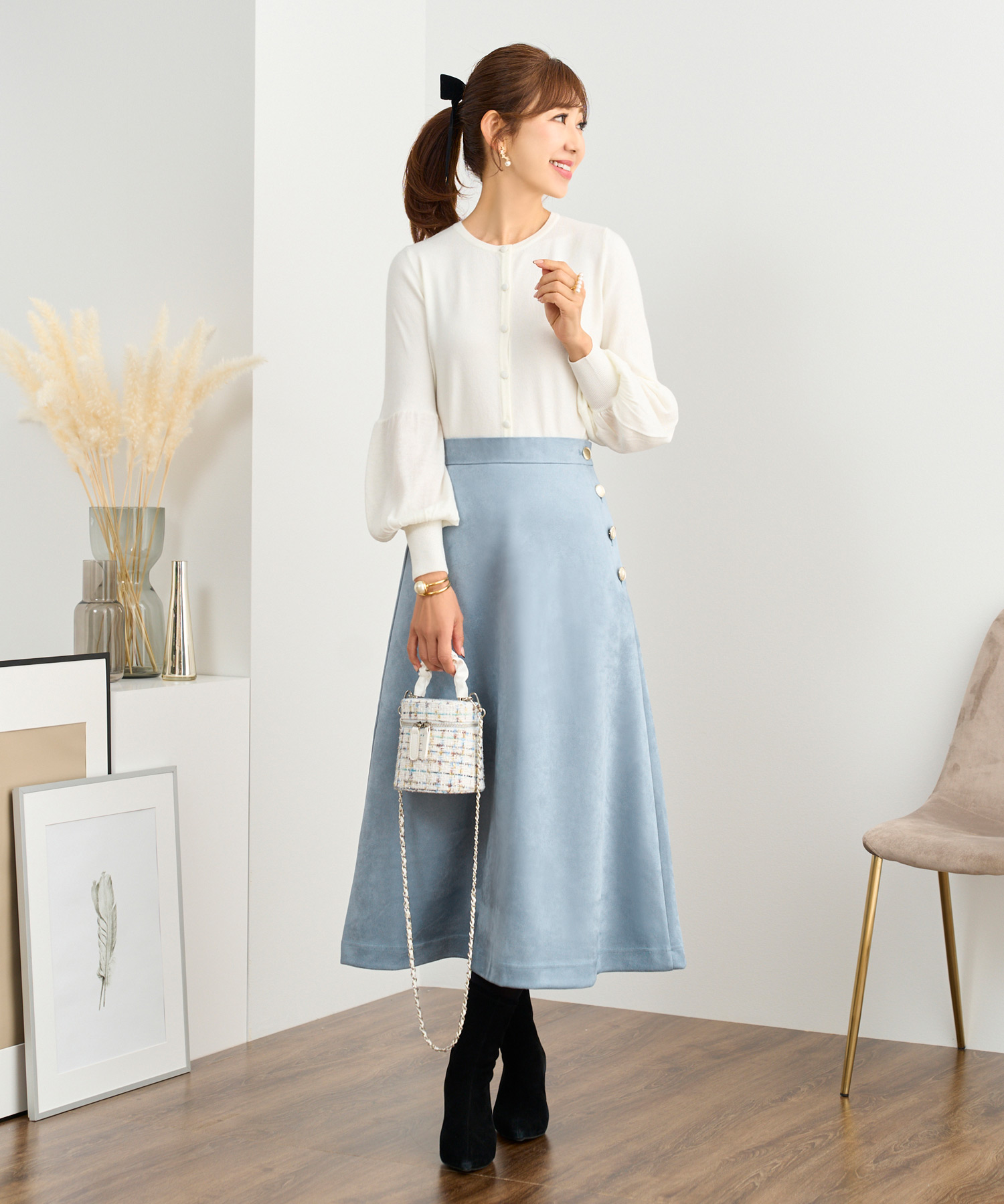清潔感は印象を左右する大事なポイント。白×サックスのさわやかな配色でグッと好感度も上がります。スカートは手洗い可能なスエードタッチ素材を使用しているので、汚れを気にしすぎず気兼ねなく履けるところも見逃せない!