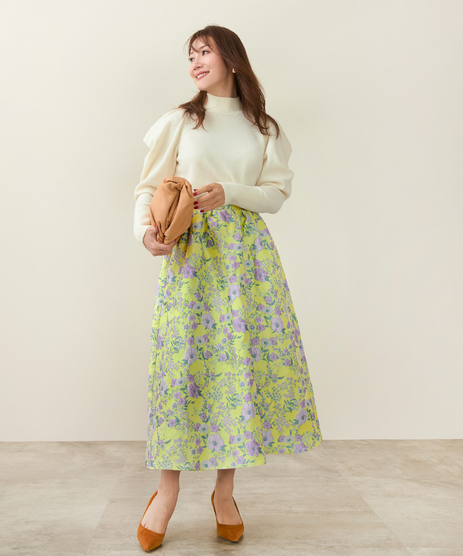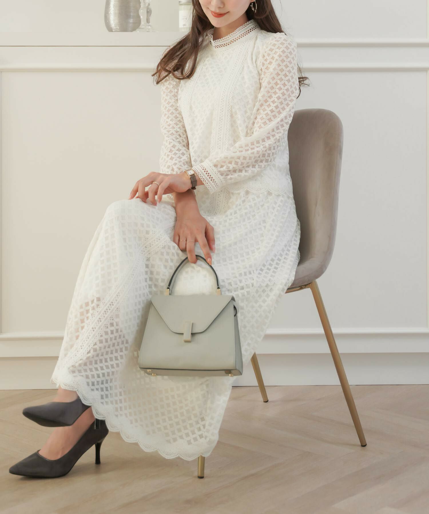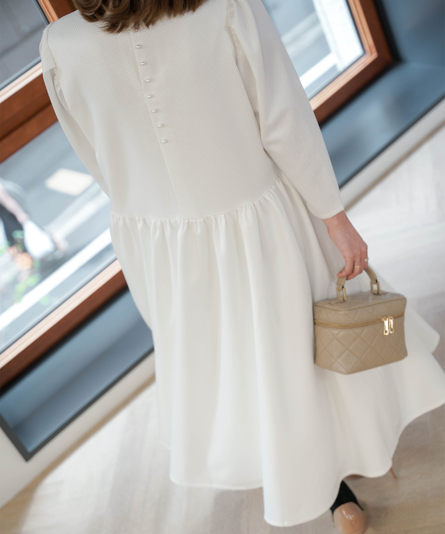 花モチーフをあしらった襟が顔周りをぱっと華やかに見せてくれるフレアニットワンピースです。ディナーで座っているシーンでも自然と襟元に視線が集まり、写真映えする印象に。伸縮性のあるリブニットがやさしくフィットし、長時間の着席シーンでも窮屈感なく快適に過ごせます。