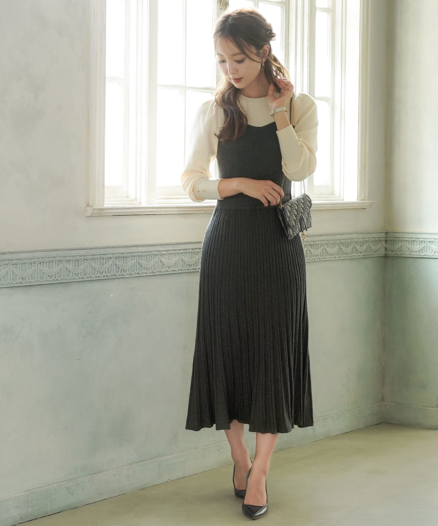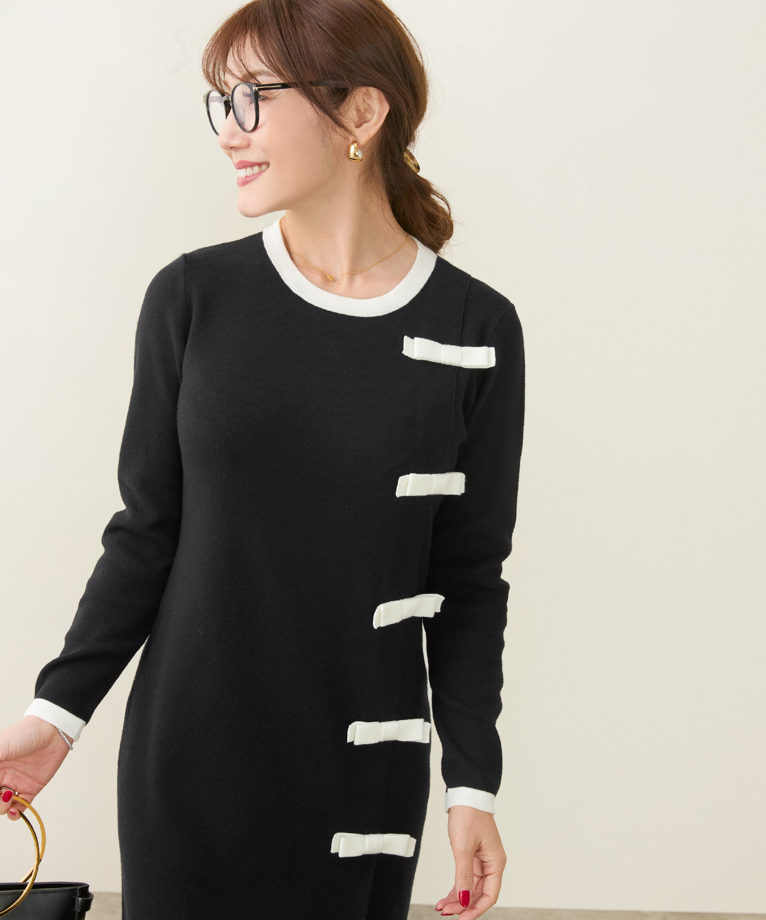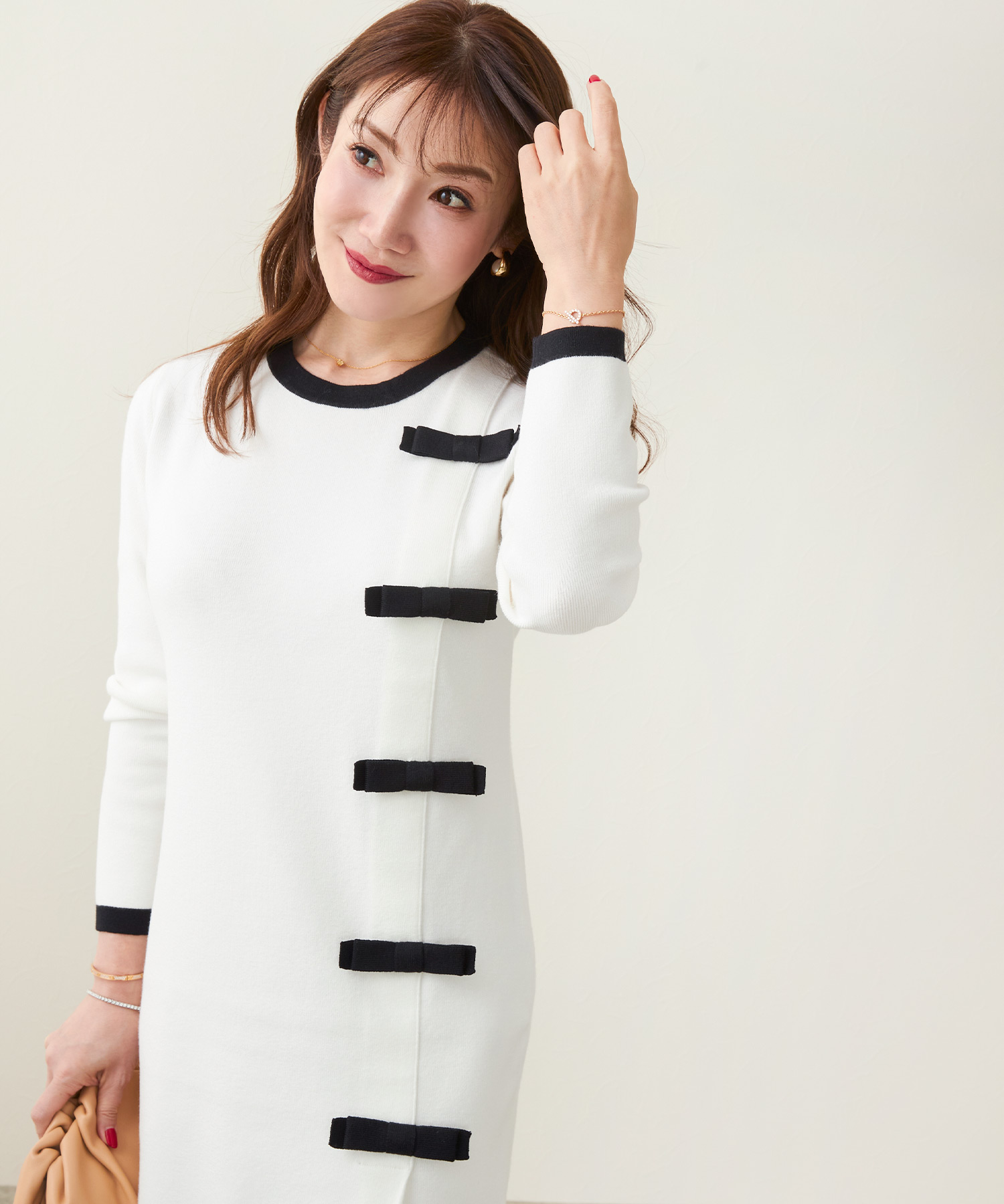 伸縮性のあるもちっとしたニットで、クリスマスディナーでもリラックスして過ごせる着心地です。プリーツが揺れるフレアシルエットとベア切替が女性らしさを引き立て、胸元のリボンが“大人可愛い”アクセントに。ロマンティックなディナーデートにおすすめのリボンニットワンピースです。