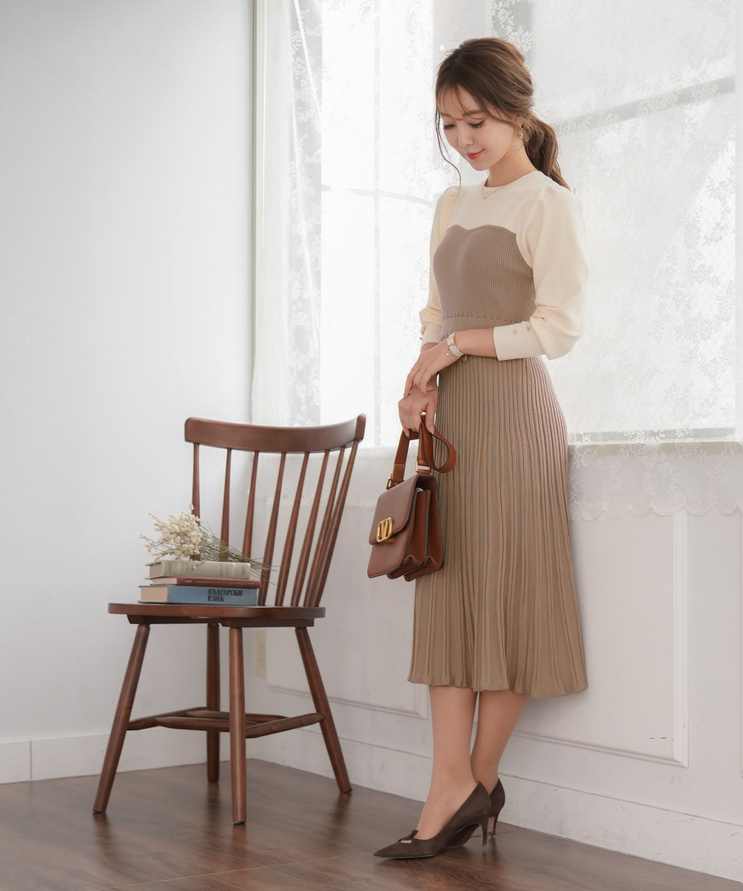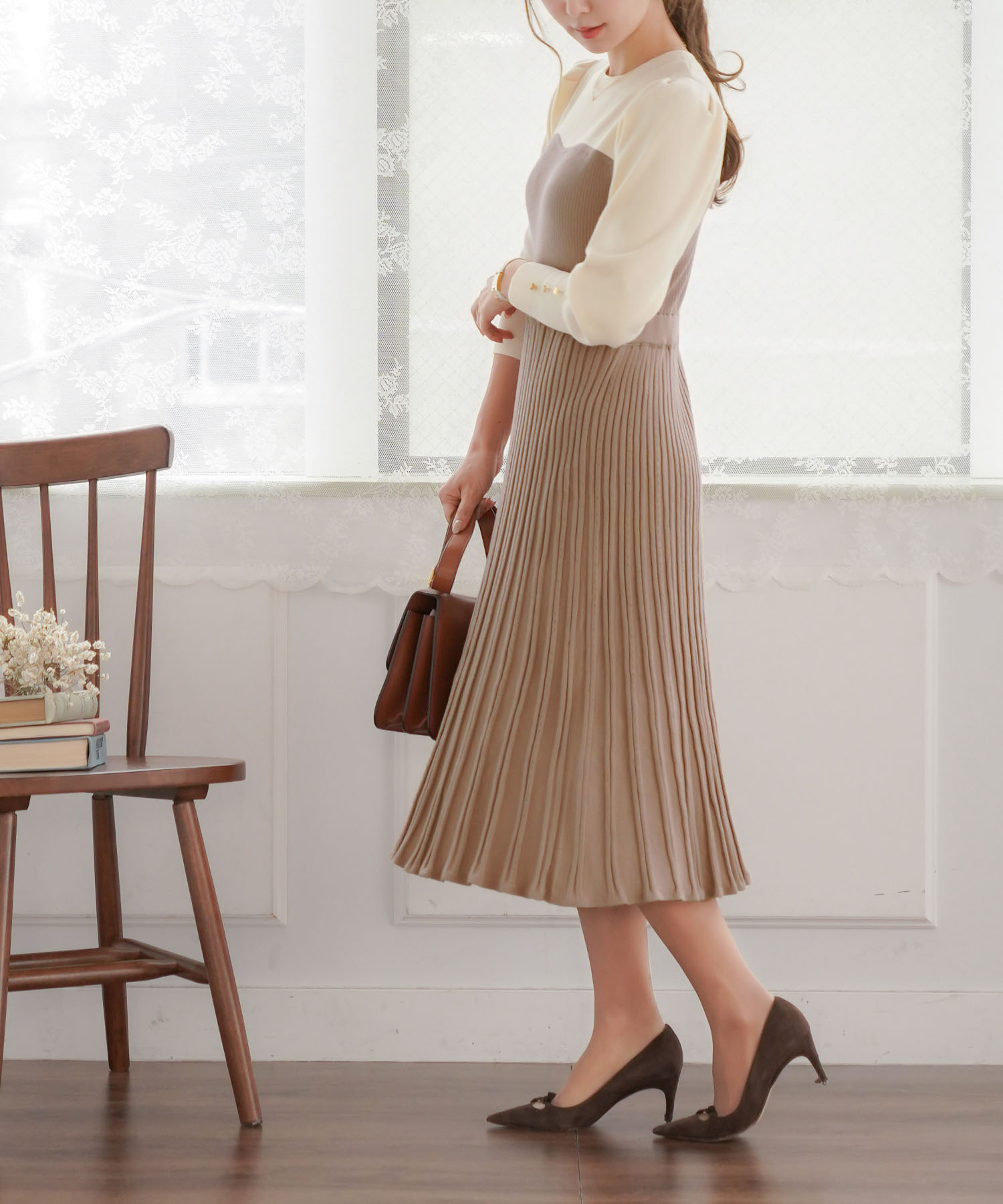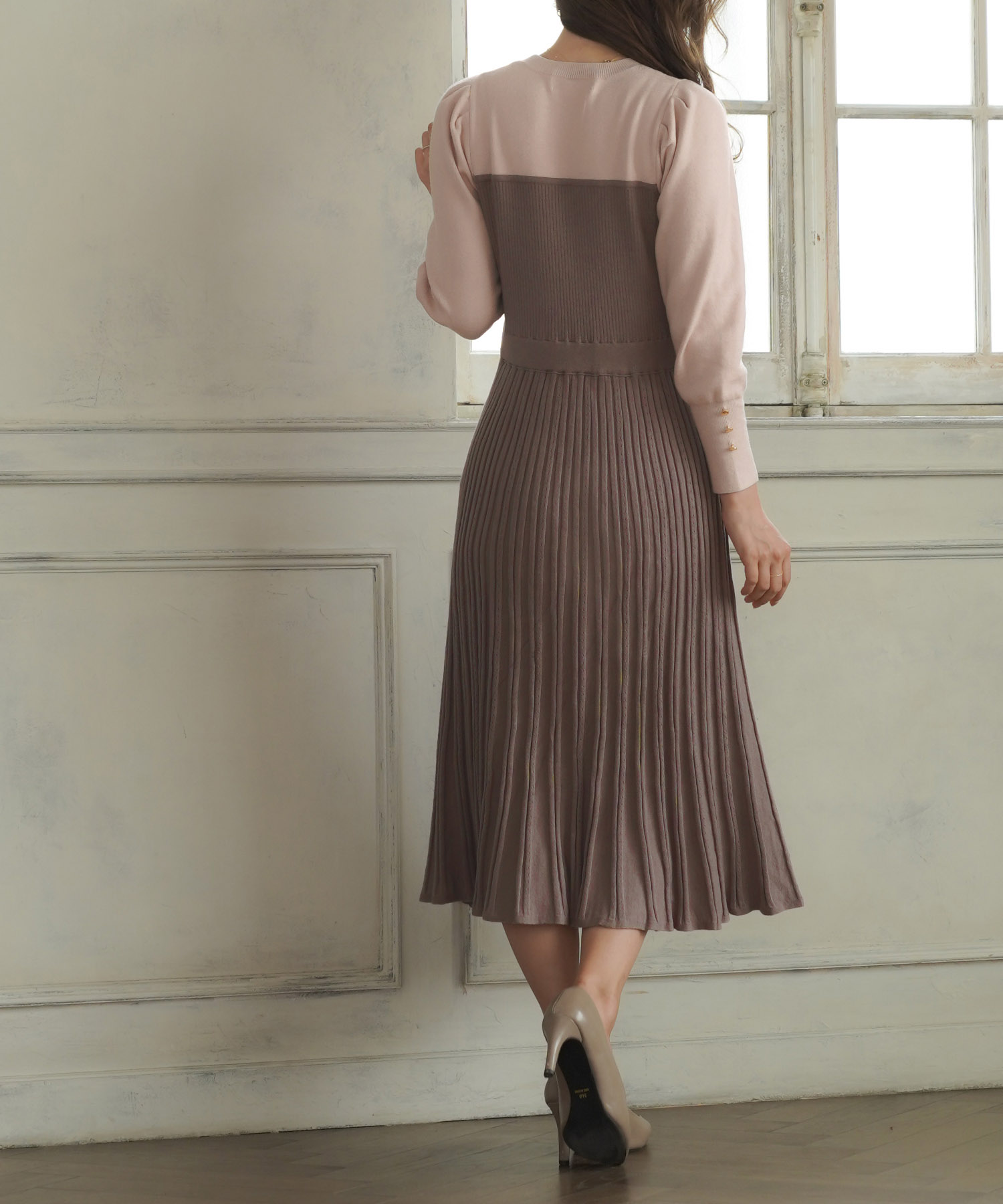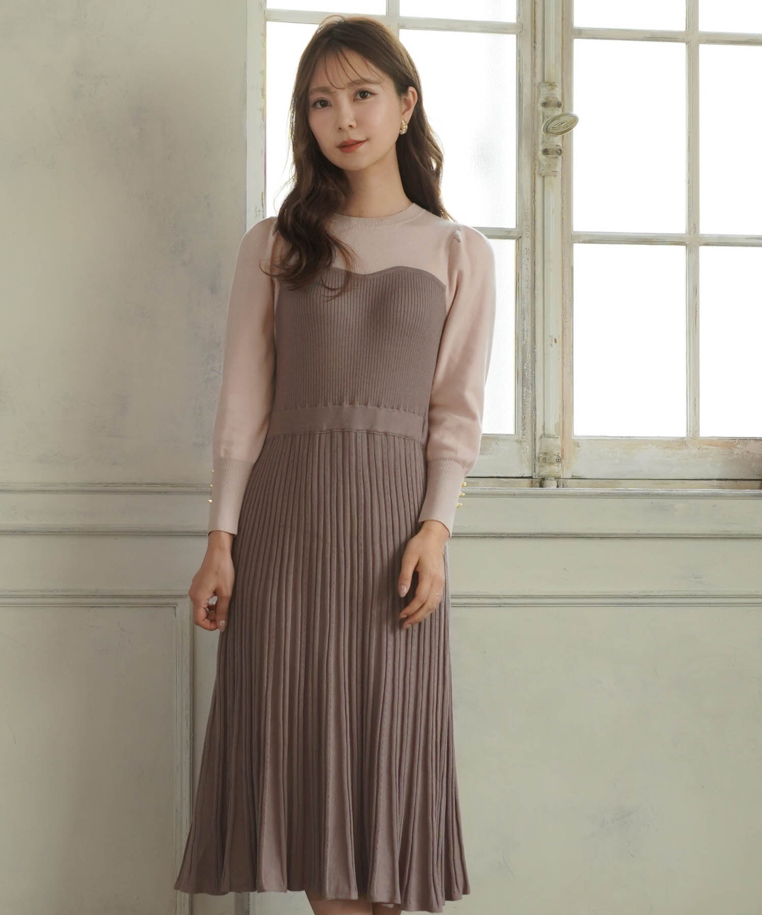 伸縮性のあるもちっとしたニットで、クリスマスディナーでもリラックスして過ごせる着心地です。プリーツが揺れるフレアシルエットとベア切替が女性らしさを引き立て、胸元のリボンが“大人可愛い”アクセントに。ロマンティックなディナーデートにおすすめのリボンニットワンピースです。
