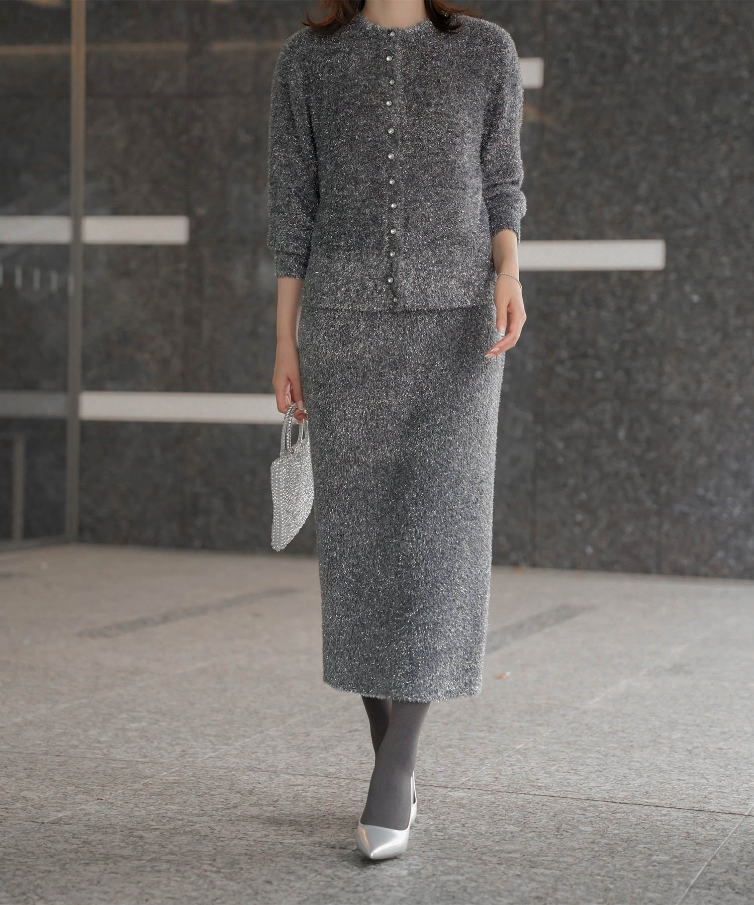 ふんわりとしたシャギーニットにラメを織り交ぜた、さりげなく華やかなタイトスカートです。歩くたびにきらりと光を拾い、シンプルなニットを合わせるだけでもディナーシーンに映える装いに。ウエストまわりはすっきりと、ヒップラインは優しく包み込むシルエットで、大人の女性らしさを引き立ててくれます。