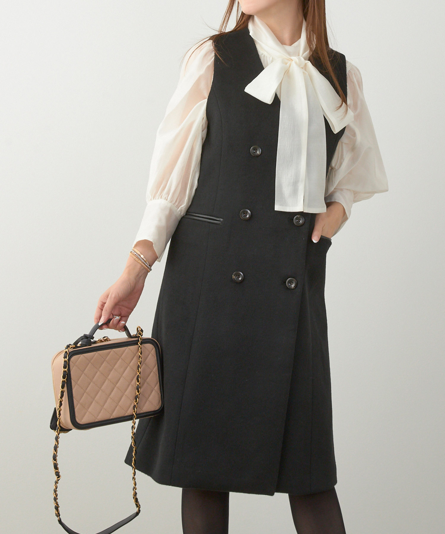 ダブルボタンがクラシカルな印象を与えるジャンパースカート。インナー次第で雰囲気を変えられる2WAYデザインで、タートルニットを合わせればきちんと感のあるディナースタイルに、ブラウスを合わせればよりフェミニンな装いに。程よく広がるシルエットがスタイルアップも叶えてくれます。
