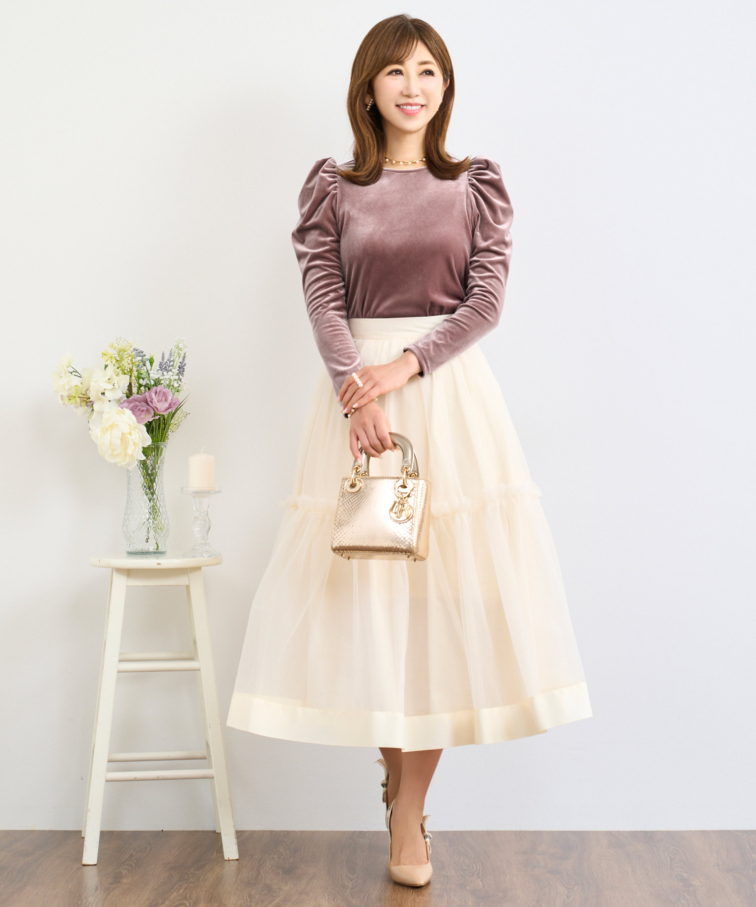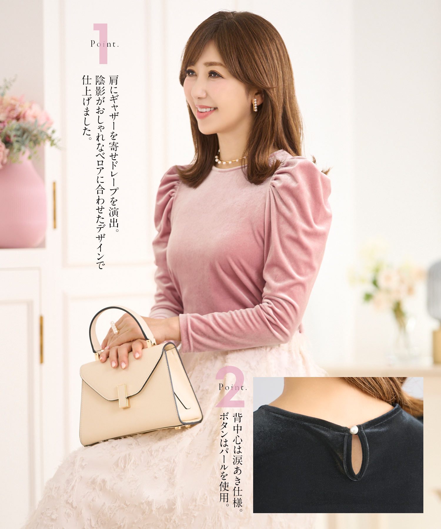 肌ざわりが良く、上品な光沢を放つベロア素材を使用したトップスです。さりげなくドレスアップ感の出るエレガントなデザインで、少しきちんと見せたいディナーシーンにもおすすめ。スカートにもパンツにも合わせやすく、どちらのスタイルも優雅な印象に仕上げてくれます。