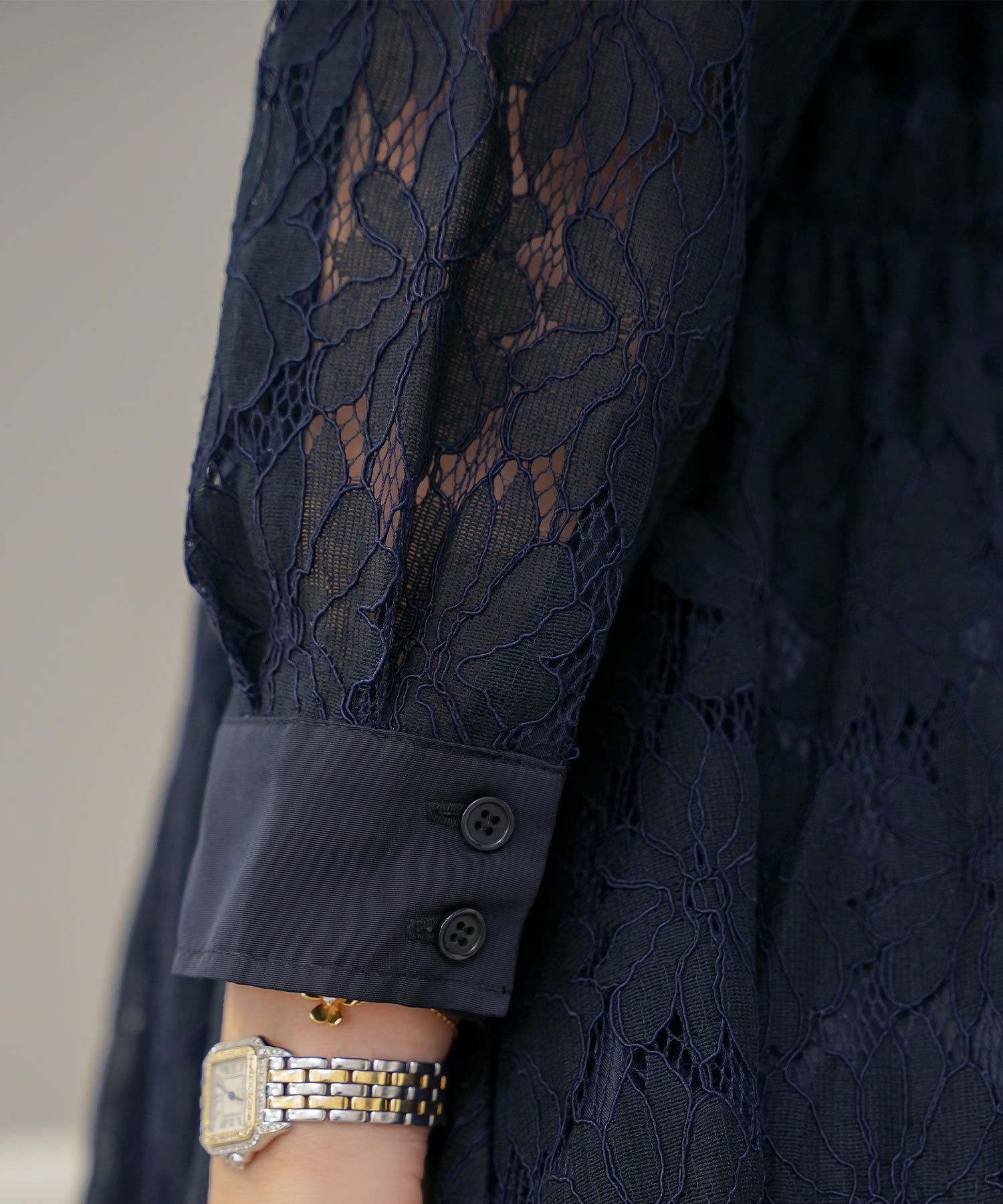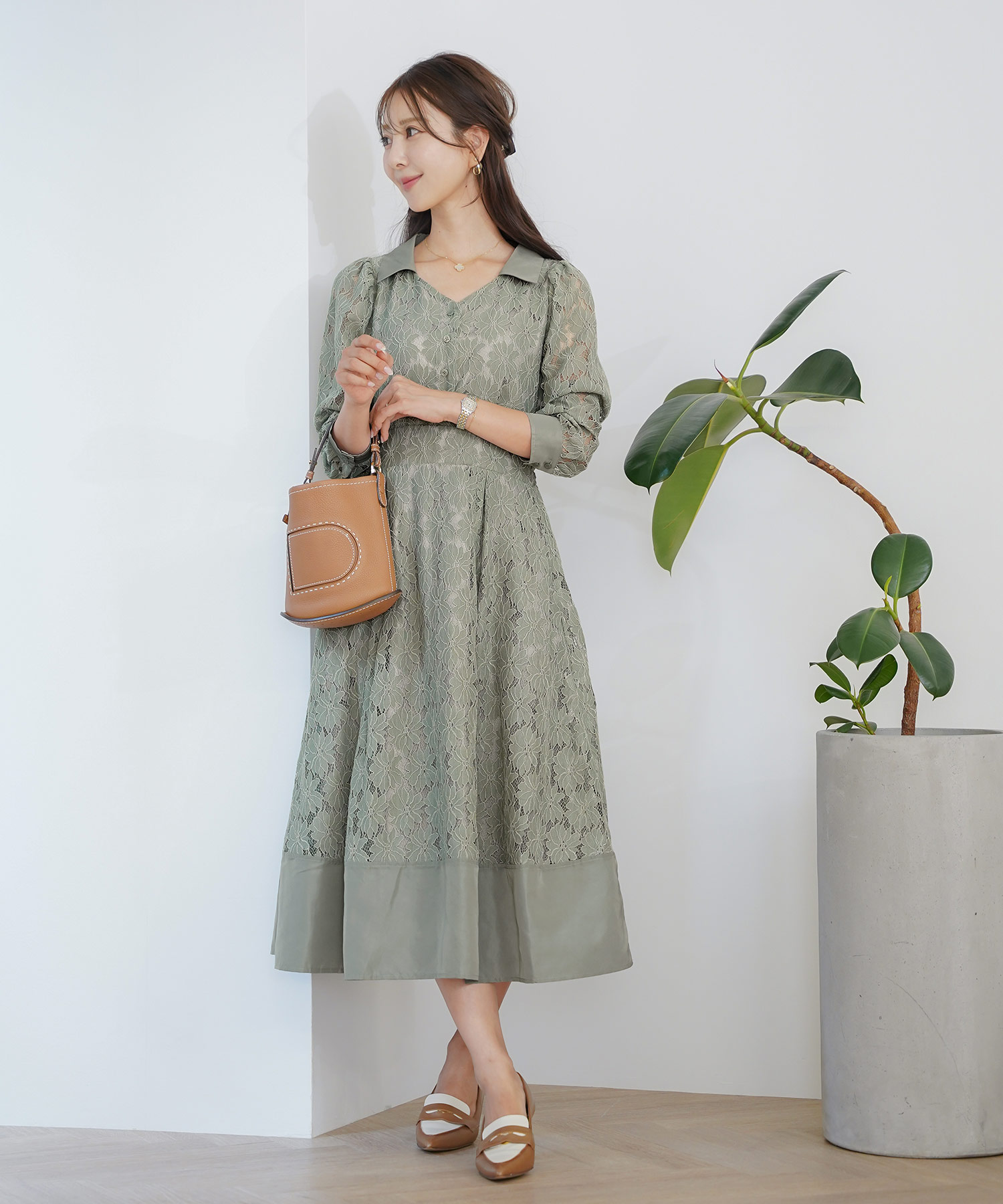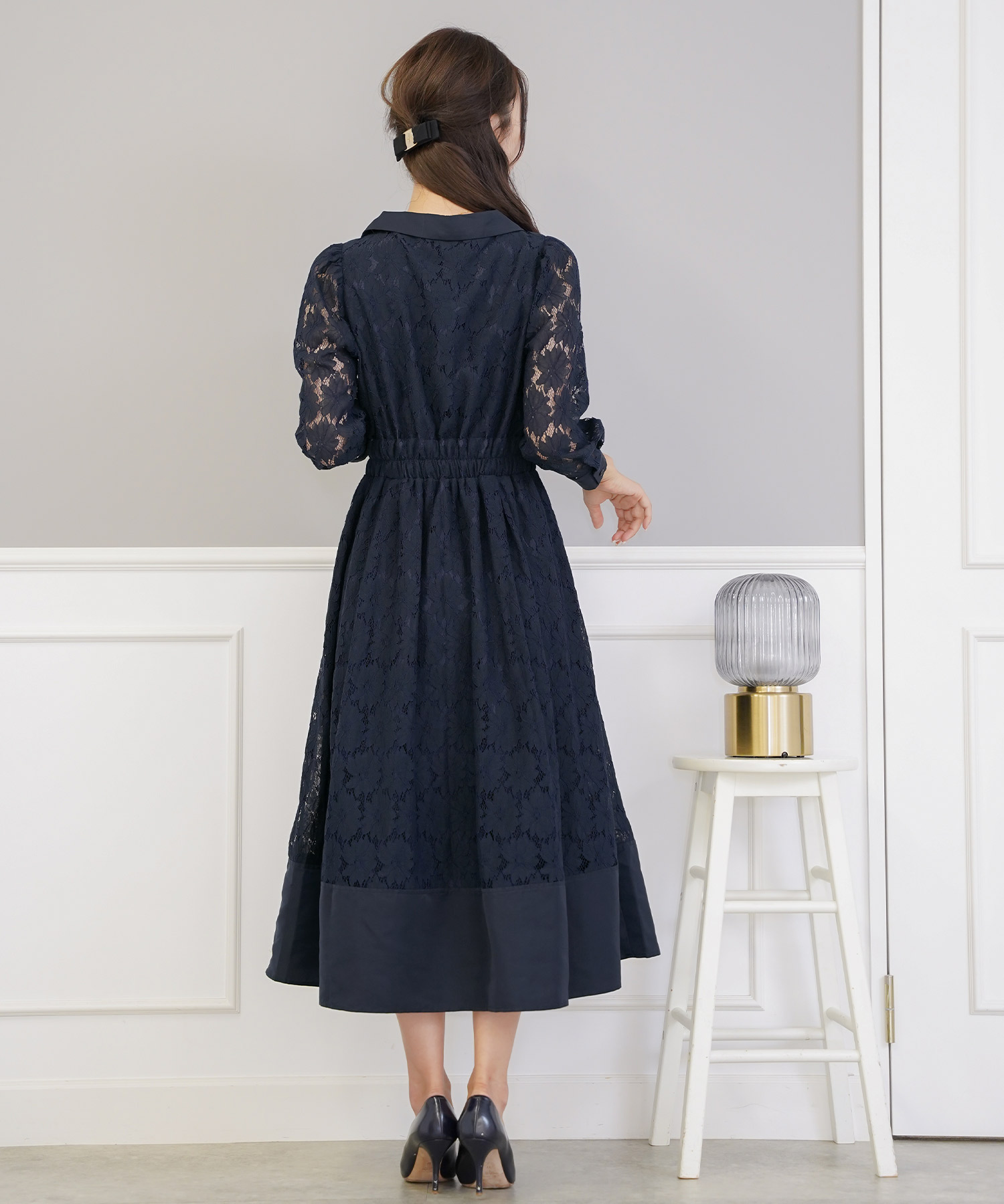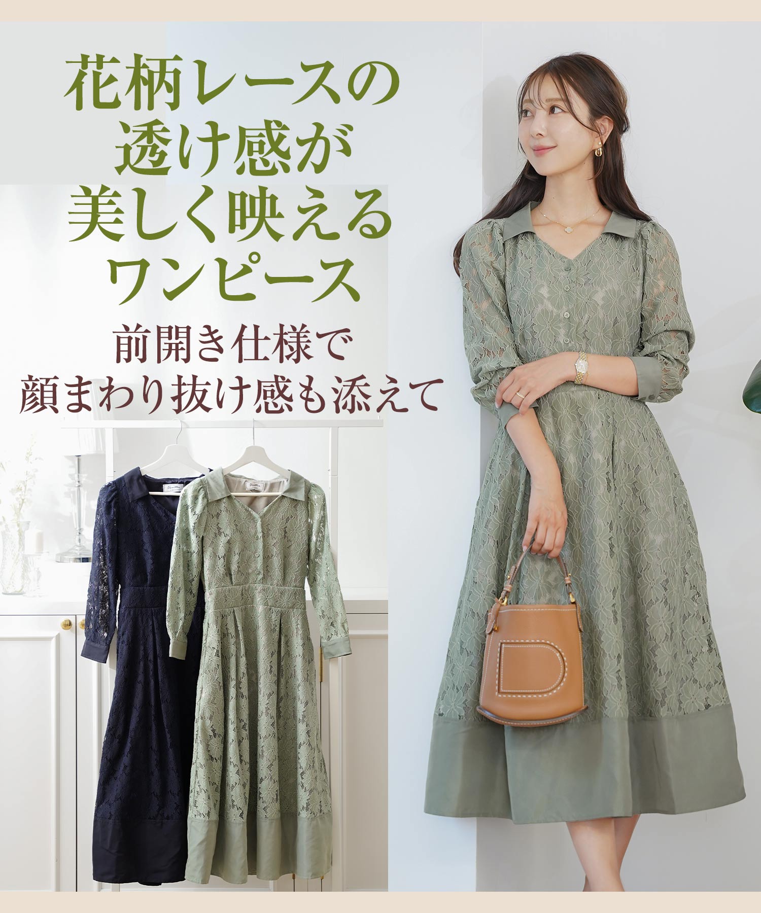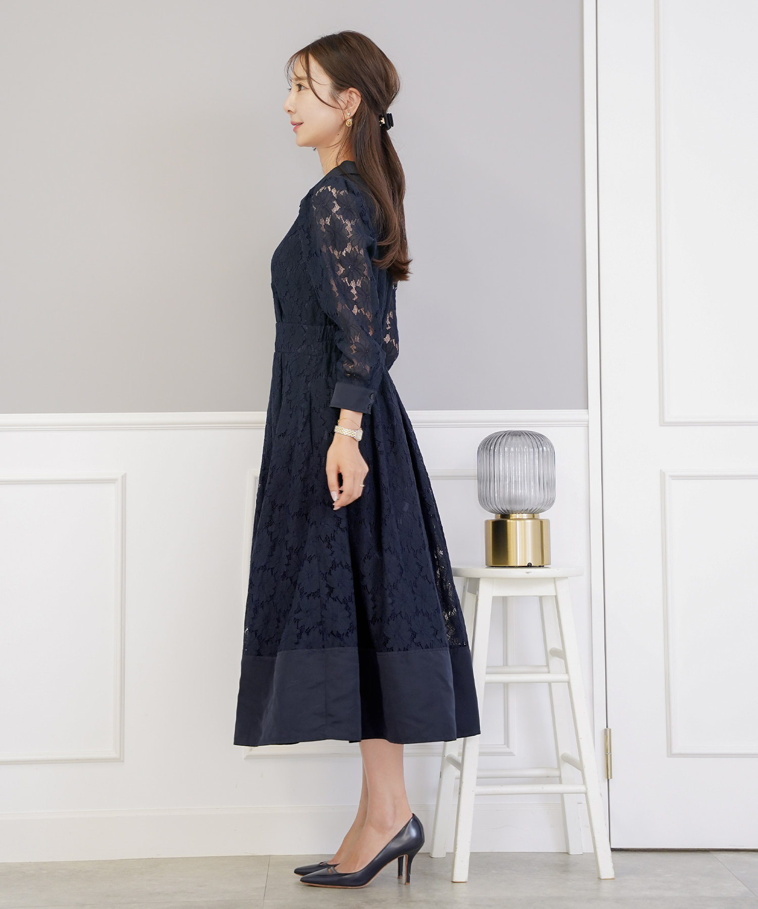 花柄レースの透け感に、裾タフタでメリハリを。開襟&ハイウエストで上半身はすっきり、タックフレアが自然な細見えを叶えます。前開きで着替えも簡単、後ろウエストゴムで長時間の会食も快適です。
