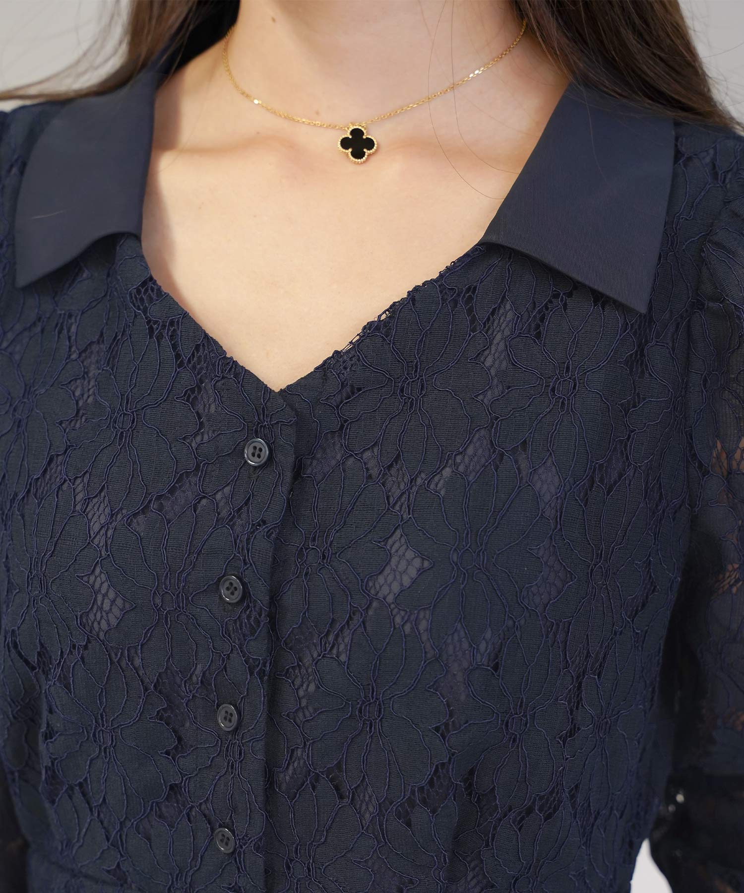 レースは凛として、裾タフタは艶やか。開襟で顔周りはぱっと明るく、ハイウエスト+タックでスタイル良く見せる。前開きで着替えはノンストレス、後ろゴムで長時間もラク。立体感が写真にも映え、30代の“きちんと華やぎ”に最適な一枚です。