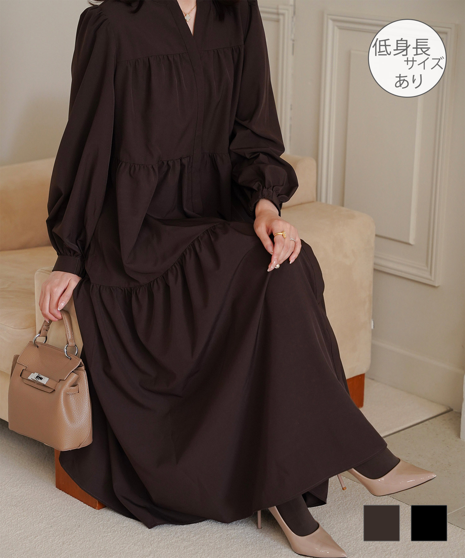 とろみ素材のティアードが歩くたびにふわり。Aラインで気になる部分をさりげなくカバーしつつ、V開きが顔まわりをすっきり見せます。両脇ポケットや袖口ゴムで実用性も◎。淡色にはネイビー小物でひと締め、ダーク色はパールを一点。