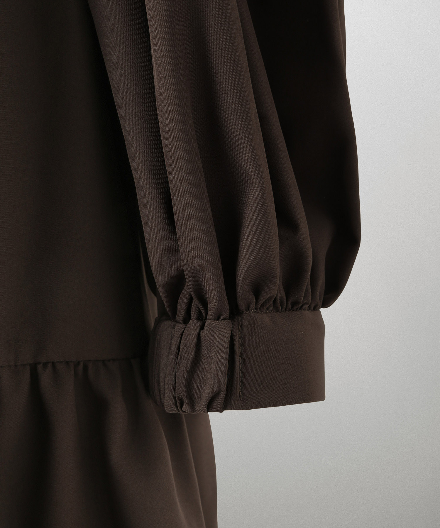 ベルスリーブのサテンが指先を美しく照らし、身頃のマットな質感が全体を凛と整えます。キーネックで顔色は明るく、シワになりにくい生地で移動や着席が続く日も安心。