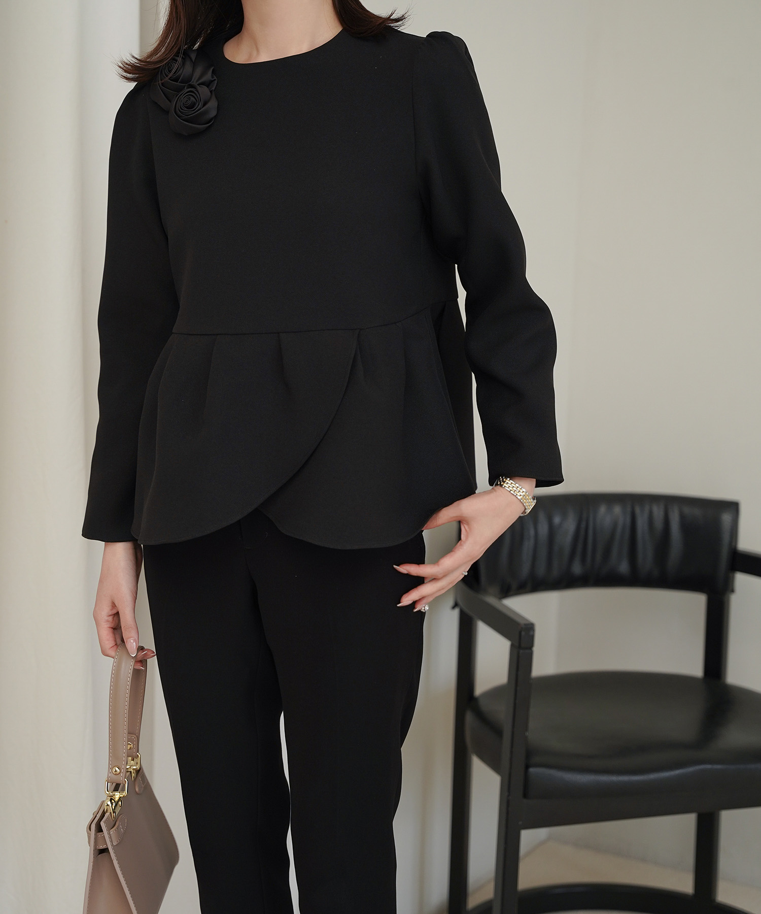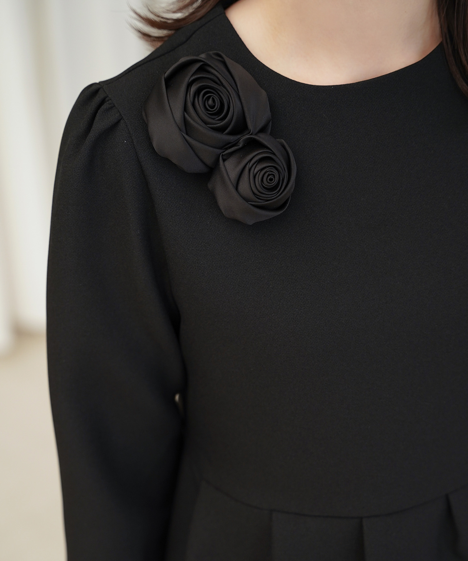 肩先の立体バラが表情まで華やかに。チューリップヘムの重なりが縦ラインをつくり、気になる腰・ヒップを上手にフォロー。ブラックは端正、ホワイトは清楚。