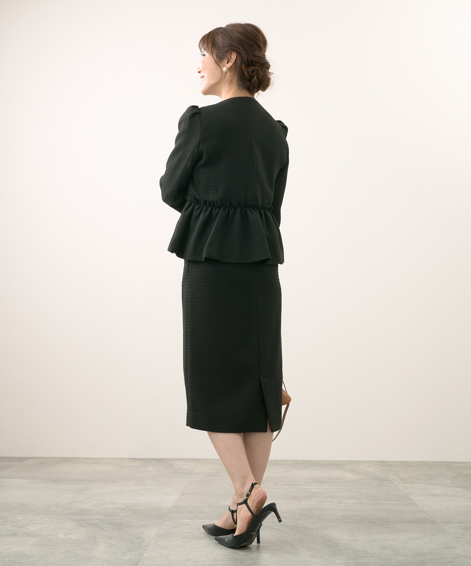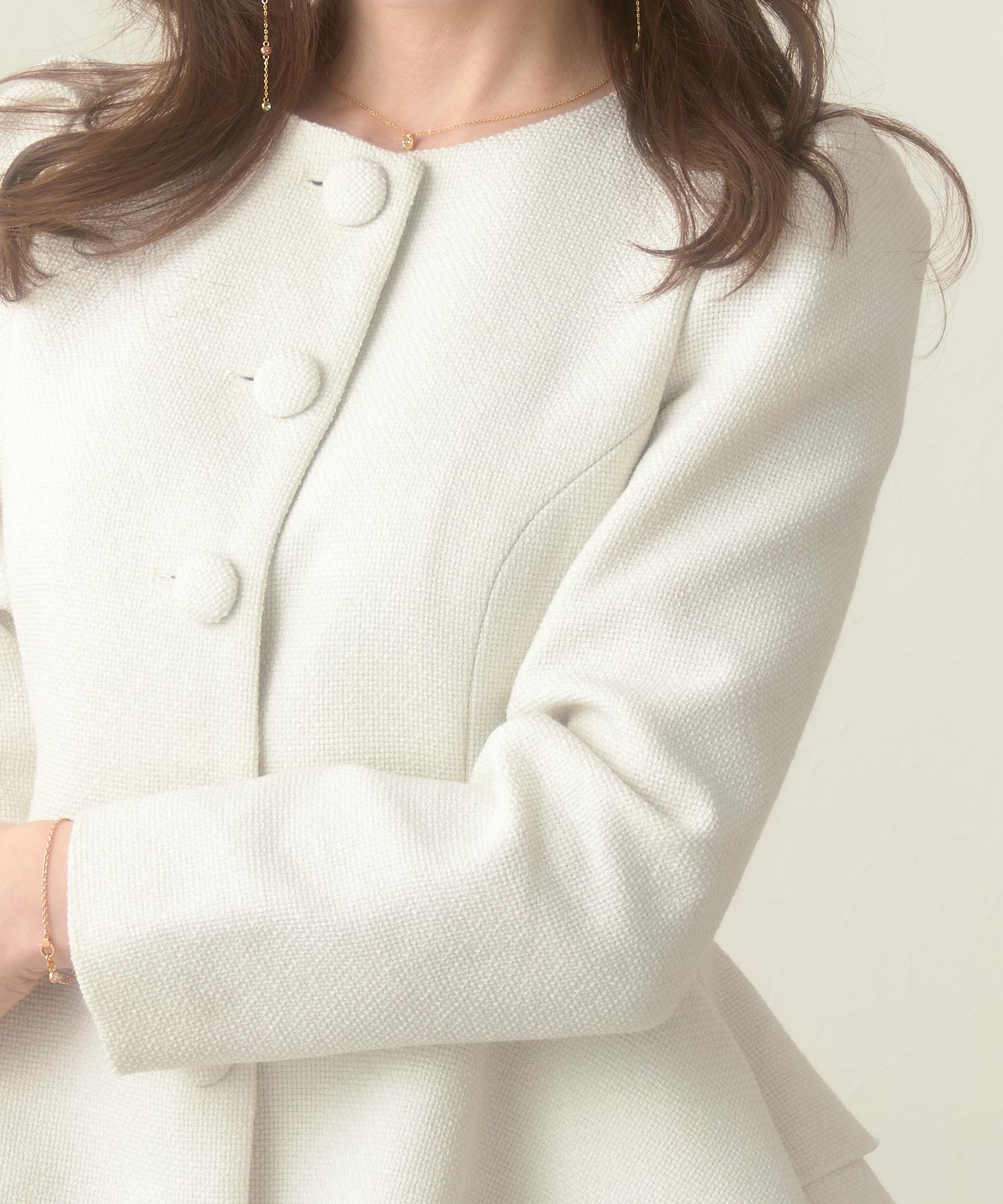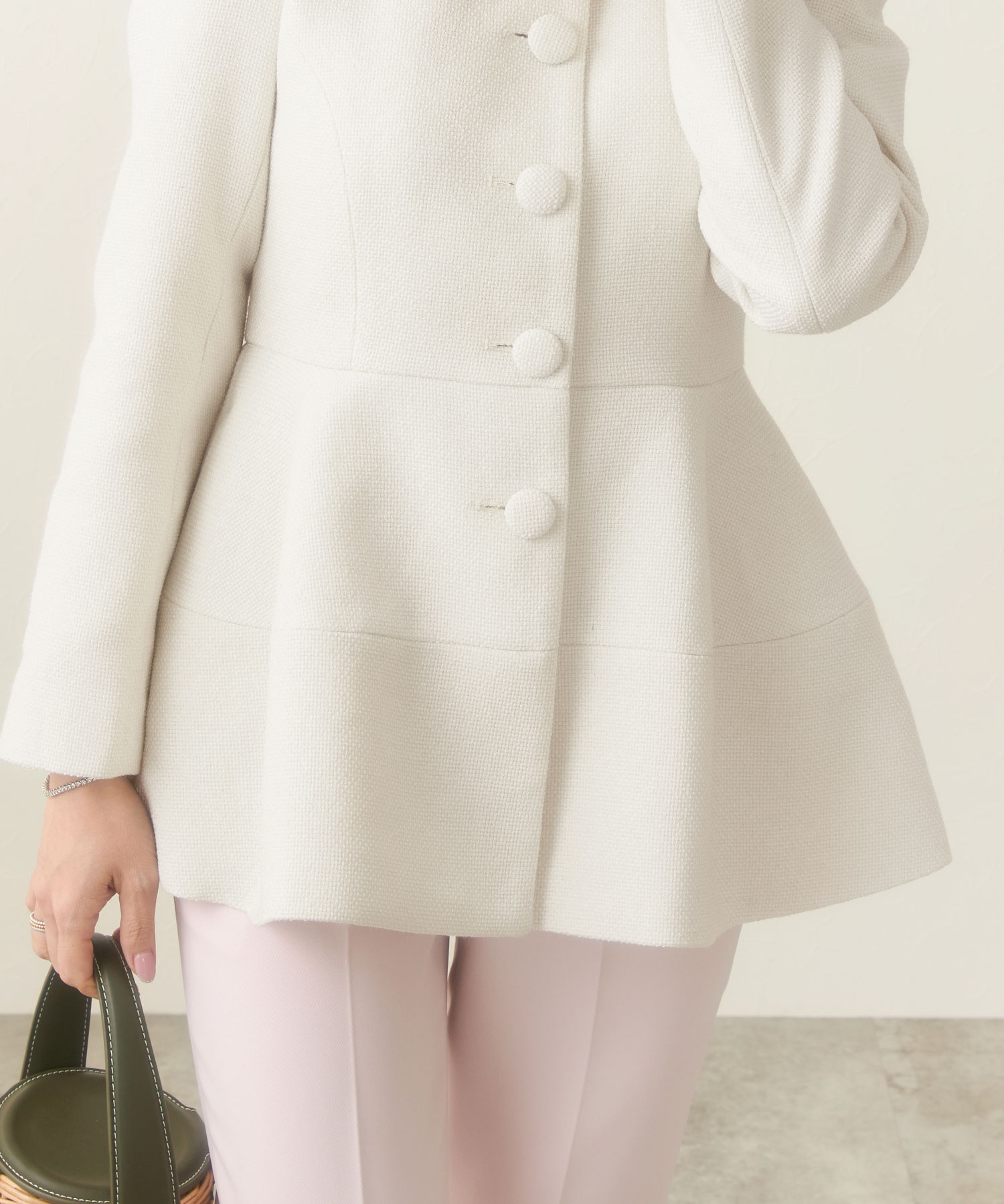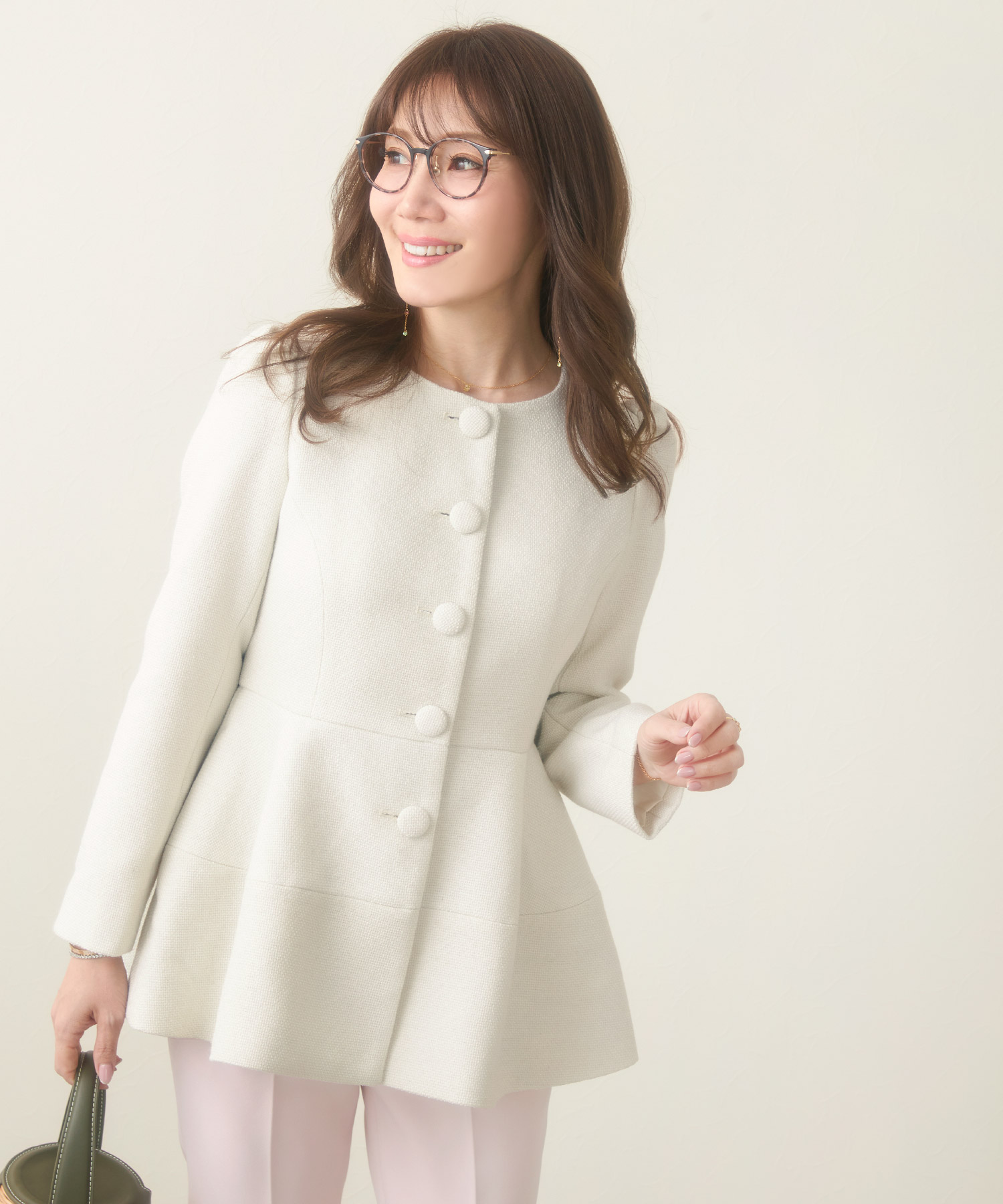 卒業式にもぴったりの「ペプラムコクーン くるみボタン ジャケット」。大きなくるみボタンとバックフリルが上品なアクセントに。裏地付きで寒さ対策も万全、春先まで使える万能アイテムです。きちんと感と女性らしさを兼ね備えたデザインで、季節感を意識した卒業式コーデが完成します。