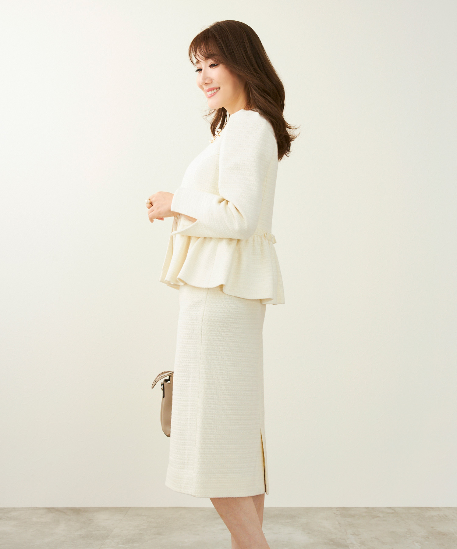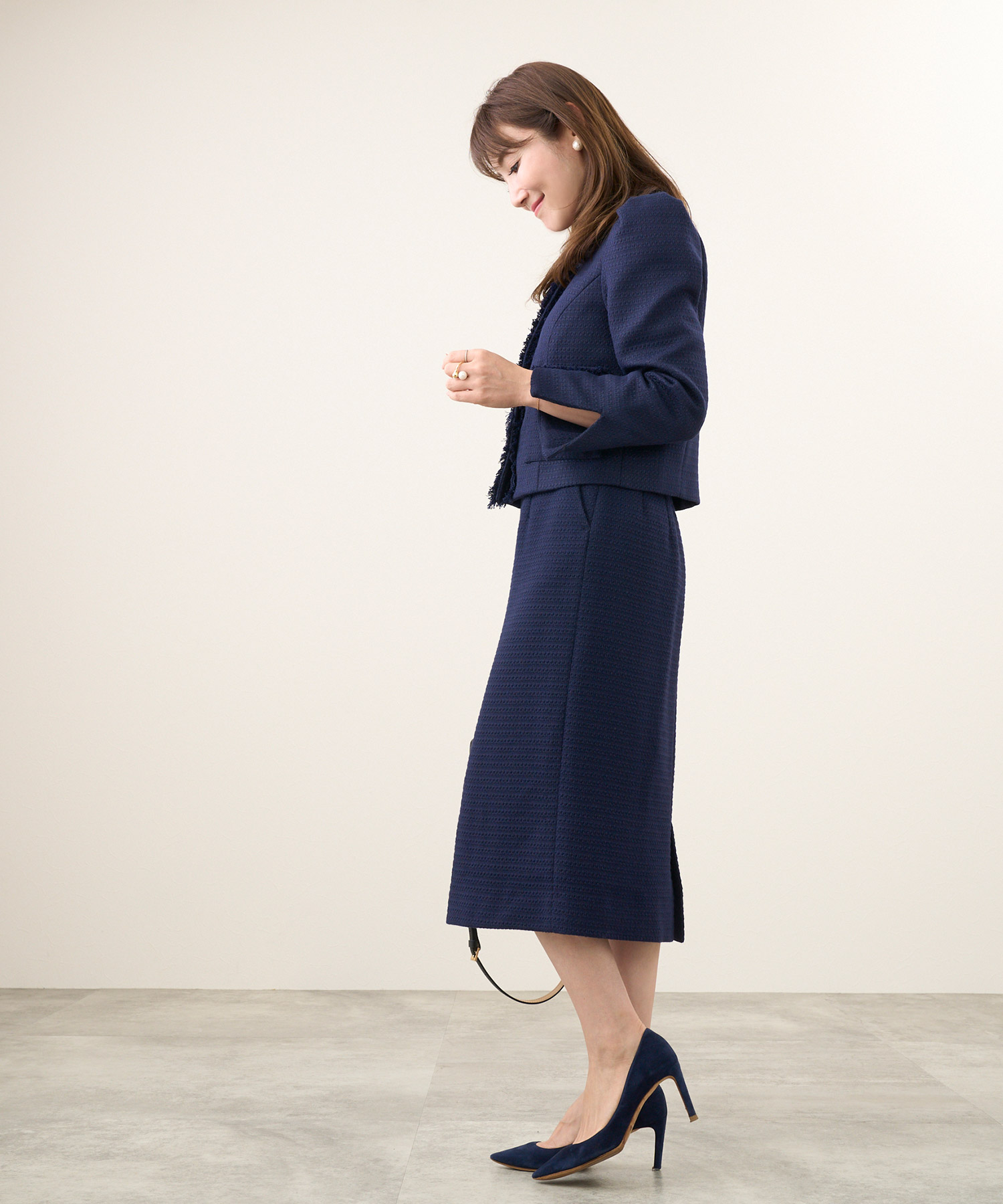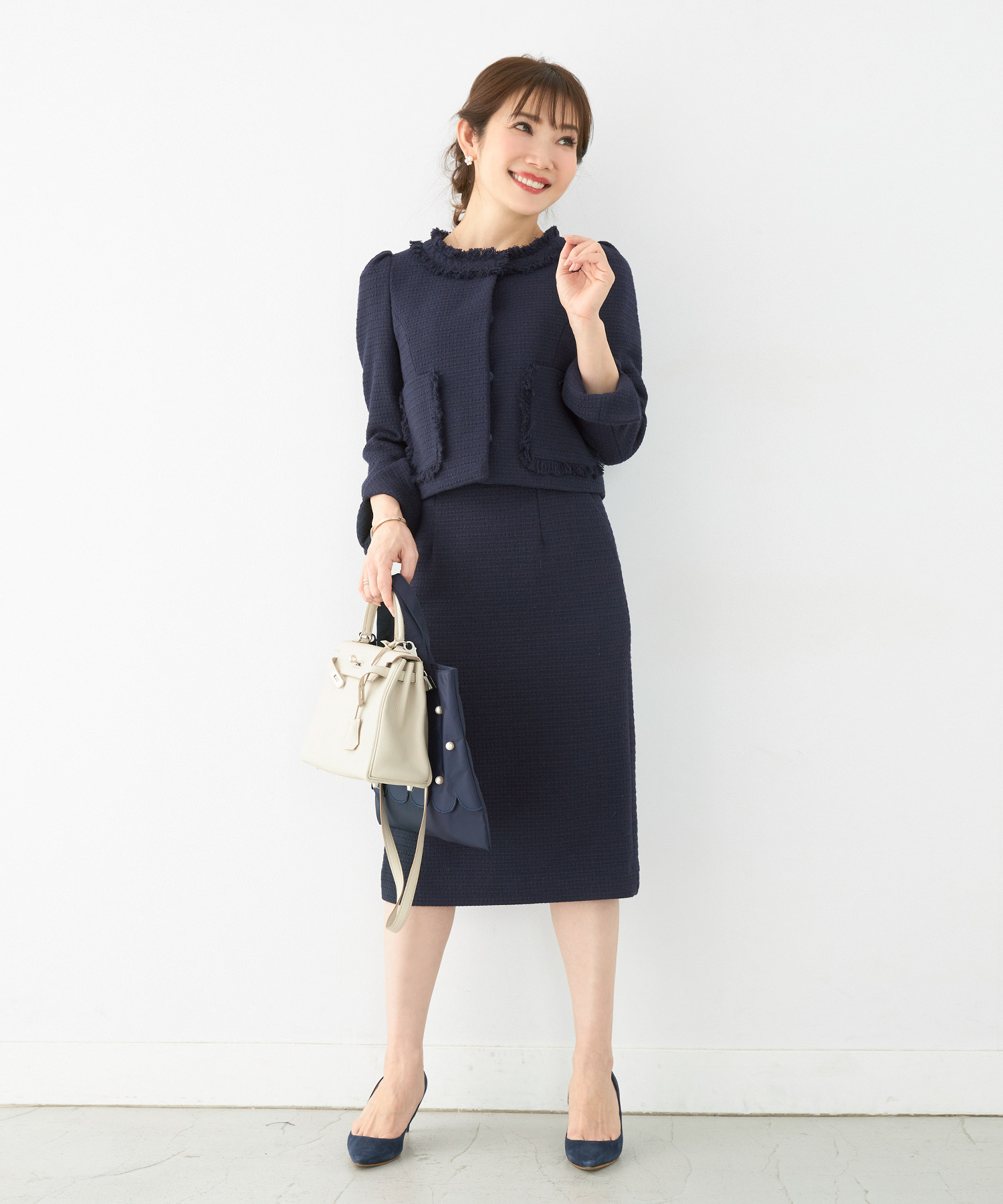 卒業式の母親コーデにぴったりな「無地ツイード タイトスカート」。ミモレ丈の美しいシルエットと立体感のあるツイード素材が、上品さと華やかさを演出します。セットアップはもちろん、ブラウスやニットとの着回しも楽しめる万能アイテムです。