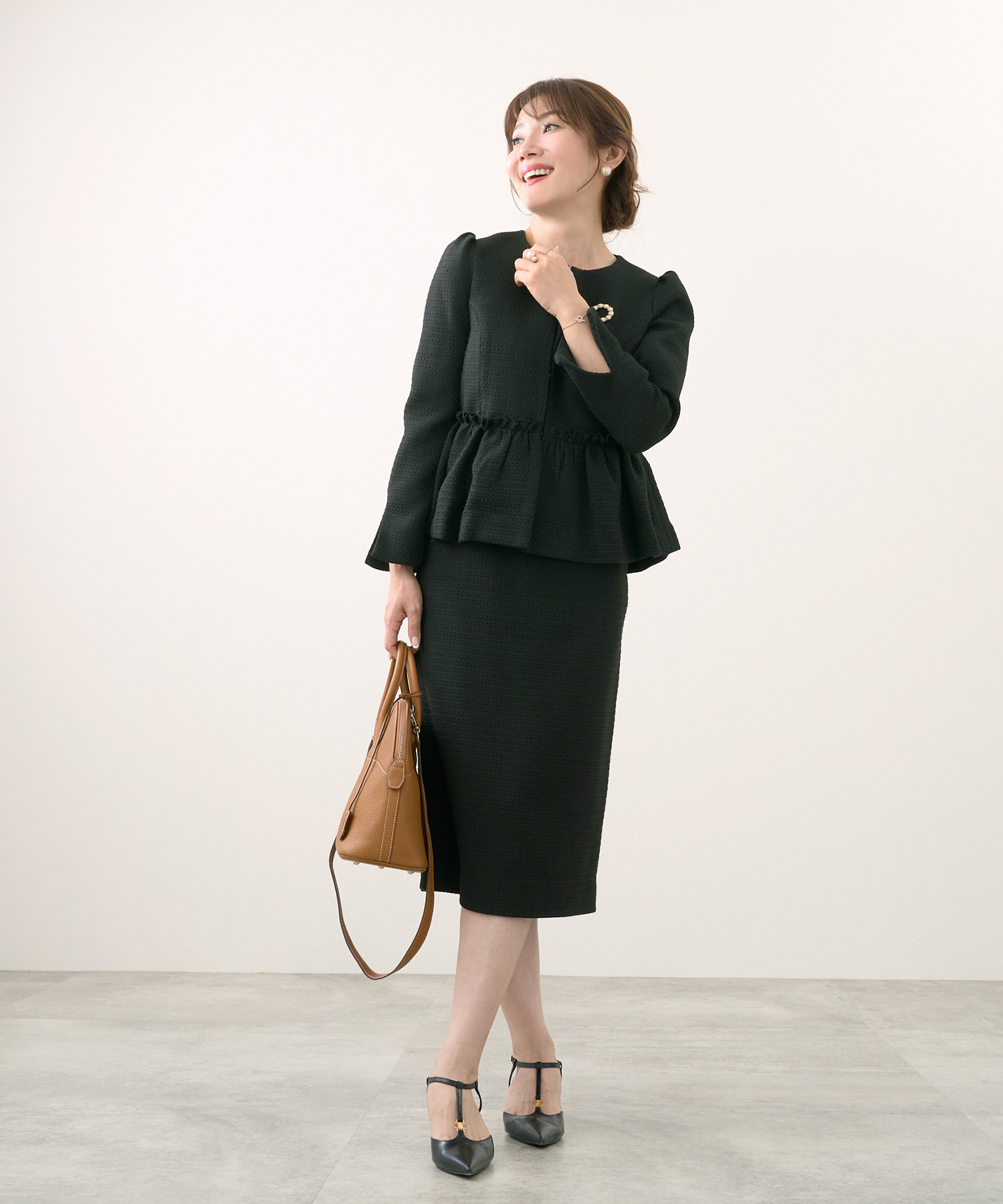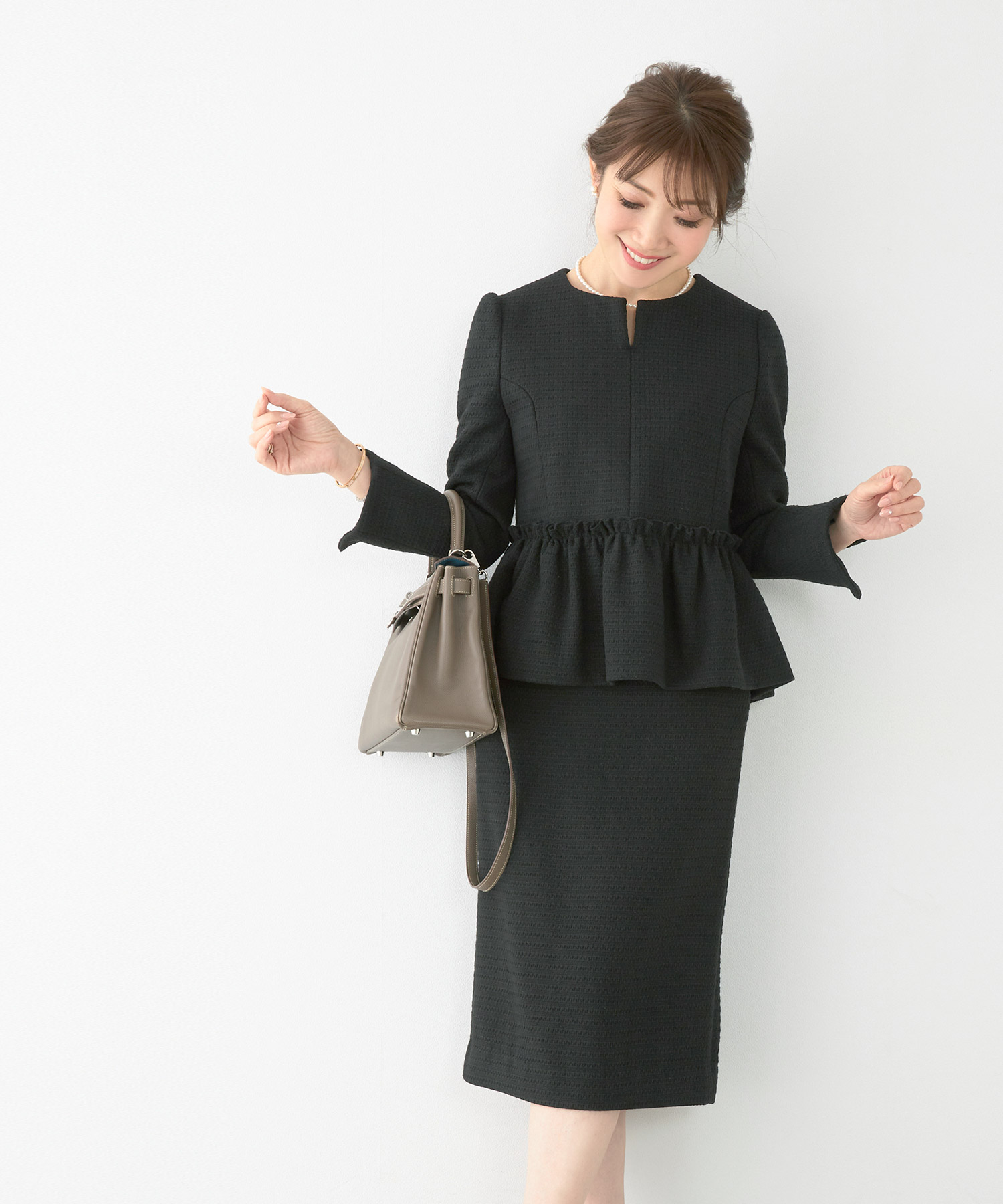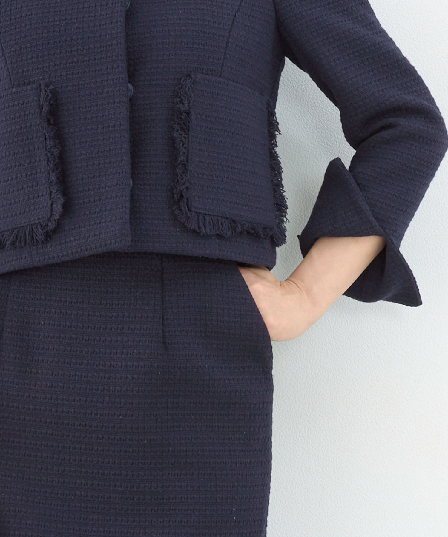 卒業式の母親コーデにぴったりな「無地ツイード タイトスカート」。ミモレ丈の美しいシルエットと立体感のあるツイード素材が、上品さと華やかさを演出します。セットアップはもちろん、ブラウスやニットとの着回しも楽しめる万能アイテムです。