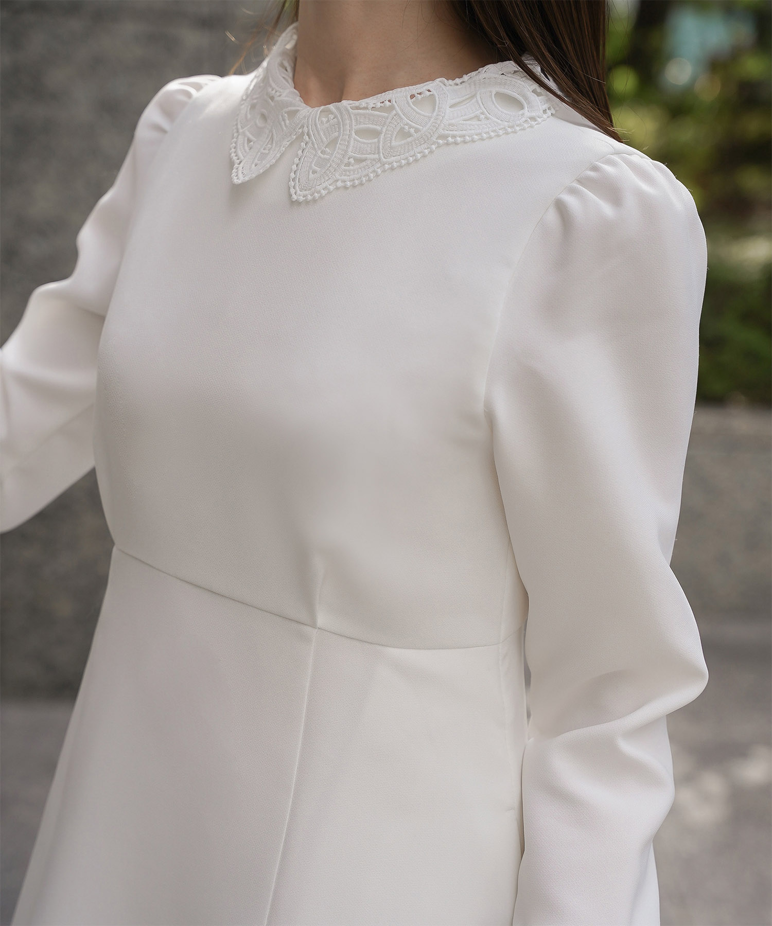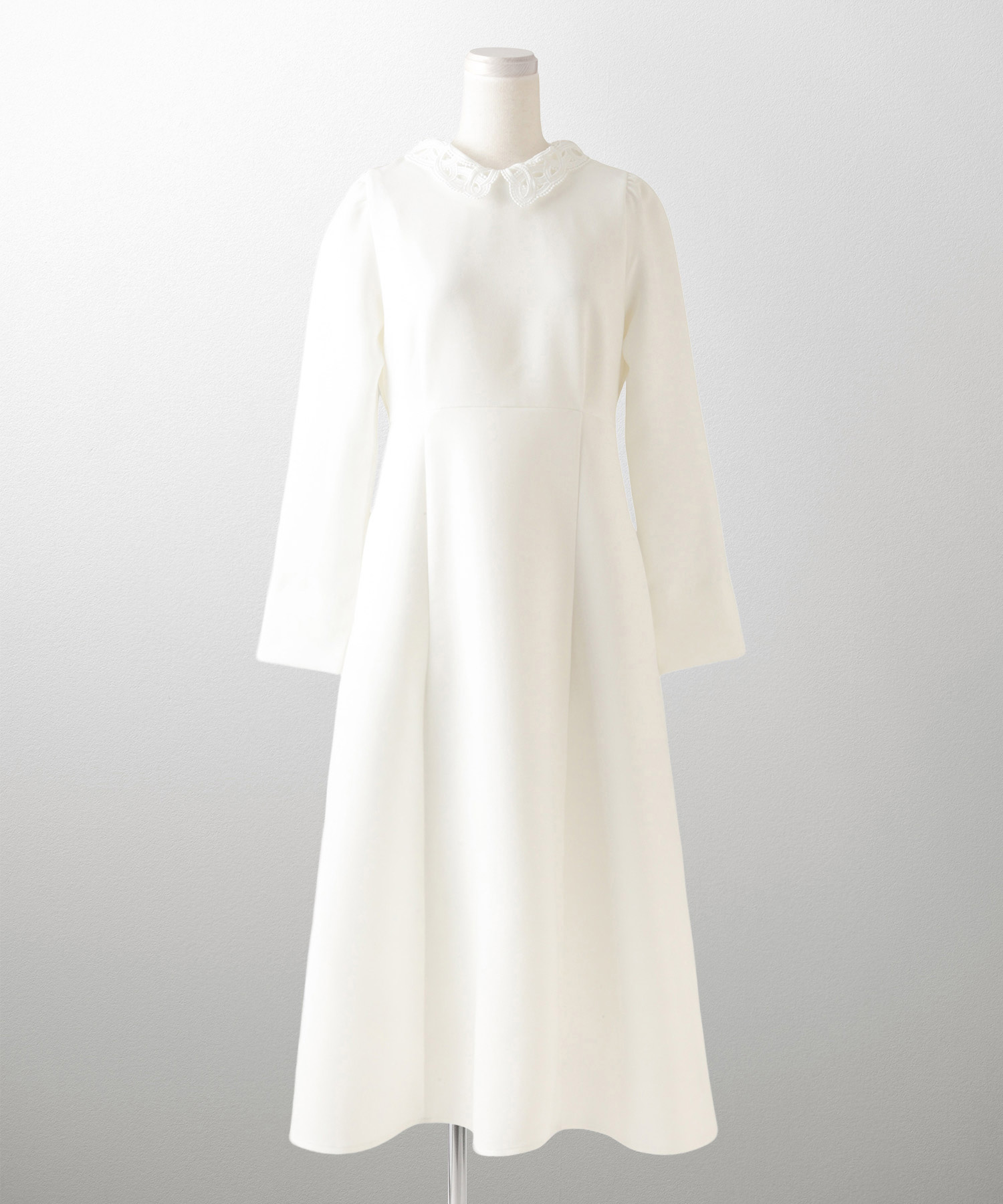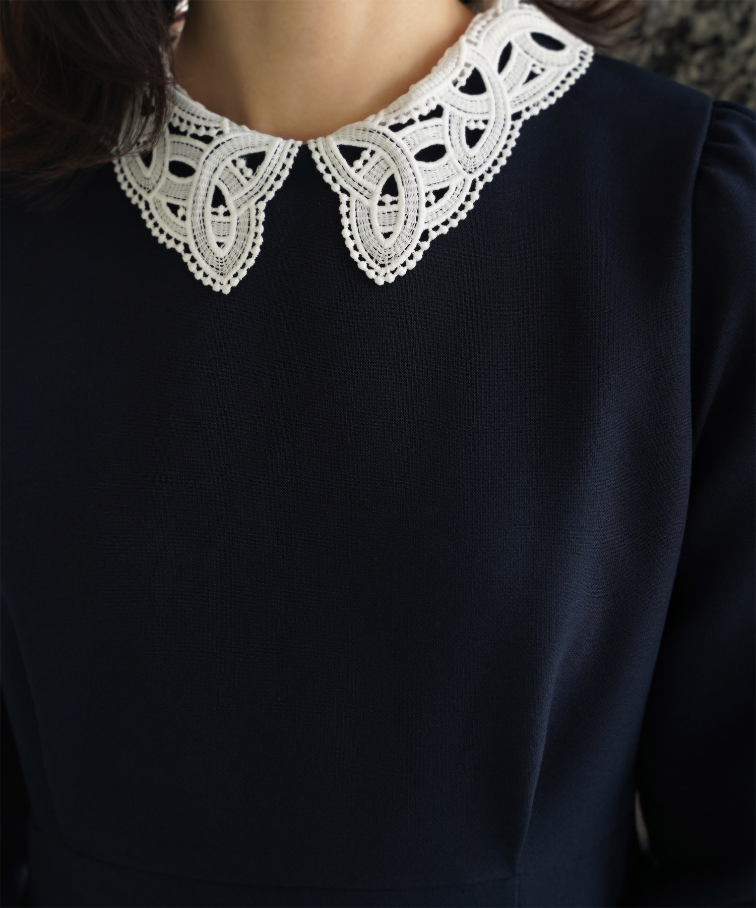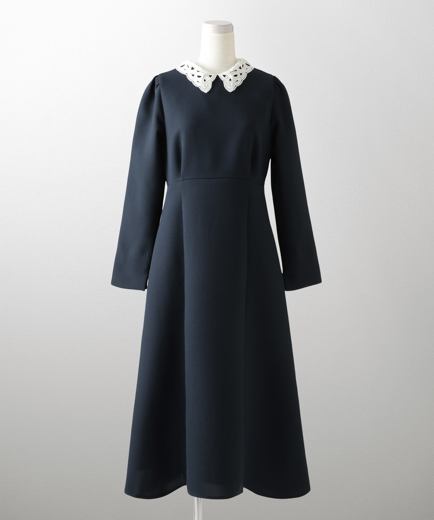 フェミニンなレース襟をあしらったワンピース。ウエストはタックを入れて緩やかにシェイプし、メリハリのある美しいシルエットに仕上げました。