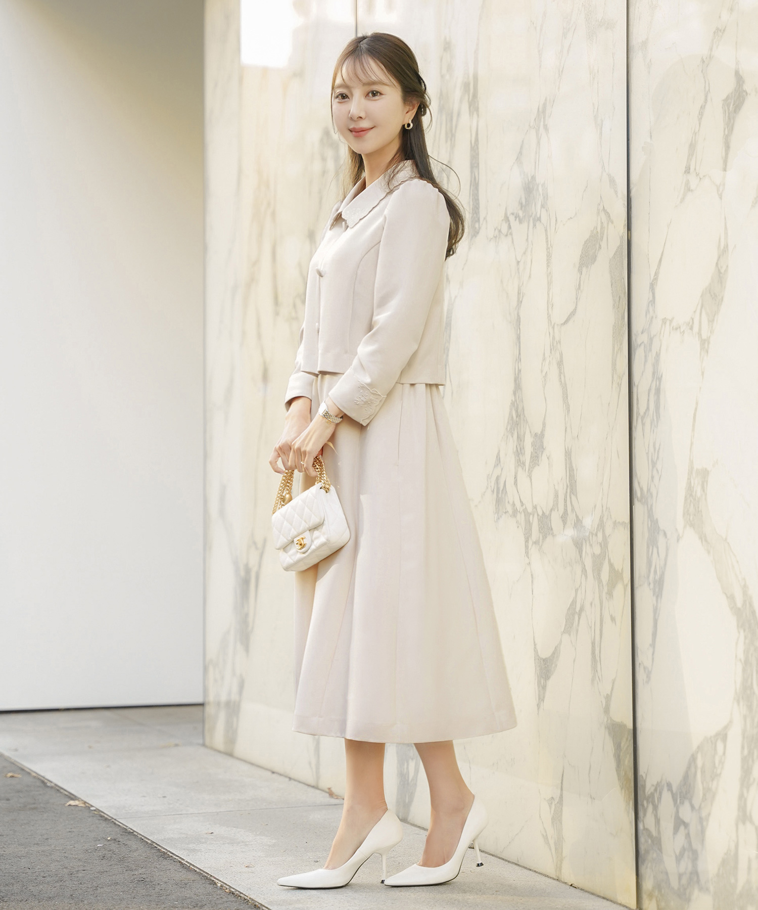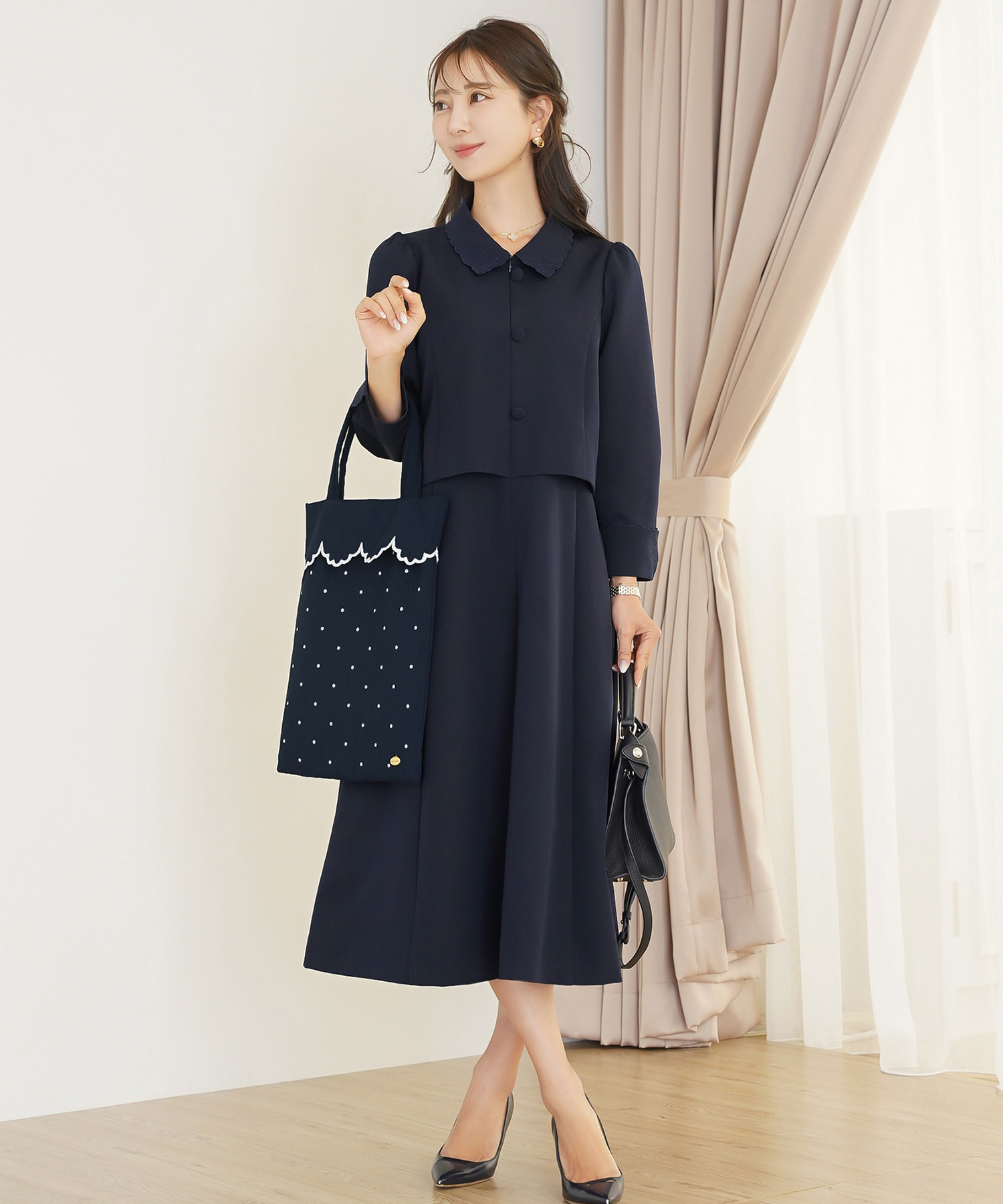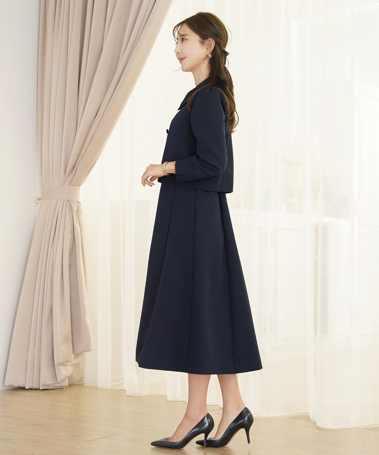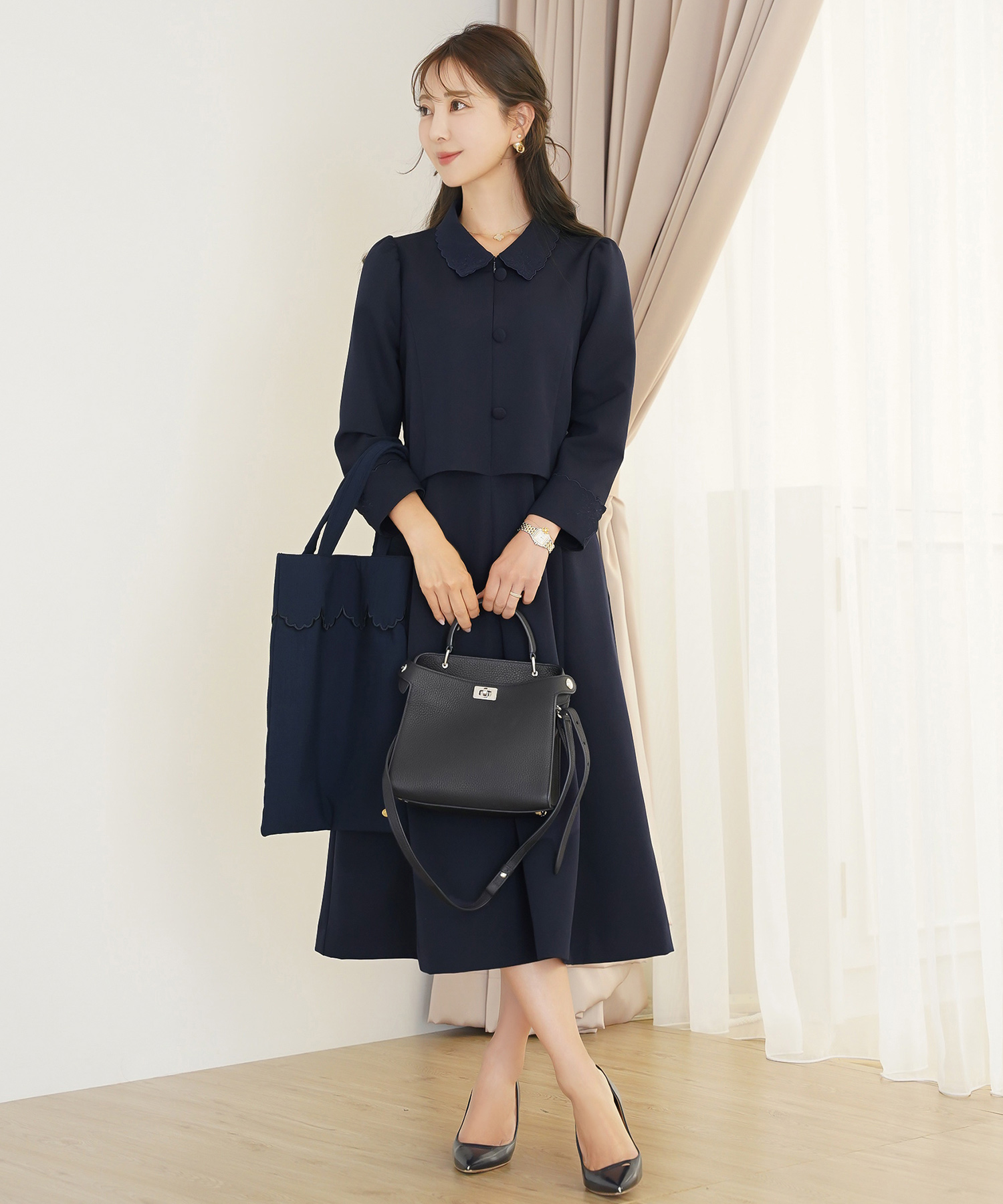 ジャケットとスカートを合わせたような、セットアップ風ワンピース。甘さを抑えたデザインで、きちんと感のある装いが一枚で完成します。フロントファスナー仕様のため、メイク後でも着替えやすく、授乳中の方にも使いやすいのが魅力。ウエストより高めの切り替えで、自然なスタイルアップも叶います。