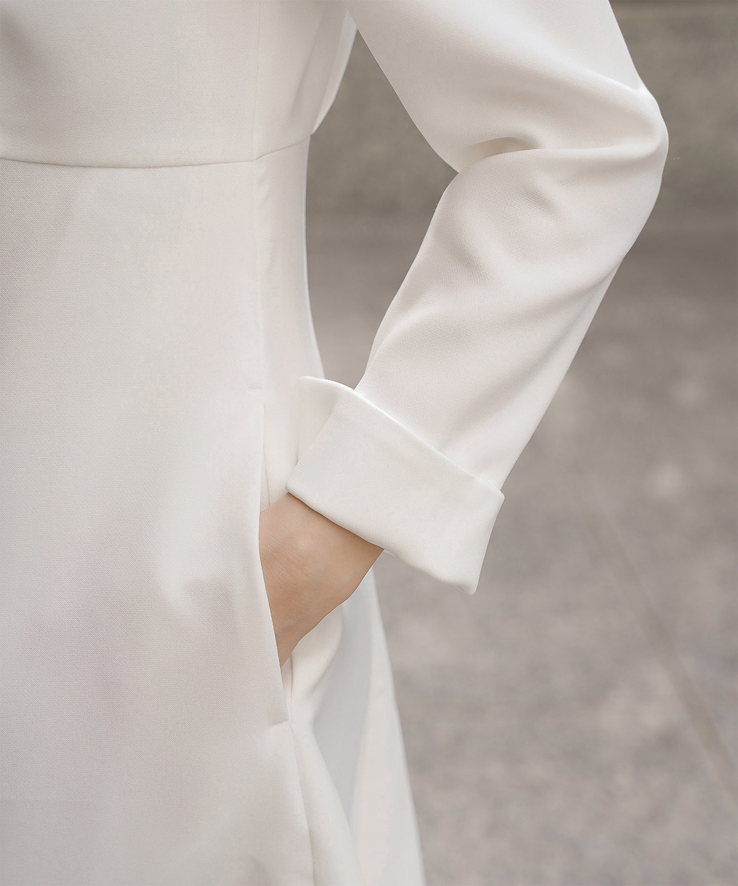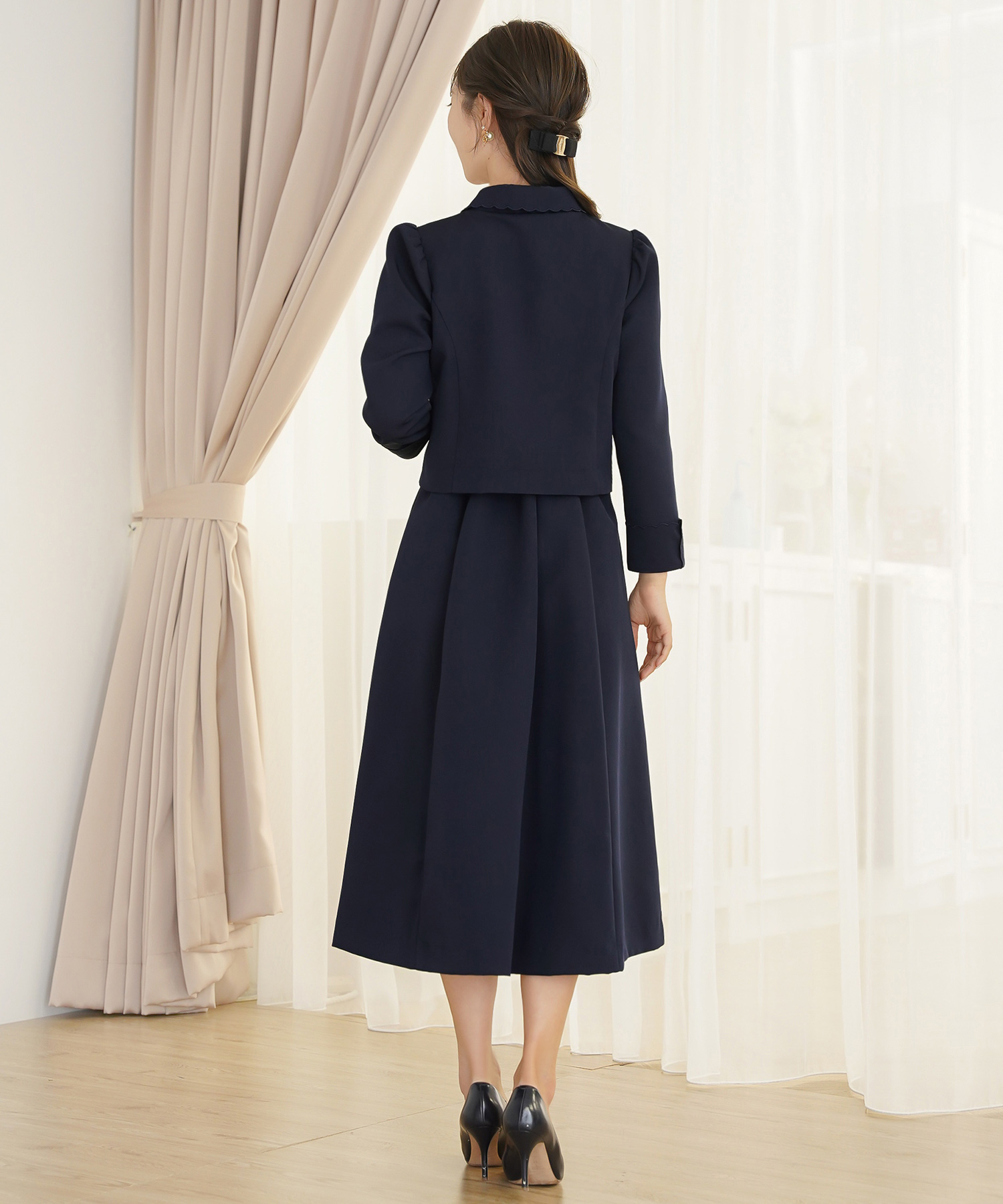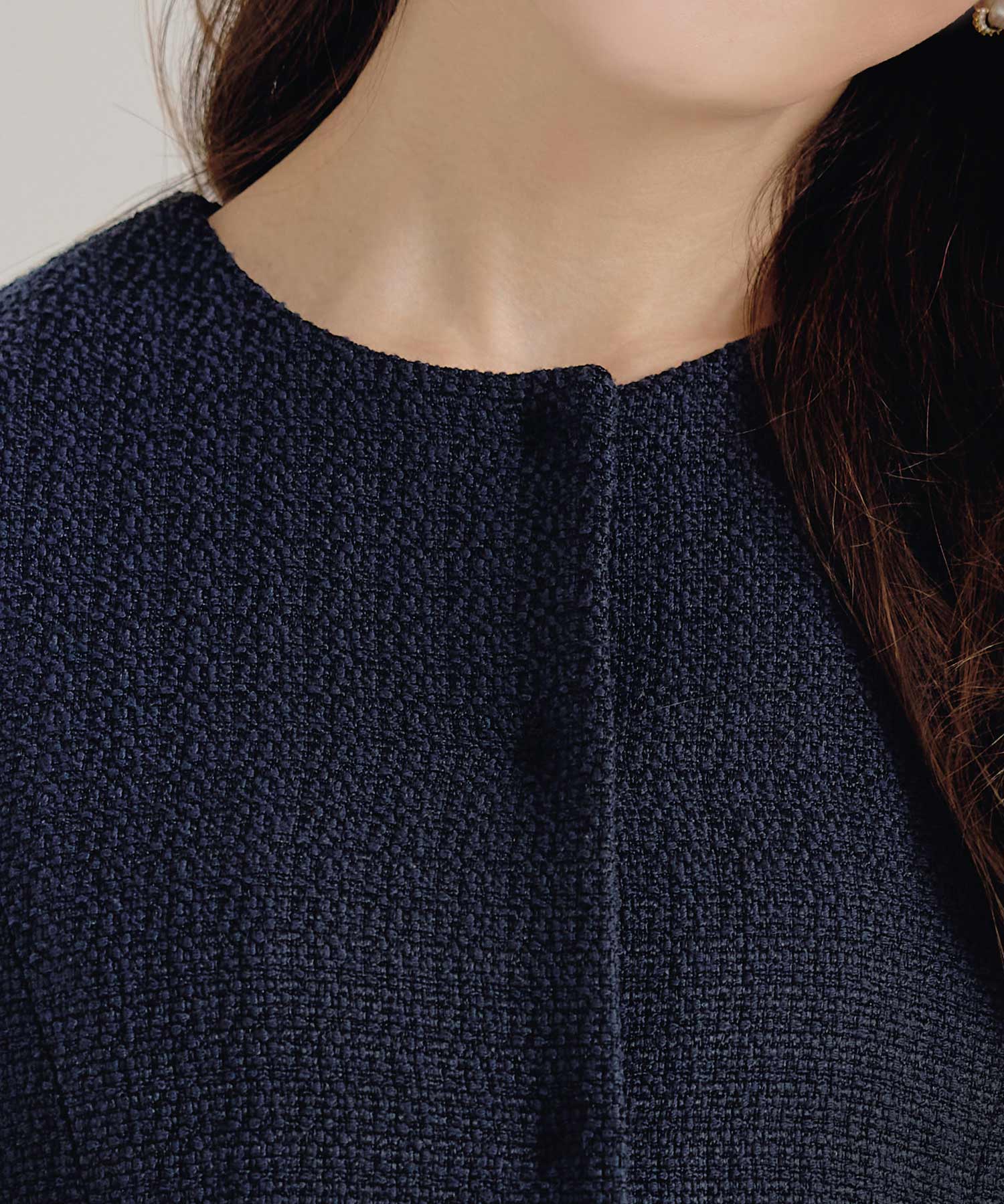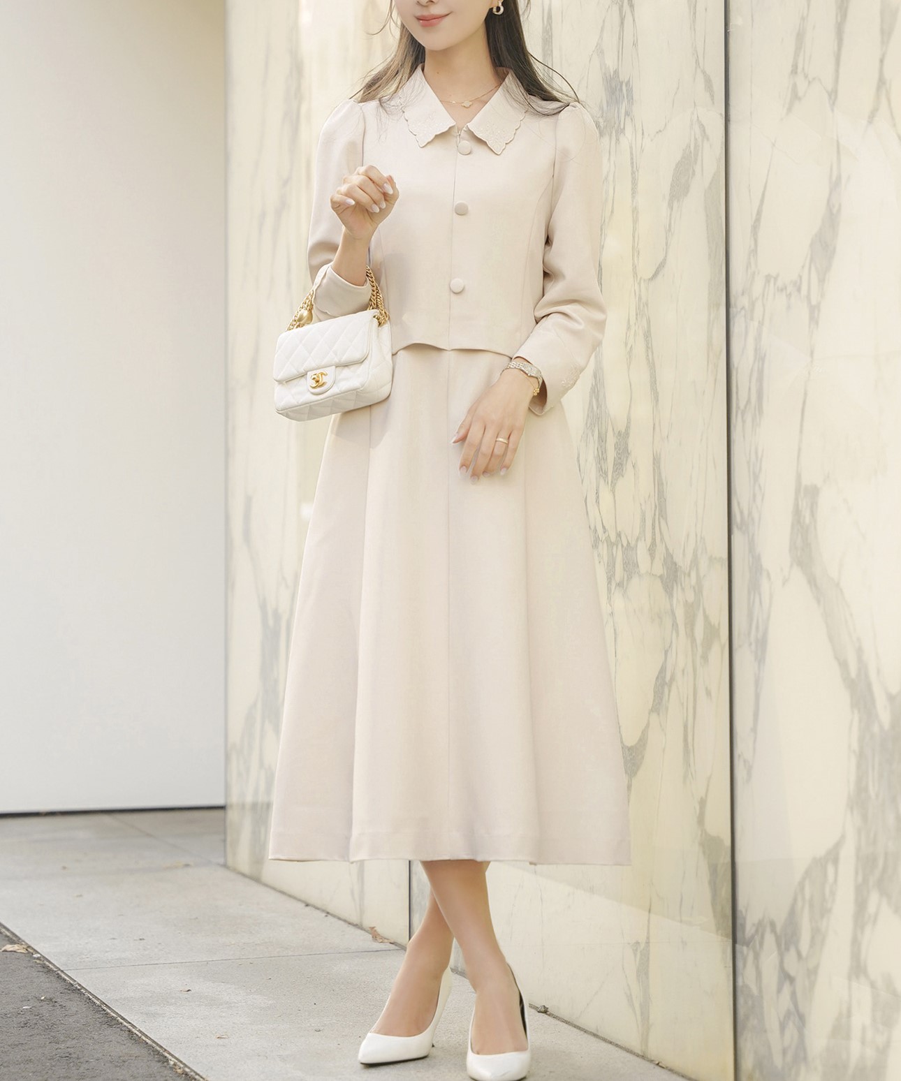 ジャケットとスカートを合わせたような、セットアップ風ワンピース。甘さを抑えたデザインで、きちんと感のある装いが一枚で完成します。フロントファスナー仕様のため、メイク後でも着替えやすく、授乳中の方にも使いやすいのが魅力。ウエストより高めの切り替えで、自然なスタイルアップも叶います。