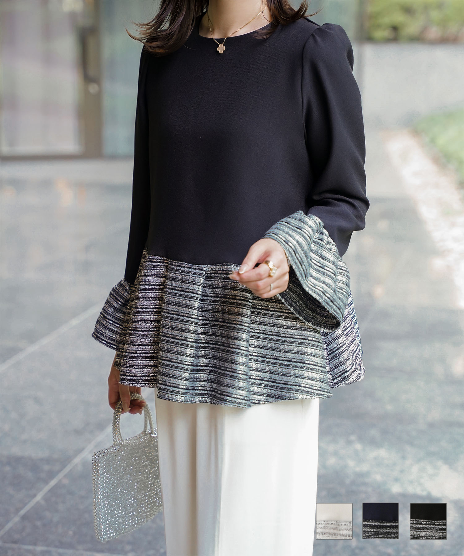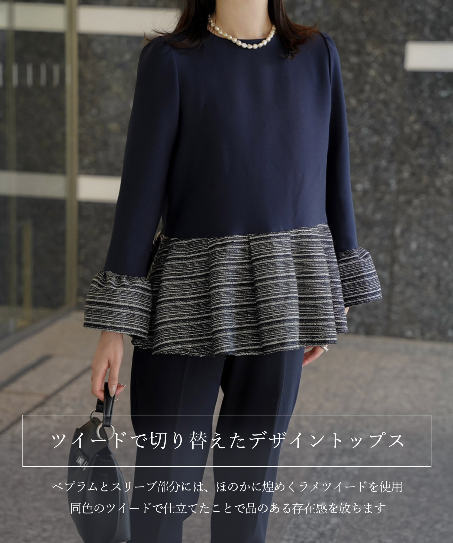 上品なブラウスを、ラメツイードで切り替えたデザイントップス。ペプラムとスリーブに同色ツイードをあしらい、控えめなきらめきで品よく華やぎます。立体的なペプラムが体型をさりげなくカバーし、フレアスリーブがエレガントな印象に。さらっとしたポリエステル素材で着心地も快適。オフィスから学校行事、オケージョンまで活躍します。