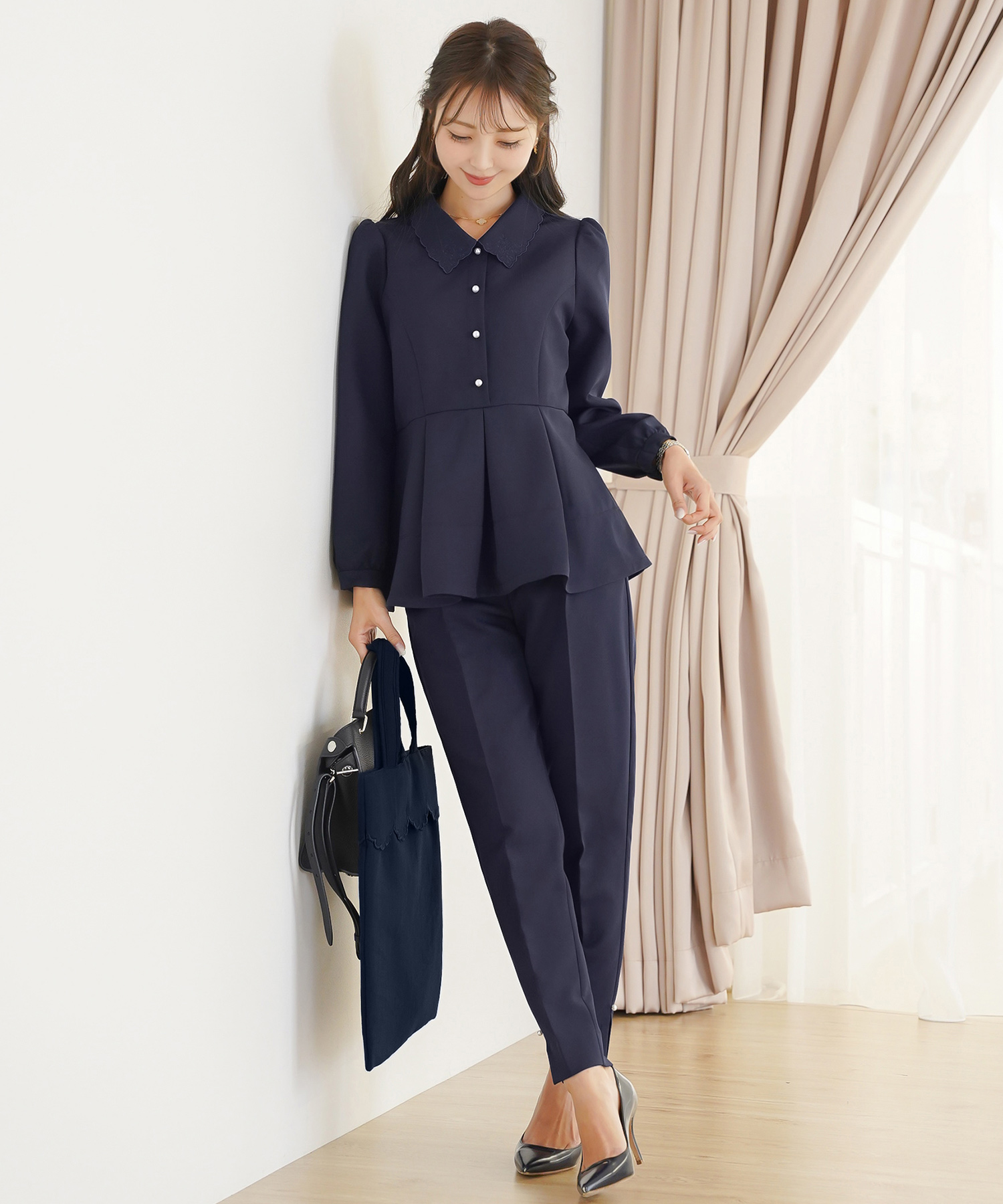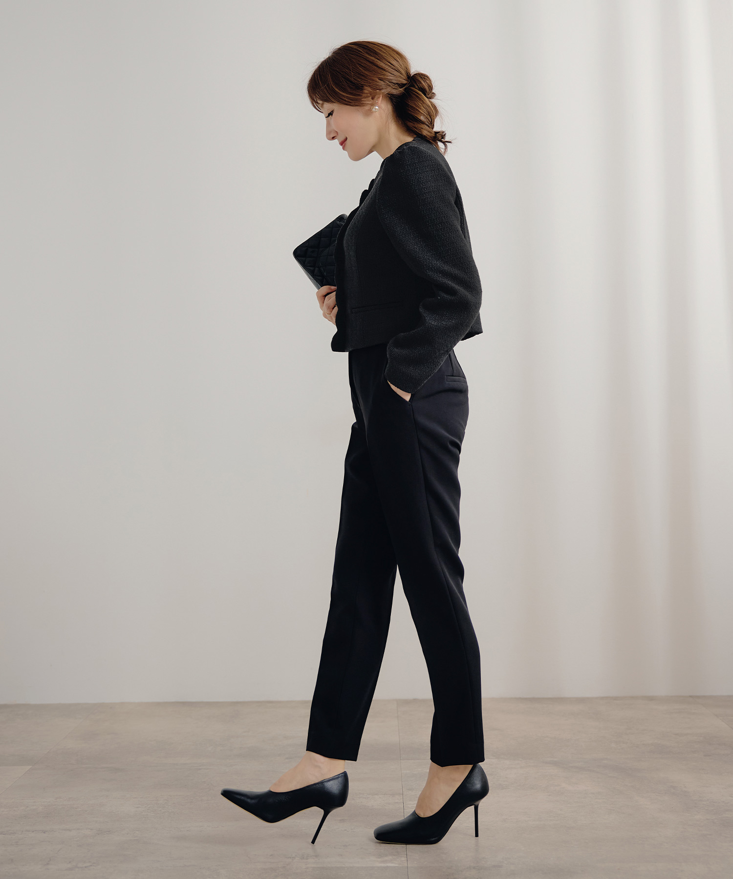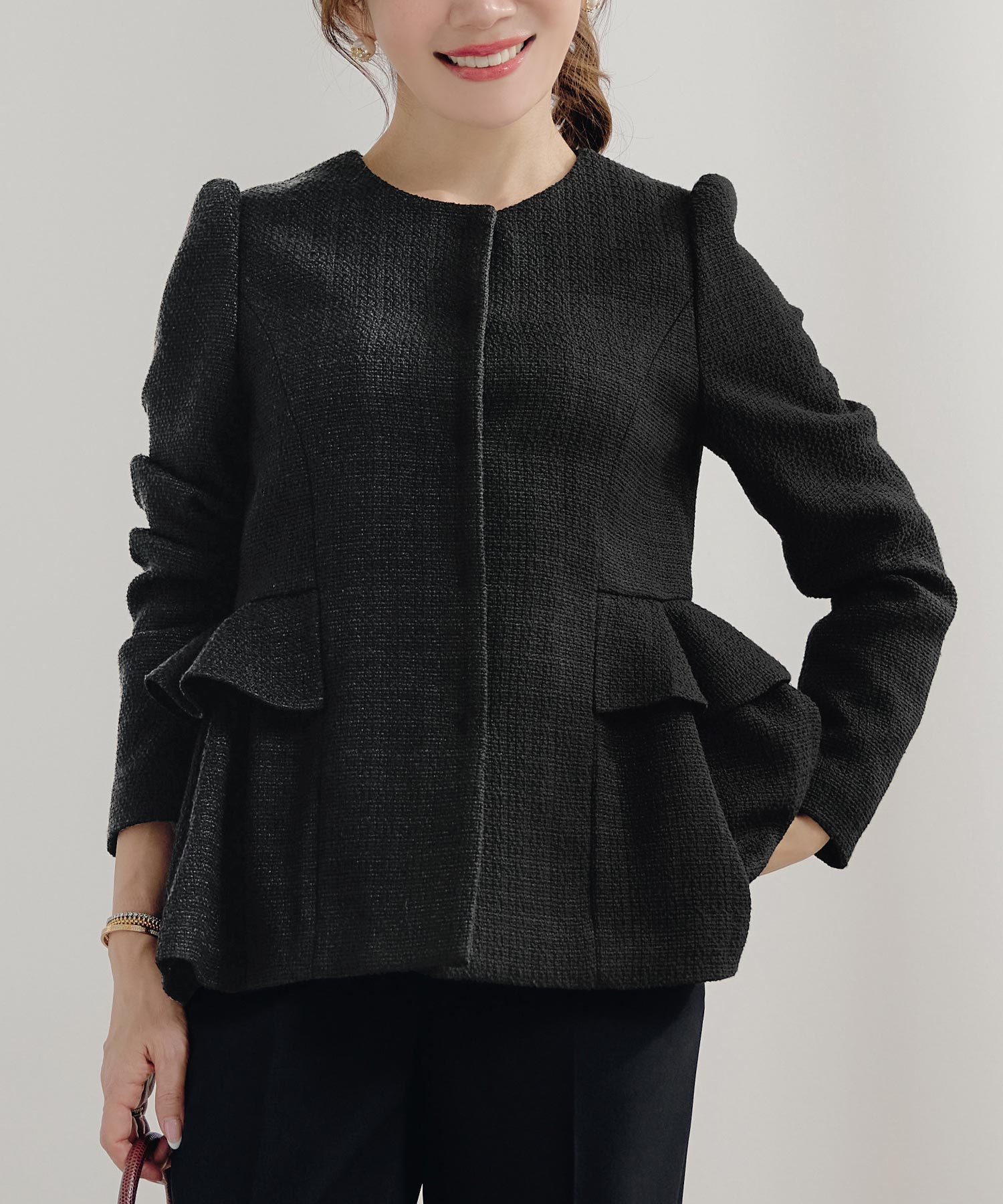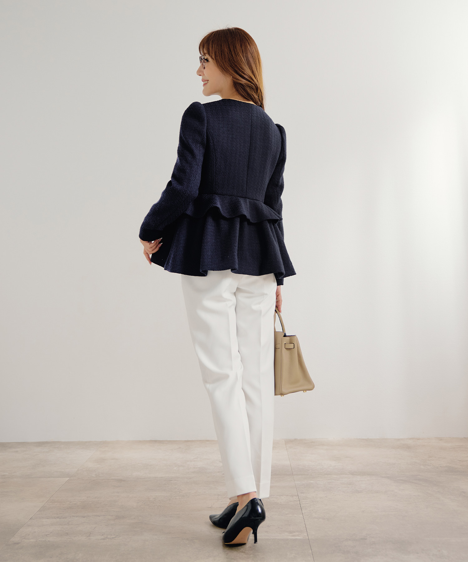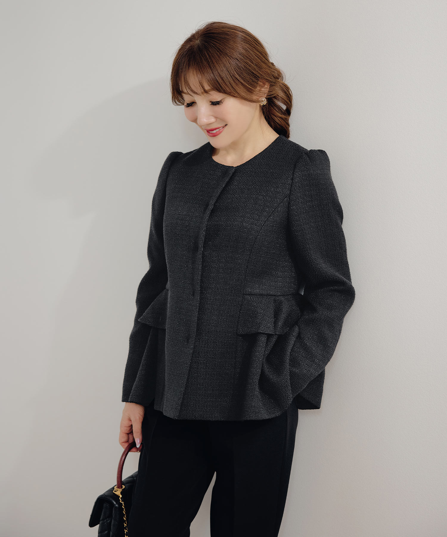 ペプラムシルエットが美しいジャケット。気になるお腹まわりをさりげなくカバーしながら、オケージョンスタイルを上品に格上げします。ウエスト位置より高めに切り替えを入れているため、羽織るだけで脚長見えが叶うのも嬉しいポイントです。