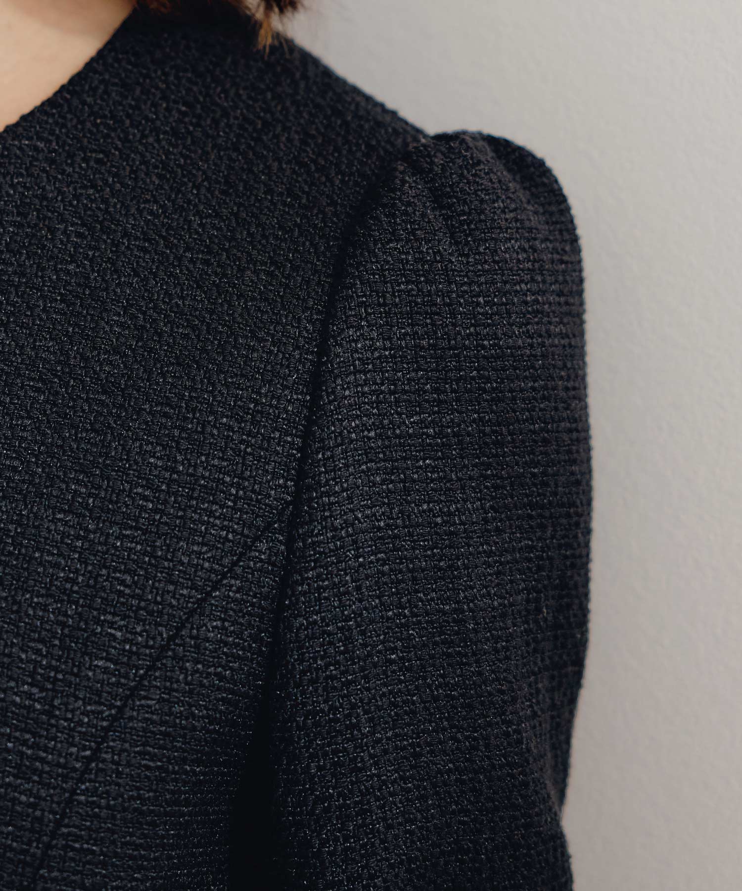 スパンコールが華やかにきらめくツイードトップス。レース襟と控えめなパフスリーブで、顔まわりに品のある華やかさを添えます。やや長め丈と裾のフレアラインでヒップまわりをさりげなくカバー。袖まで裏地付きで、肌当たりにも配慮しました。