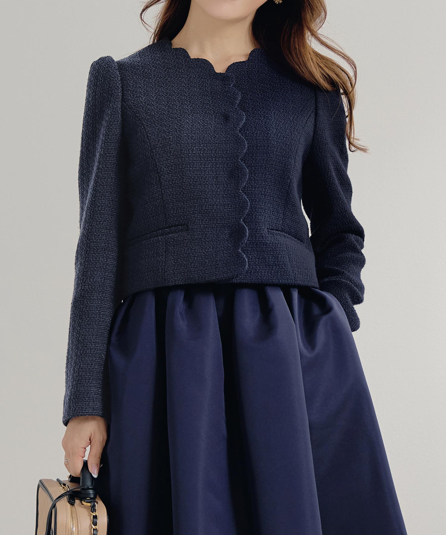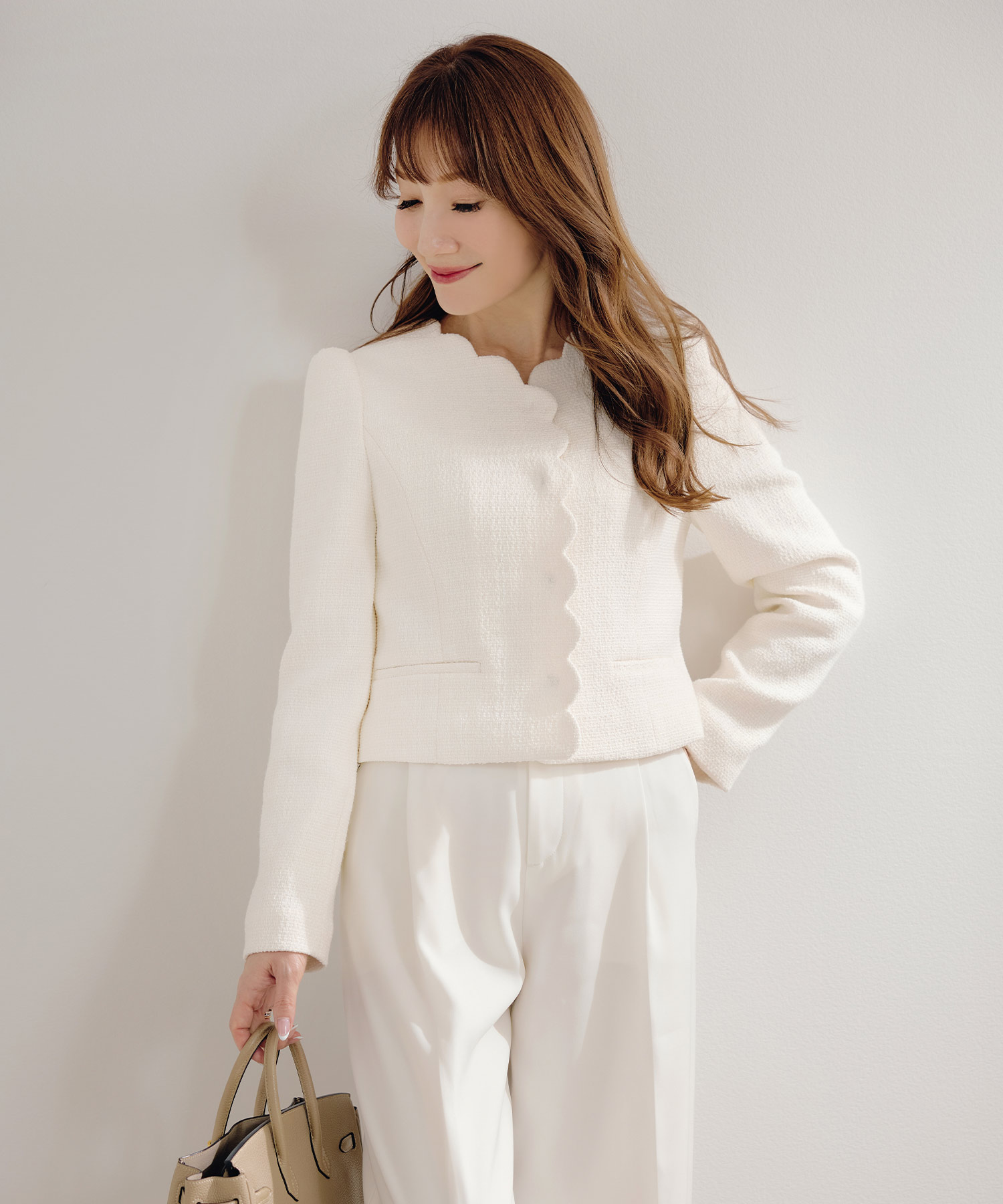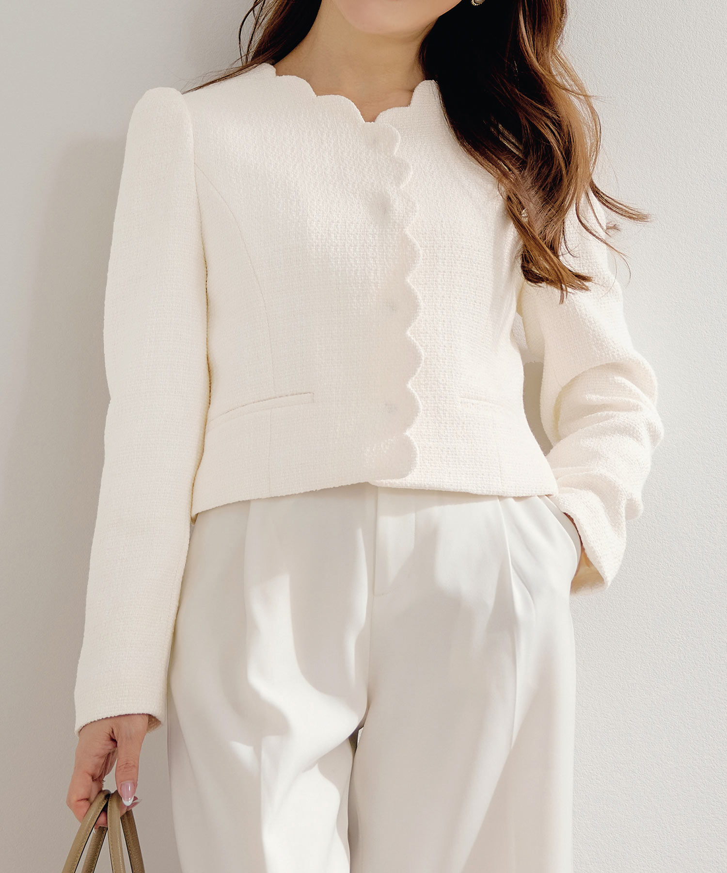 スカラップデザインが目を引くショートジャケット。きちんと感がありながら、女性らしい柔らかさも感じられる一着です。ショート丈なので、ロングスカートにもパンツにも好相性。上品なツイード素材が、装い全体をさりげなく格上げします。