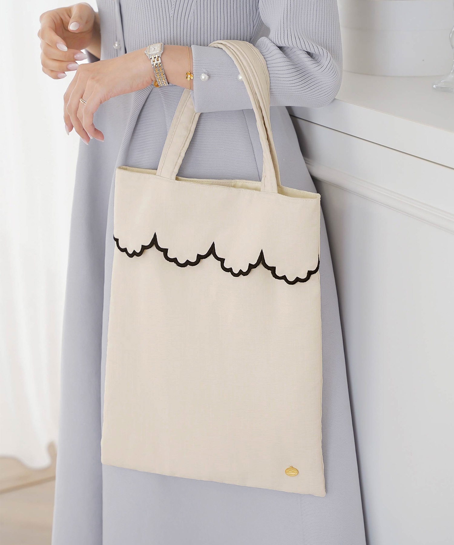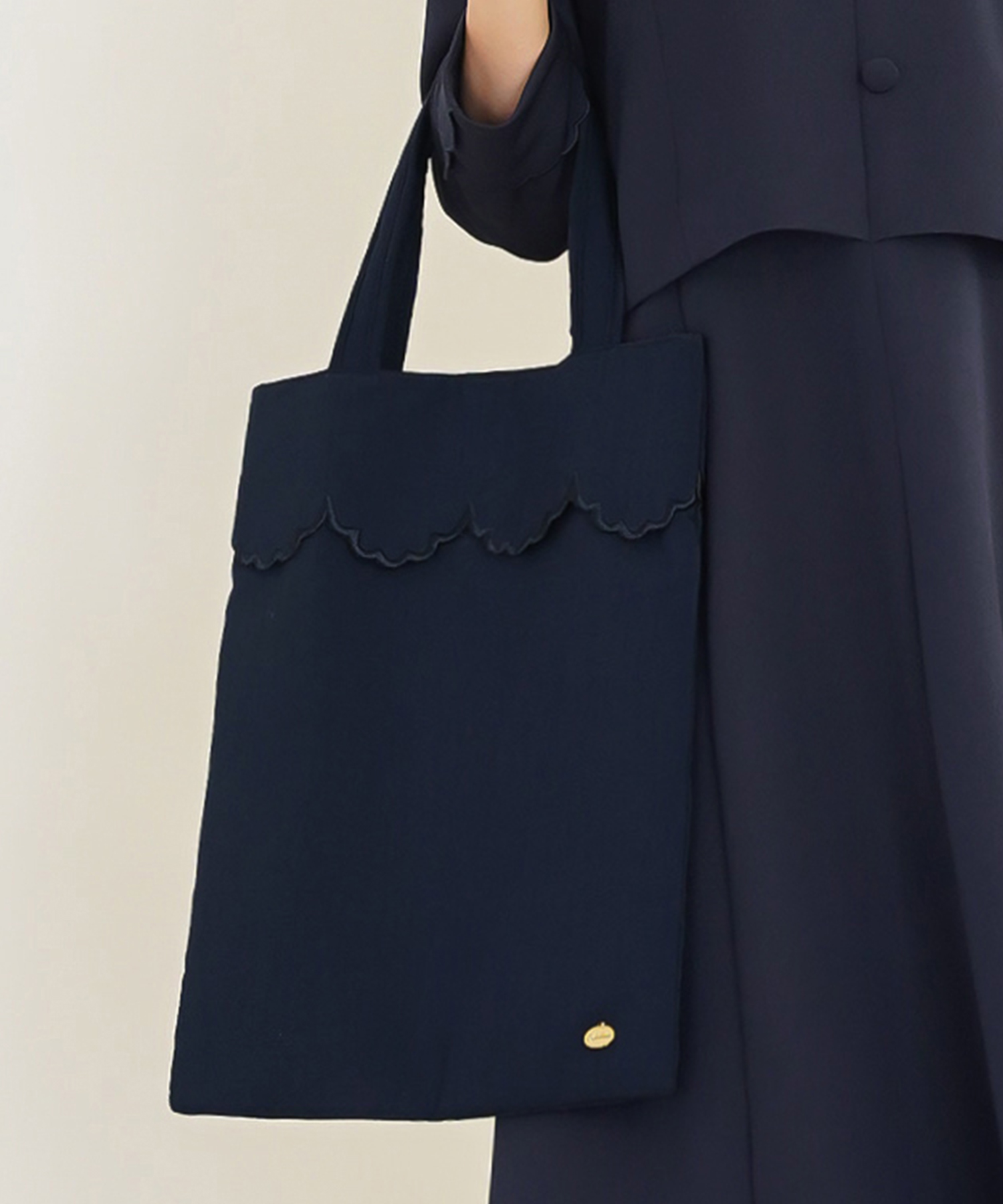 A4サイズのファイルや14インチのPCが収まる縦型トートバッグ。すっきりとしたシルエットにスカラップ刺繍を施し、シンプルながらも女性らしい華やかさをプラスしました。サブバッグとしても活躍します。