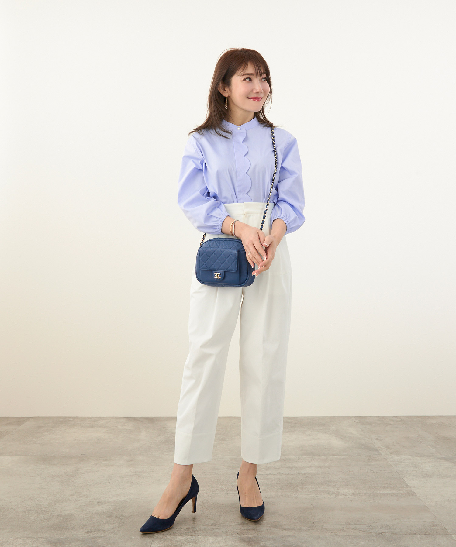 新社会人にぴったりの爽やかなサックスブルーのブラウス。スタンドカラーのシャツのようにかっちりと見せつつ、前立てはスカラップになっているので女性らしさを演出します。さらに、一番上のボタンだけパールになっているところもポイント。ネックレスがなくてもパールの艶で顔周りに華を添えてくれます。小物はネイビーカラーのアイテムで全体を引き締めて。
